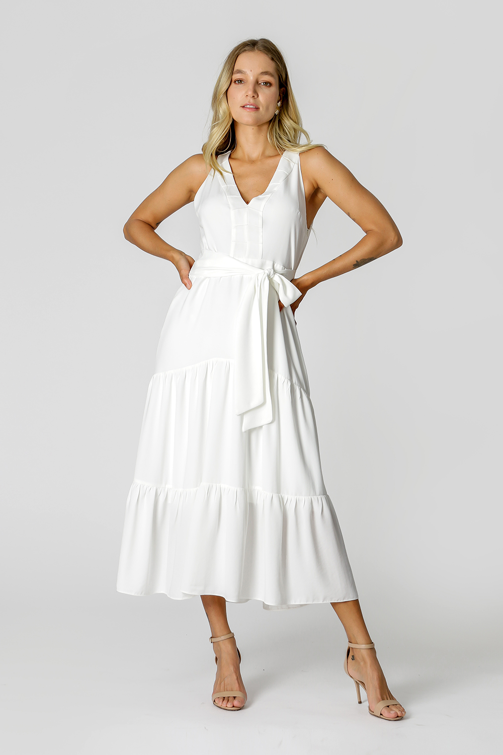 Vestido escote pico y detalle acanalado. Largo midi con dobladillo. Tiene cremallera lateral invisible, forro y tira para atar. Pieza casual que tiene ese estilo elegante que nos encanta.