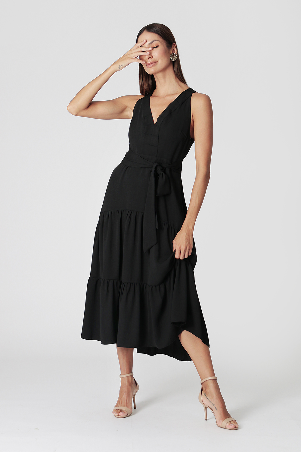 Vestido escote pico y detalle acanalado. Largo midi con dobladillo. Tiene cremallera lateral invisible, forro y tira para atar. Pieza casual que tiene ese estilo elegante que nos encanta.