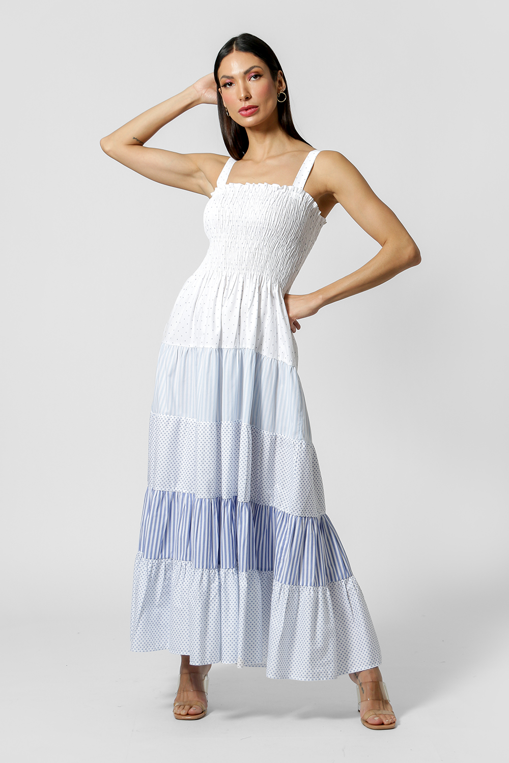 Vestido maría con cuerpo confeccionado en elástico y tirantes anchos. Pieza confeccionada con mezcla de popelinas estampadas. ¡Pieza fresca y fresca, perfecta para el verano!