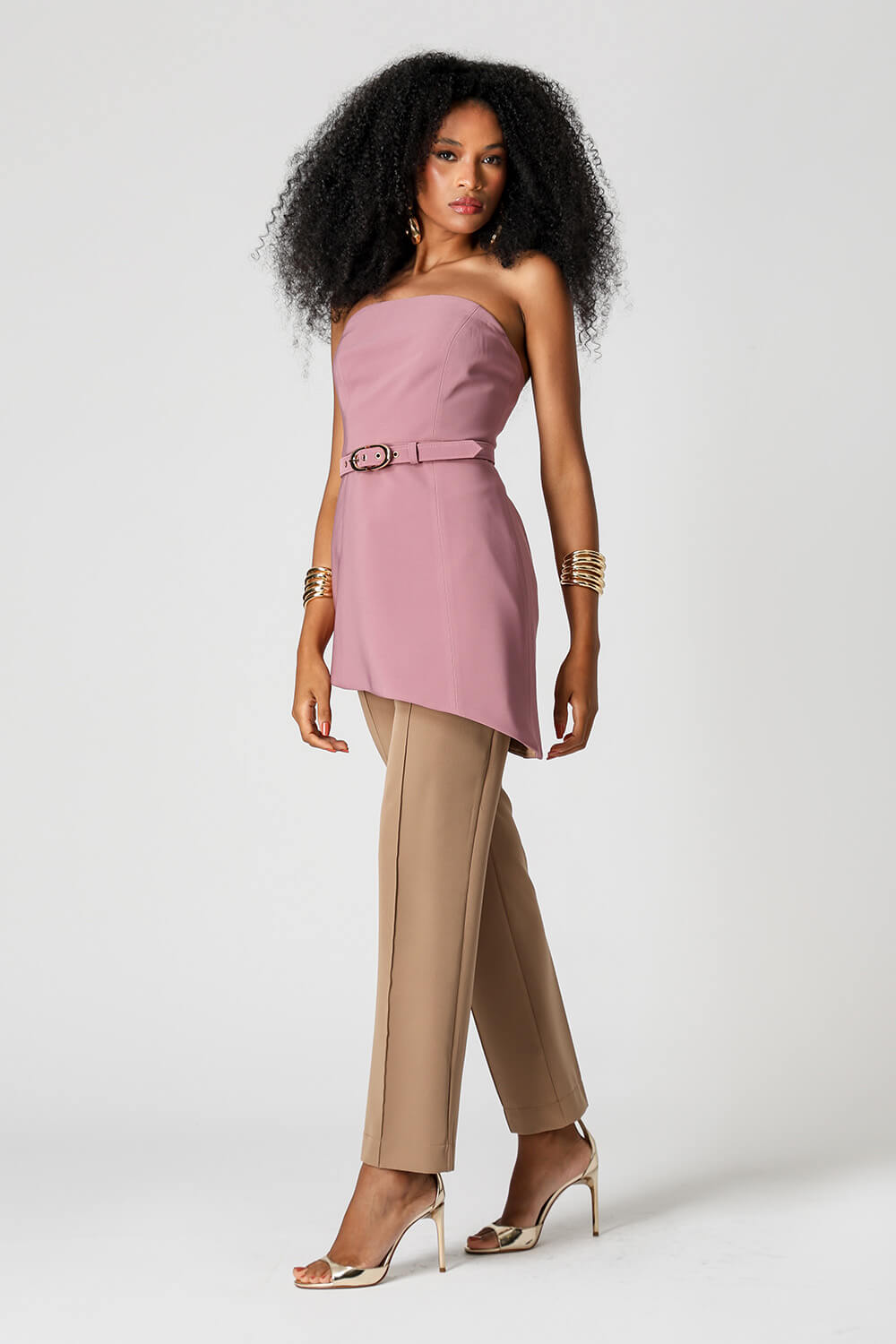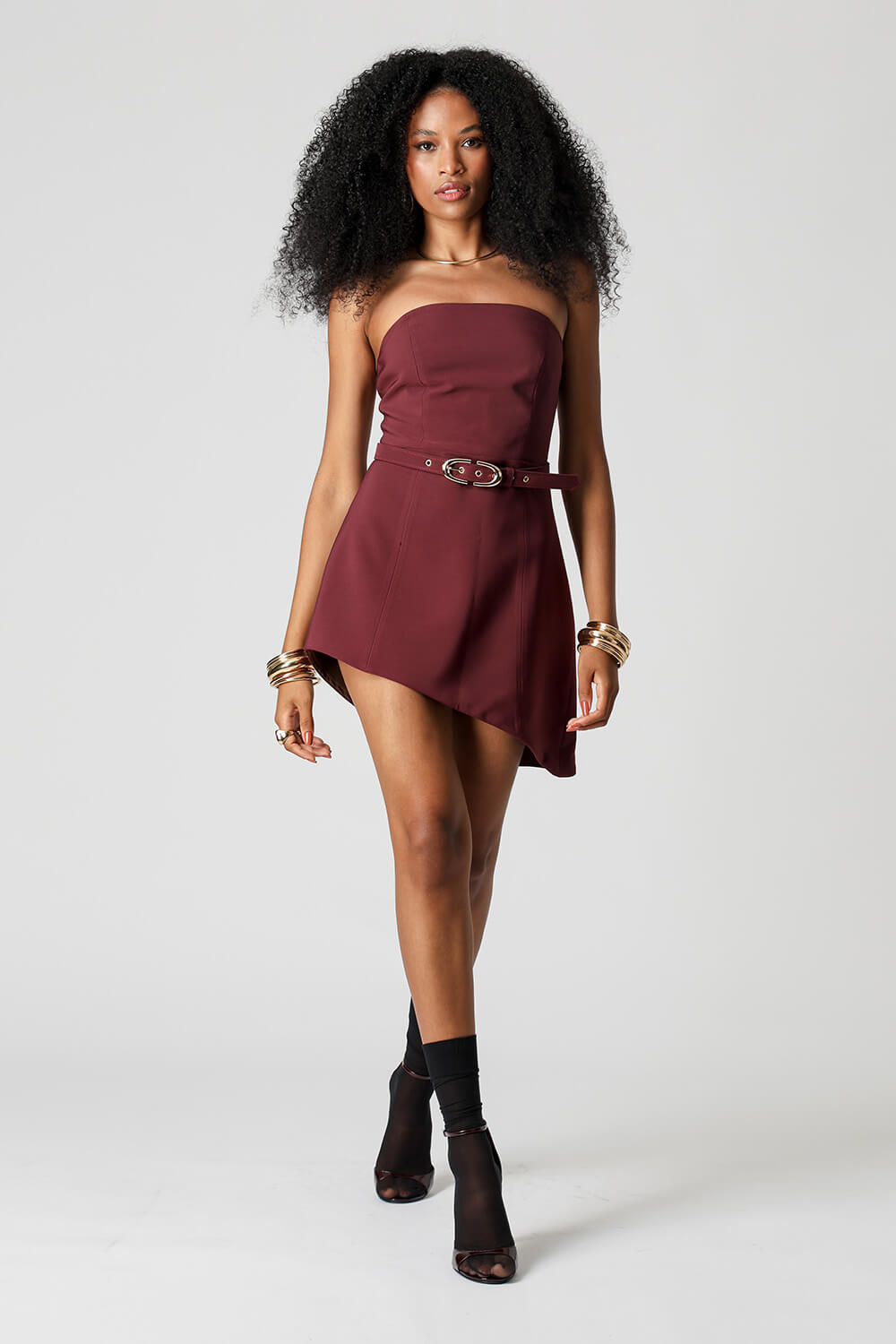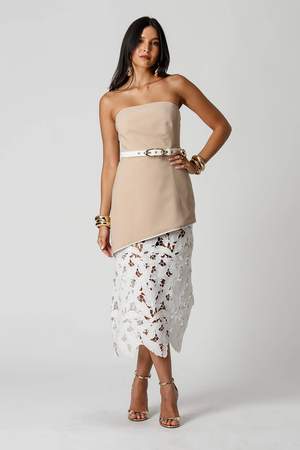 Vestido mini Strapless em tecido de alfaiataria, com design assimétrico, dupla face, cinto com fivela dourada e zíper de metal nas costas.