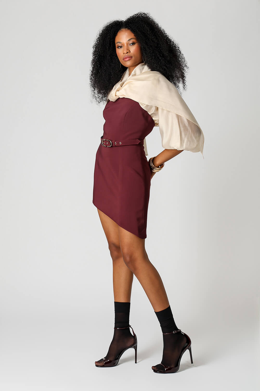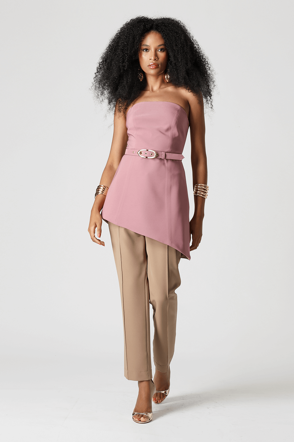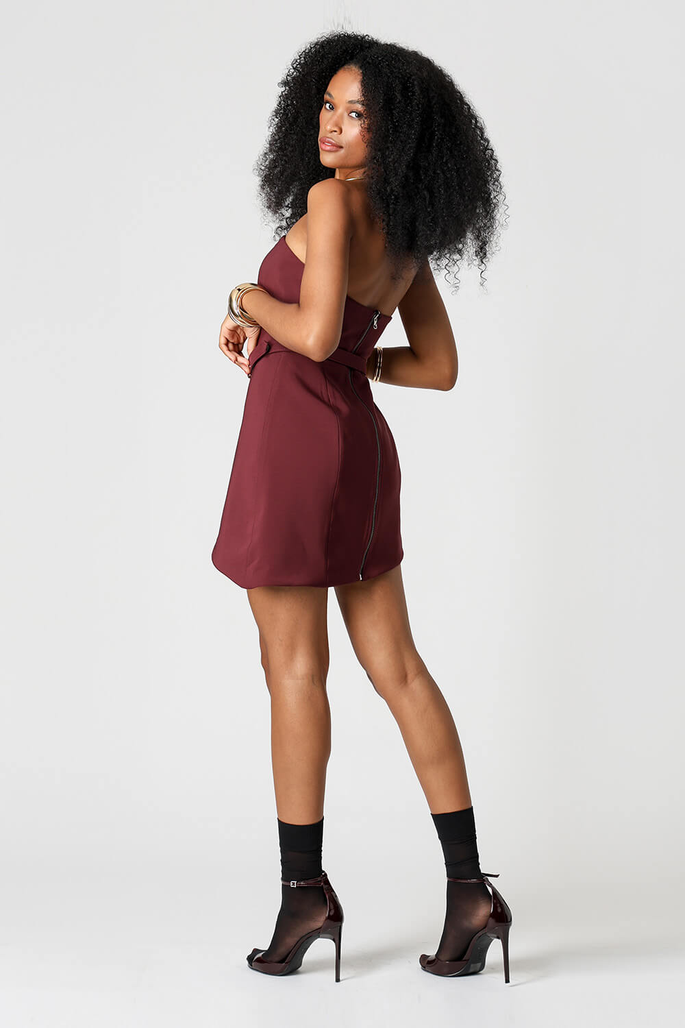 Vestido mini Strapless em tecido de alfaiataria, com design assimétrico, dupla face, cinto com fivela dourada e zíper de metal nas costas.