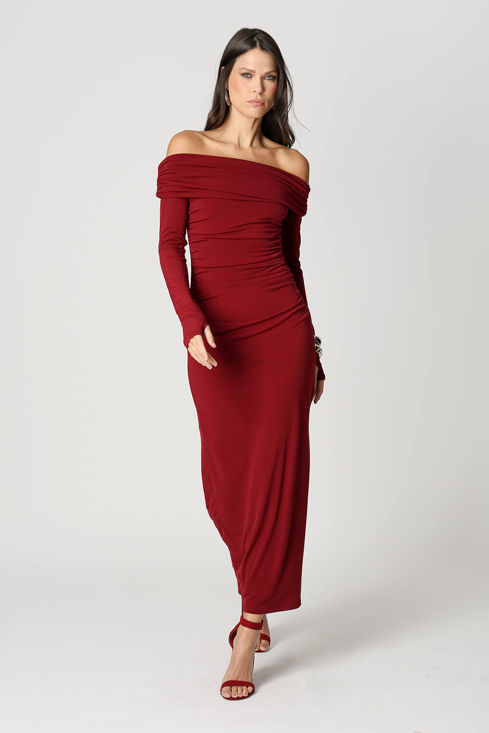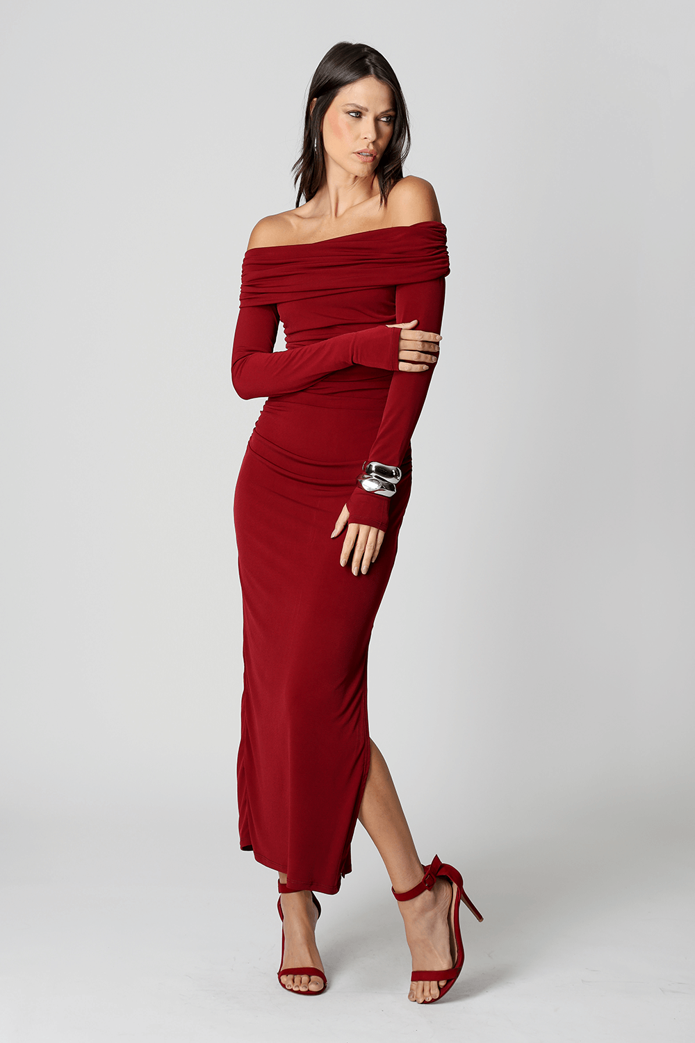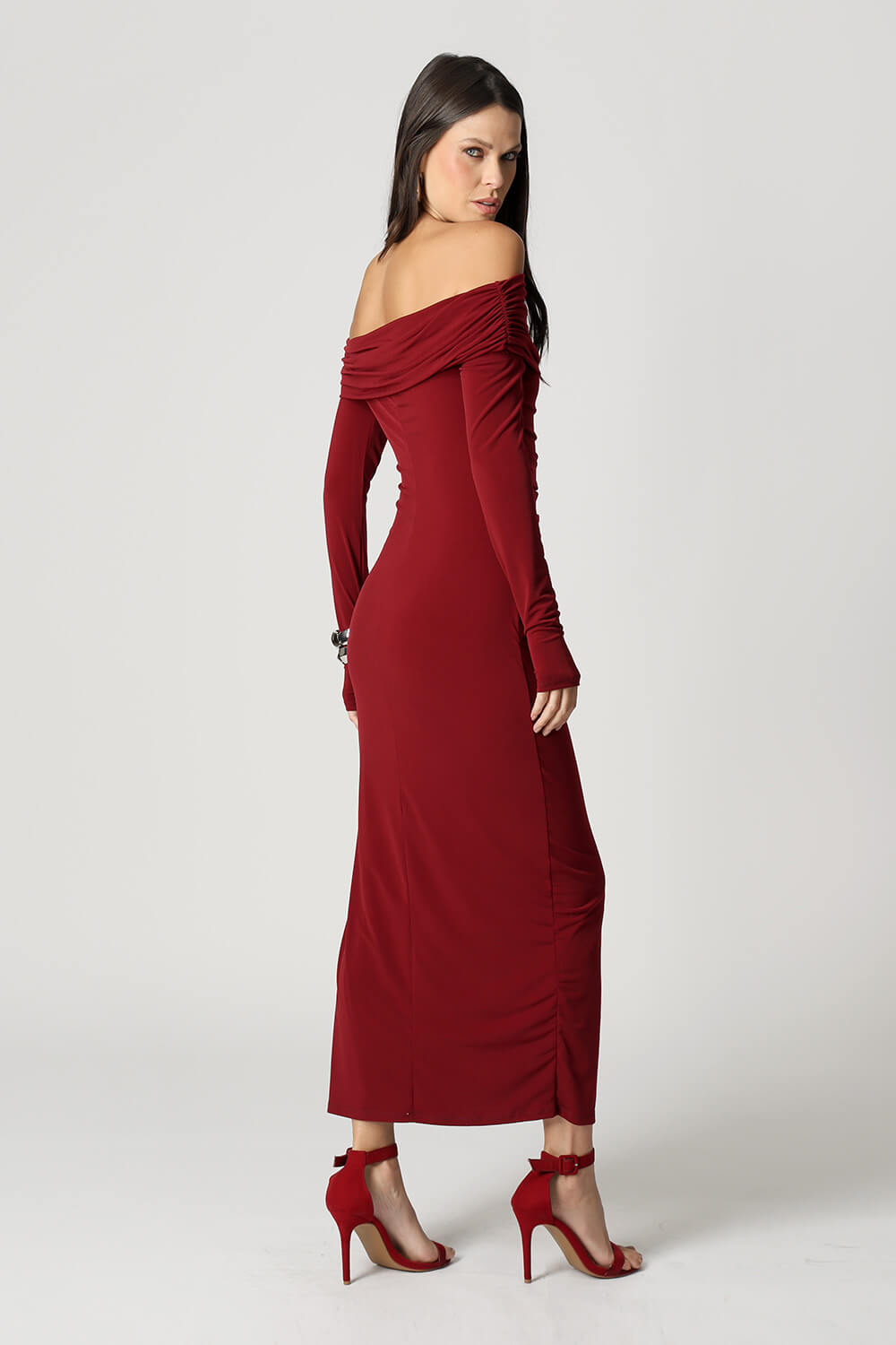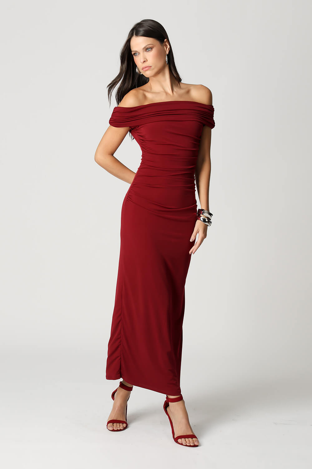 Elegante y versátil, este vestido con hombros descubiertos realza el busto con sofisticación. El drapeado del cuerpo asegura un ajuste impecable, mientras que la abertura lateral añade un toque sensual y moderno. Perfecto para fiestas y eventos especiales.