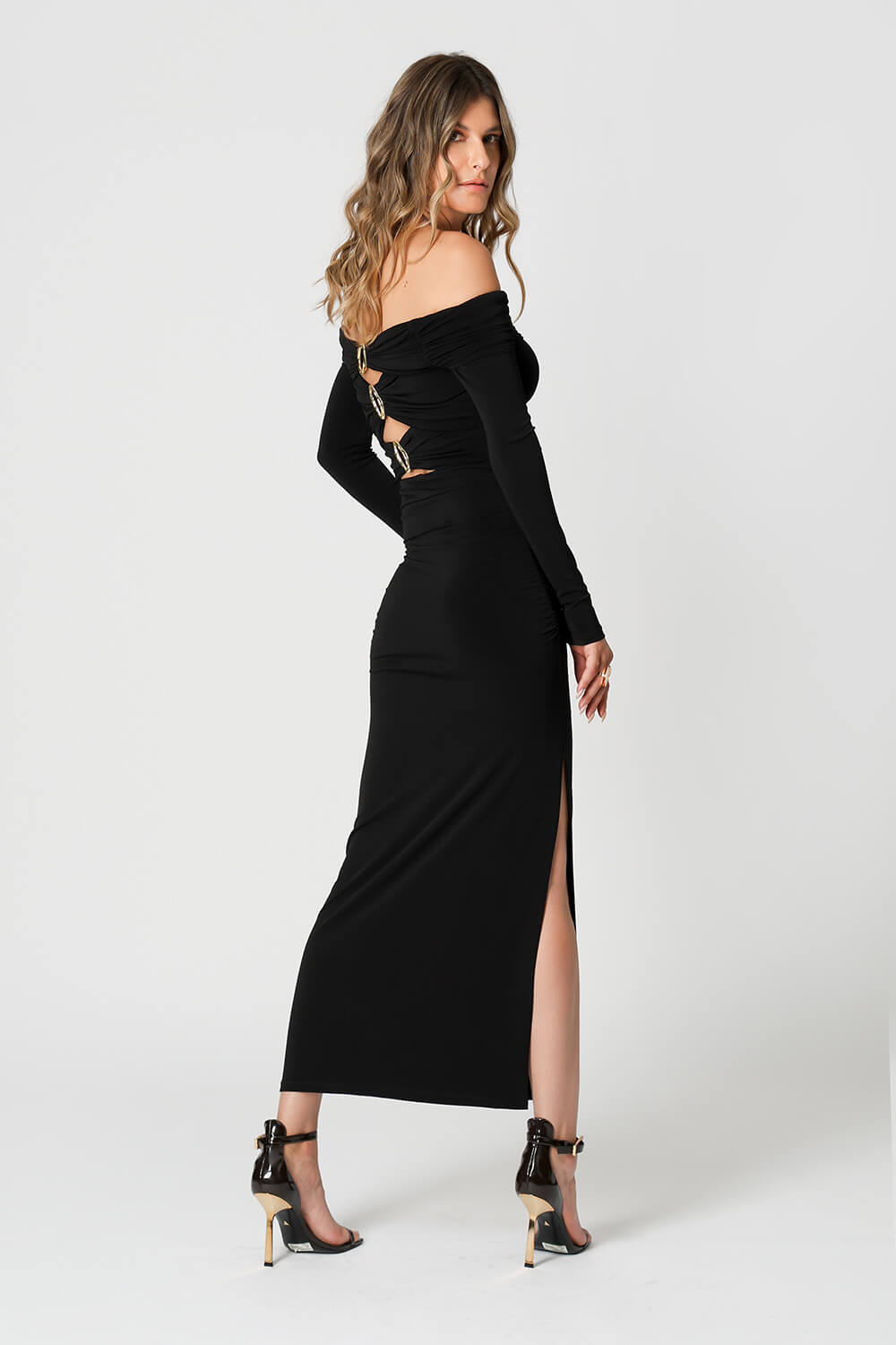 Detalhe de drapeado e aberturas acompanhado de fivelas douradas
