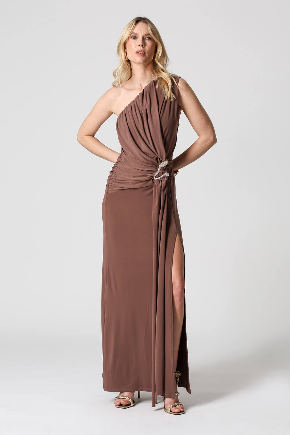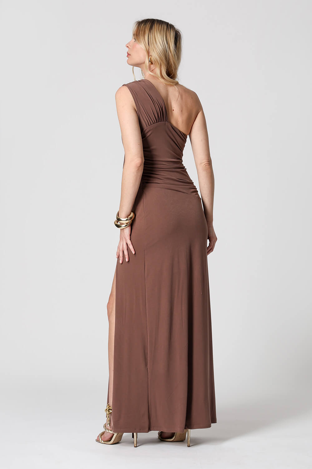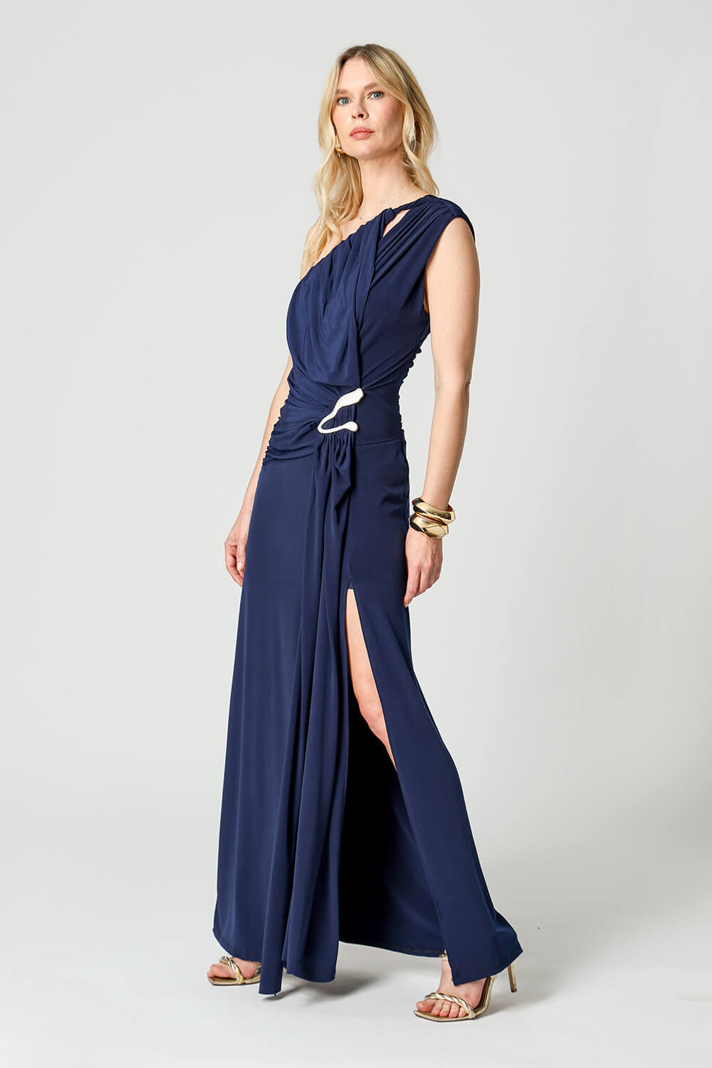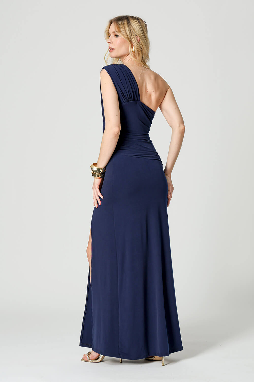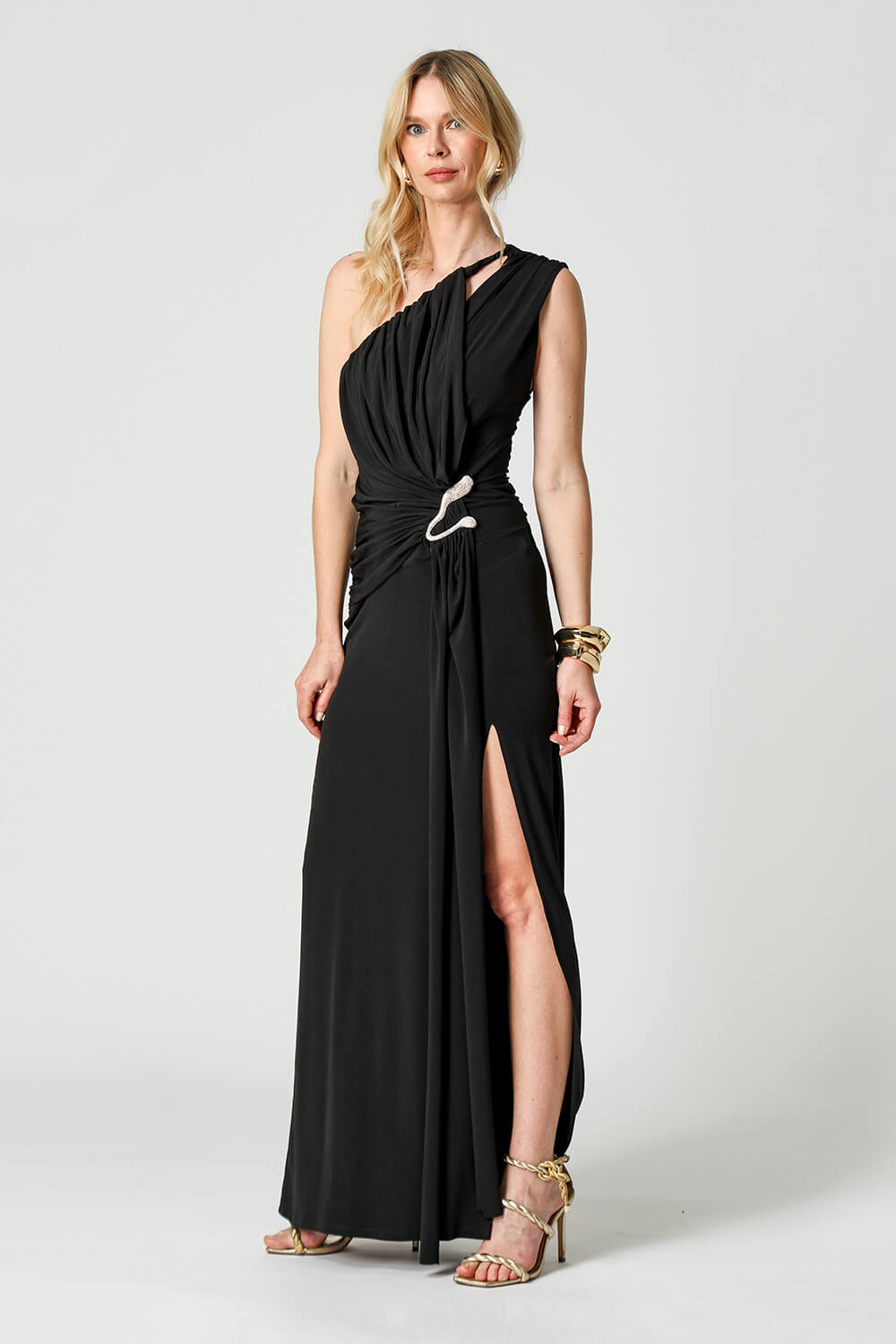 Vestido de ombro único em malha ITY, com franzido no decote e no ombro, além de abertura frontal torcida que valoriza a silhueta. Conta com faixa que passa por aviamento em ¿V¿ dourado com pedrarias, estendendo-se pela fenda frontal. Uma peça sofisticada, elegante e cheia de movimento.