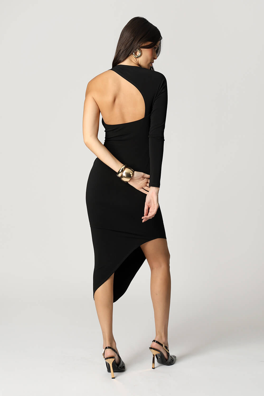 Moderno e cheio de personalidade, este vestido de ombro único se destaca pelo design assimétrico e pelo detalhe de fivela que valoriza a silhueta. As costas abertas trazem um toque sensual na medida certa, ideal para eventos e ocasiões especiais. Uma peça impactante e elegante, perfeita para quem quer se destacar.