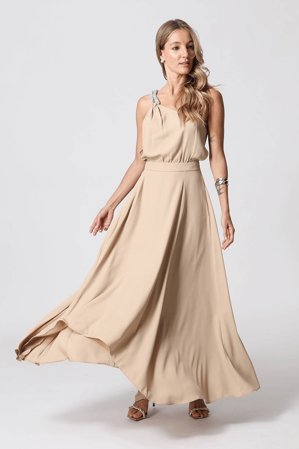 Vestido largo de un solo hombro con detalle de pedrería extraíble. ¡Pieza elegante, ideal para fiestas y ocasiones especiales!