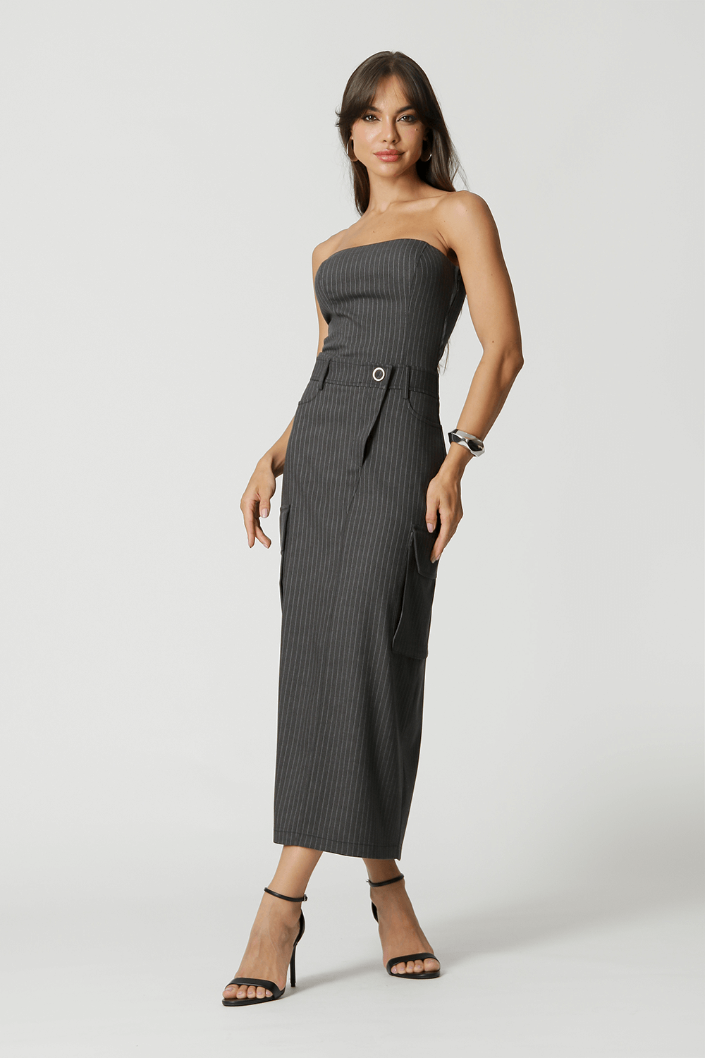 Vestido strapless con detalle de bolsillo lateral, botón forrado del mismo tejido y aro metálico. Modelo realizado en tejido Pinstripe Tailoring. Un modelo moderno, ideal para un ambiente casual.