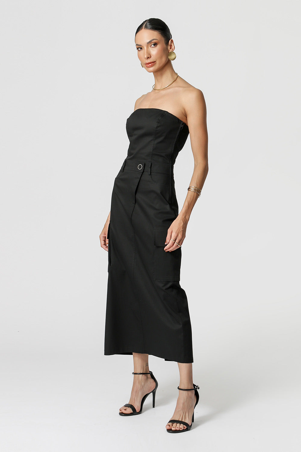 Vestido médio sem alças com detalhe de bolsos nas laterais e zíper de nylon. Uma peça confeccionada em tecido Memory. Um modelo moderno e perfeito para mood casual.
