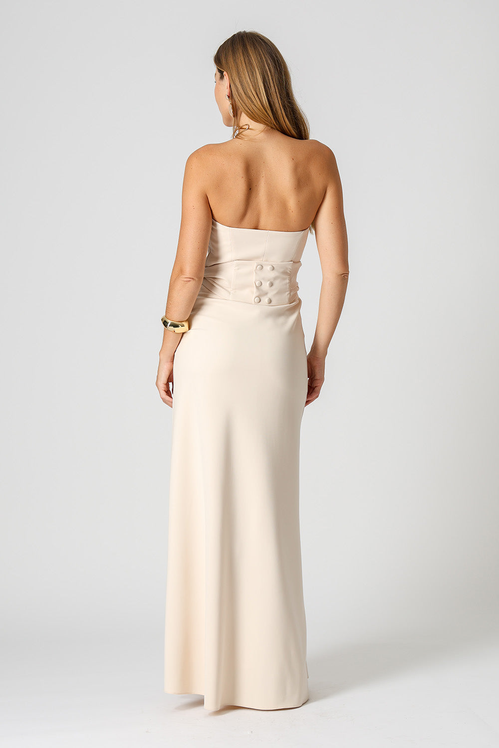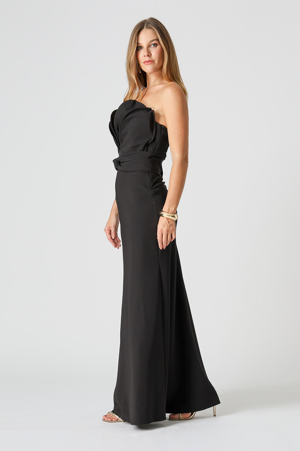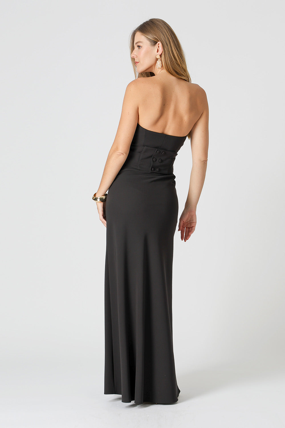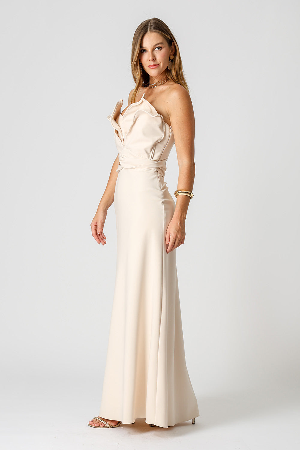 Vestido Strapless em alfaiataria com busto em formato de folha 3D, que adiciona charme e originalidade. Acompanha cinto torcido que define a cintura e completa o visual com estilo. Perfeito para eventos elegantes.