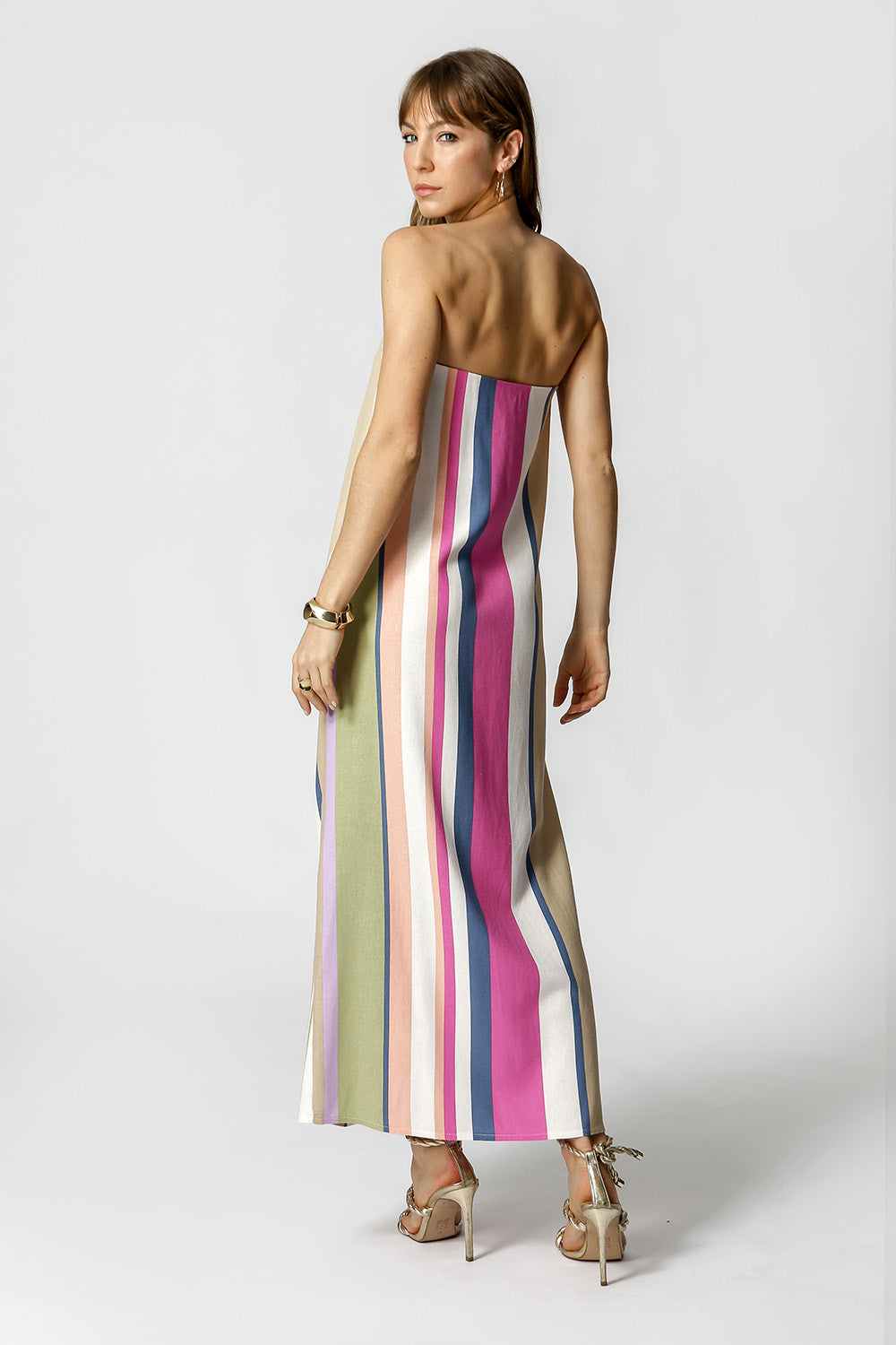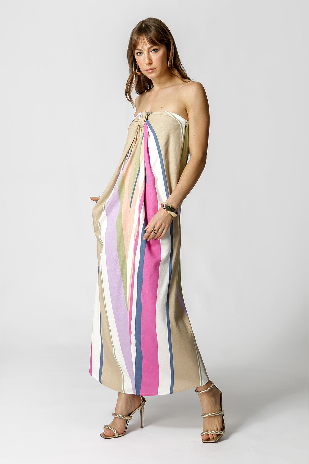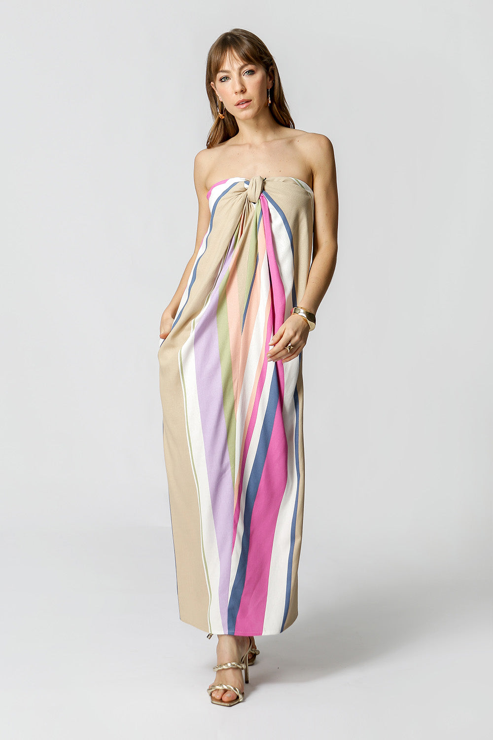 Vestido palabra de honor con lazo delantero en lino estampado, ideal para looks casual.