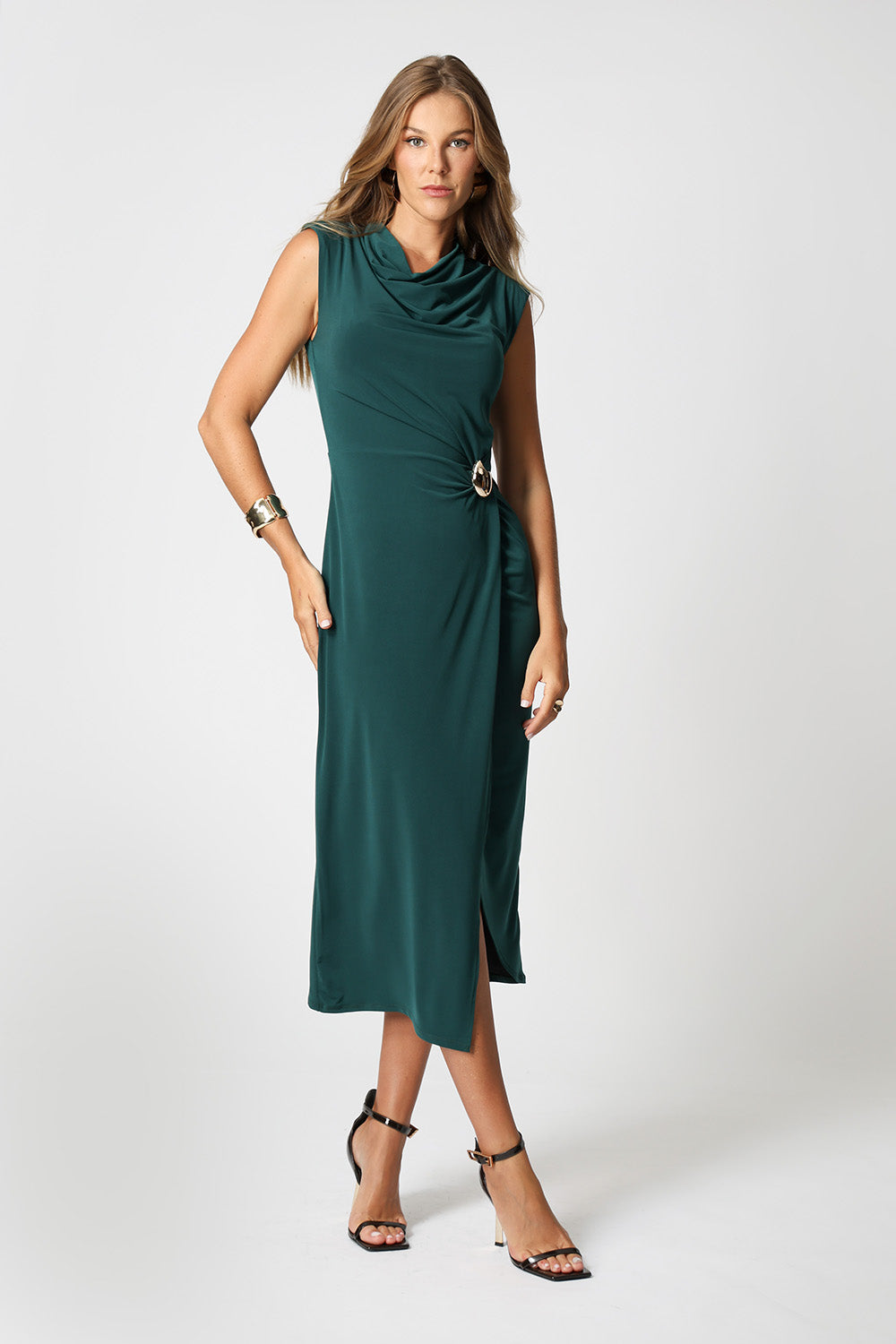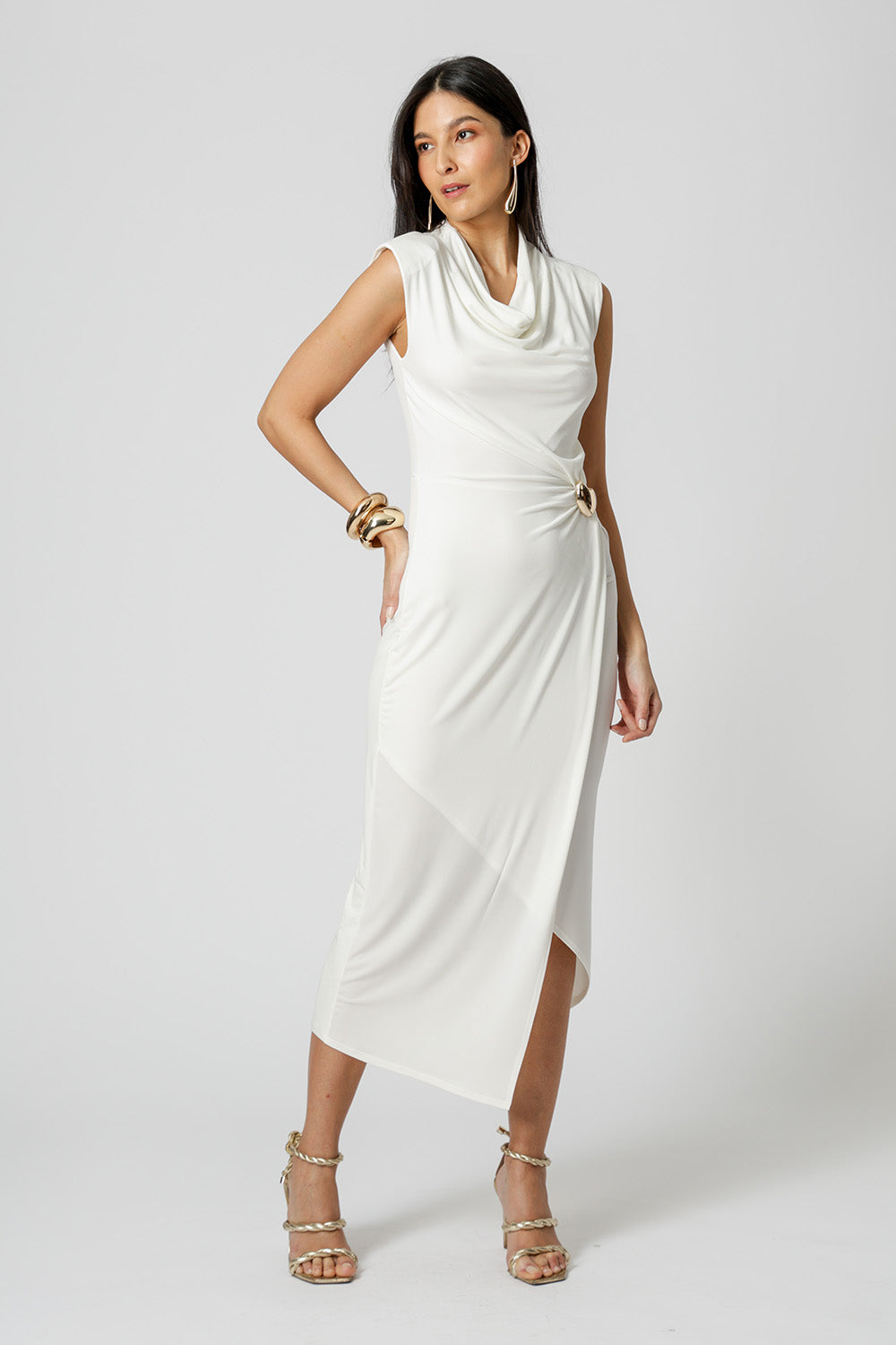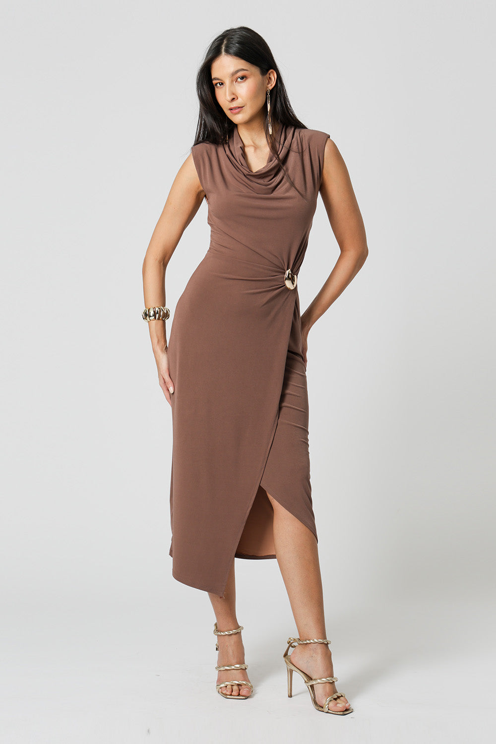 Vestido transpassado com acessório, modelo que valoriza a silhueta com um caimento elegante e fluído. Perfeito para ocasiões especiais ou para um look sofisticado no dia a dia.