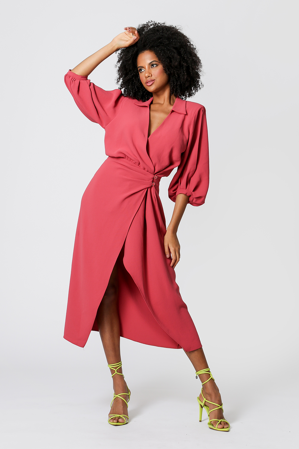 Vestido midi de manga larga, confeccionado en crepe y detalle fruncido. ¡Una hermosa pieza para rockear!