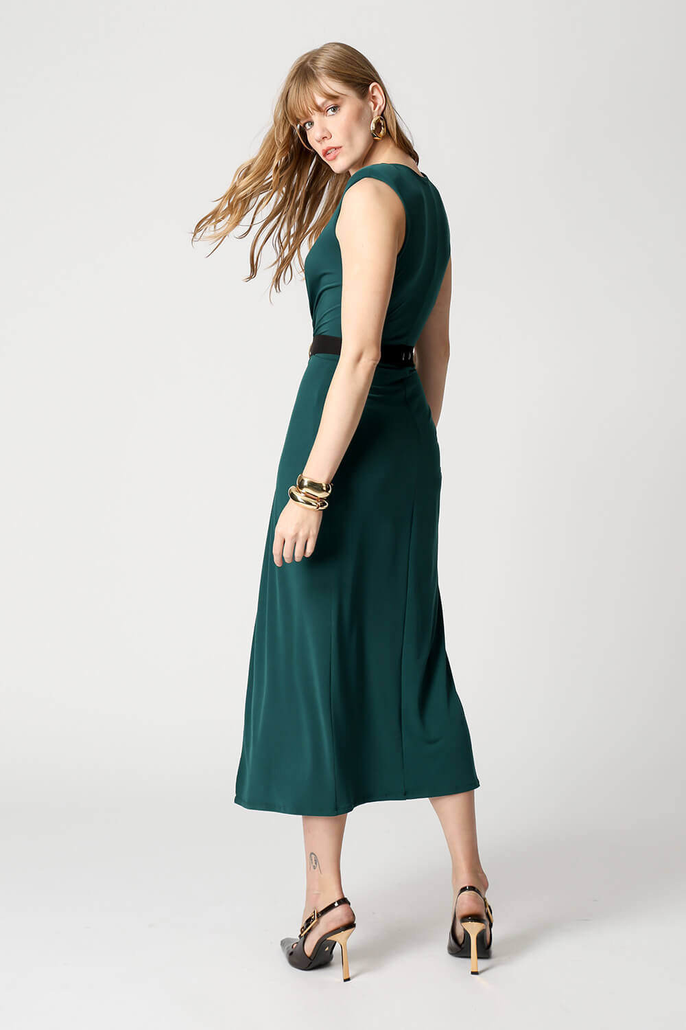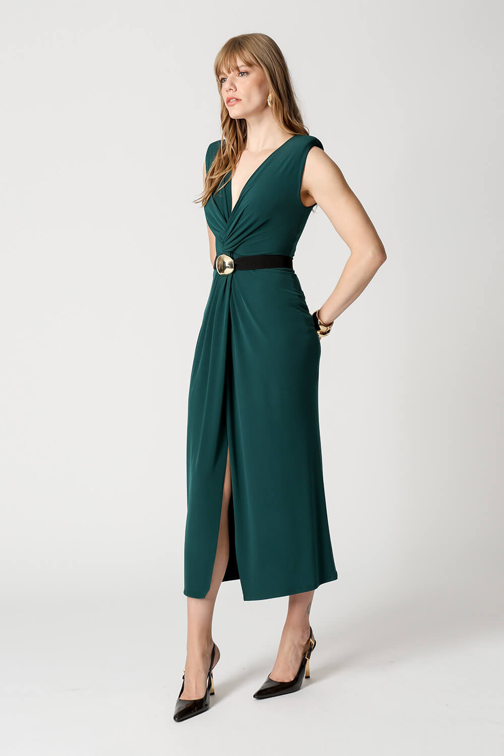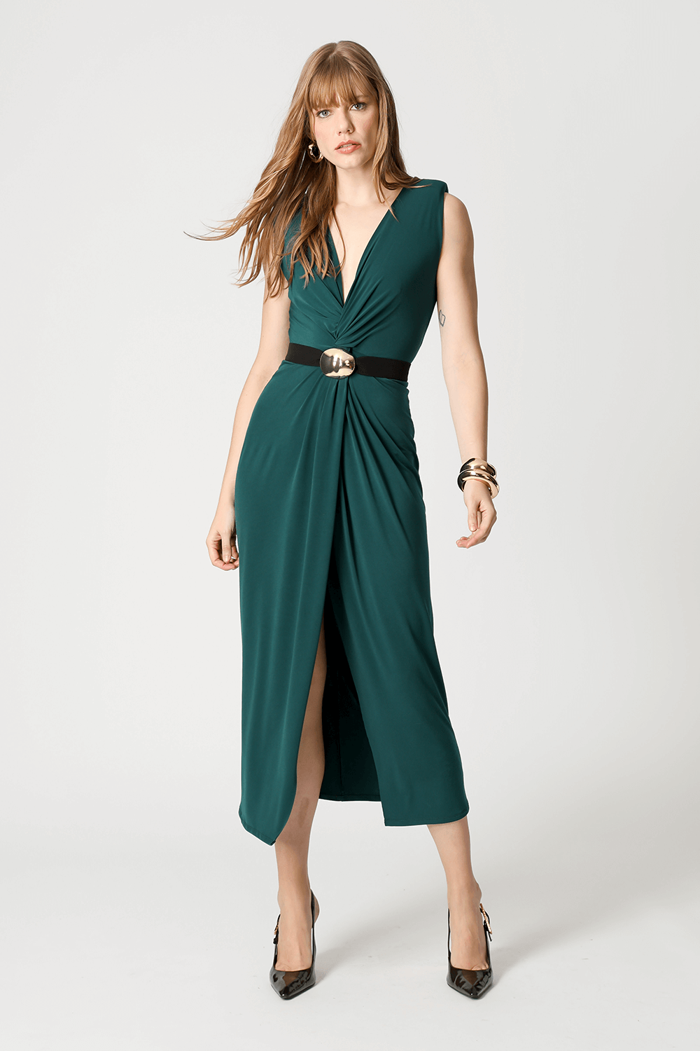 Vestido con escote profundo y detalle de giro delantero que realza elegantemente el busto. La abertura frontal agrega la cantidad justa de sensualidad, mientras que las llamativas hombreras aportan estructura y un toque de poder al look. Ideal para ocasiones especiales y eventos nocturnos.