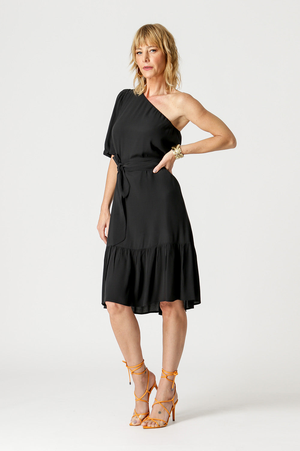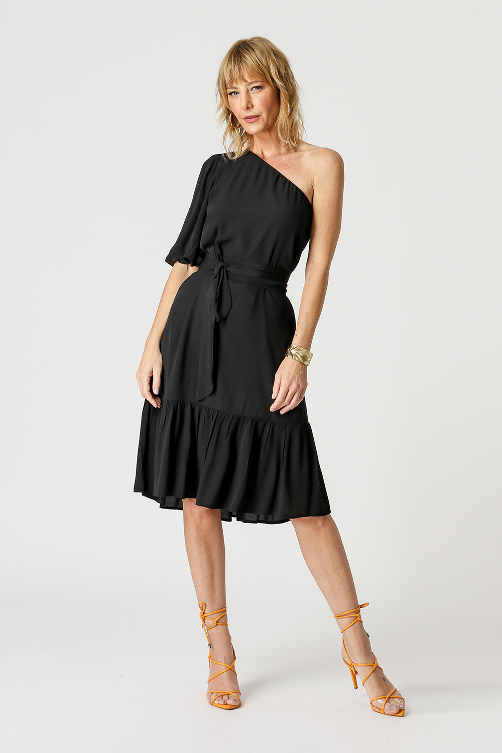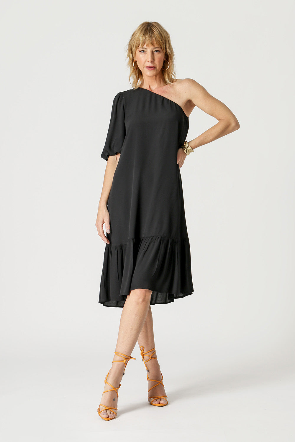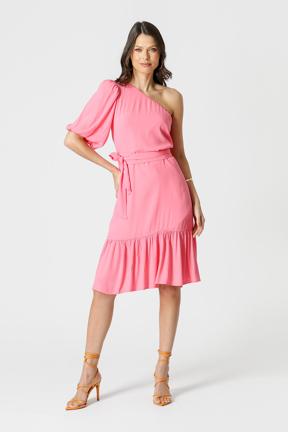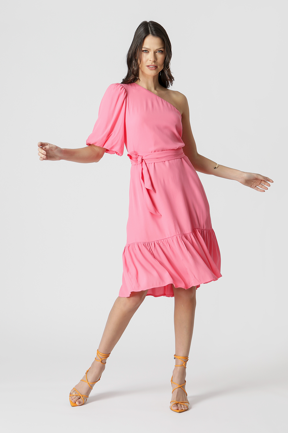 Vestido confeccionado em Viscose, com shape solto no corpo, uma manga bufante, acompanha cinto com pesponto contrastante. Uma peça com ar despojado e fresco, ideal para os dias de verão.