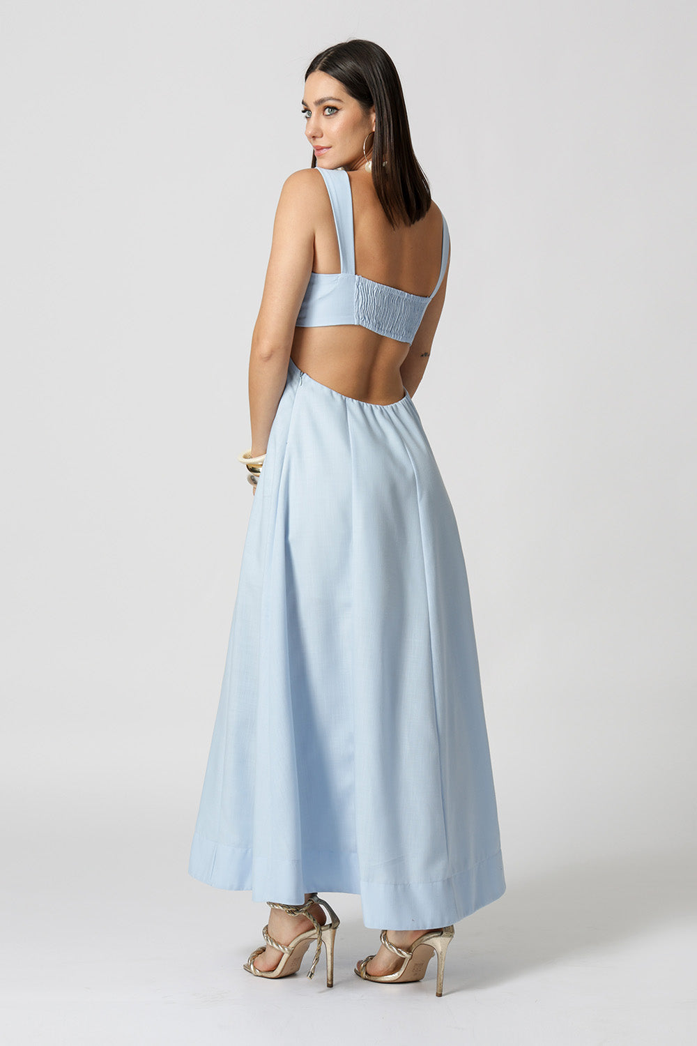 Vestido em linho com algodão, com alças largas, recortes no busto e saia, além de vazado lateral que se estende até as costas abertas. Silhueta marcante com frescor e sofisticação ideal para os dias quentes com estilo.