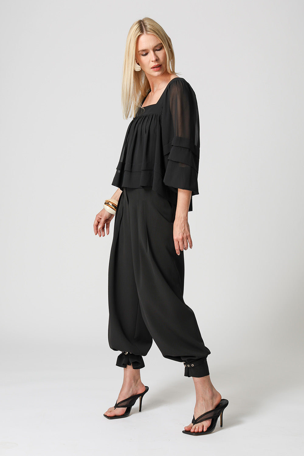 Bata em chiffon glass leve e translúcido, com mangas bufantes marcadas por pregas elegantes e caimento solto no corpo. Delicada e sofisticada, ideal para compor looks leves e estilosos.