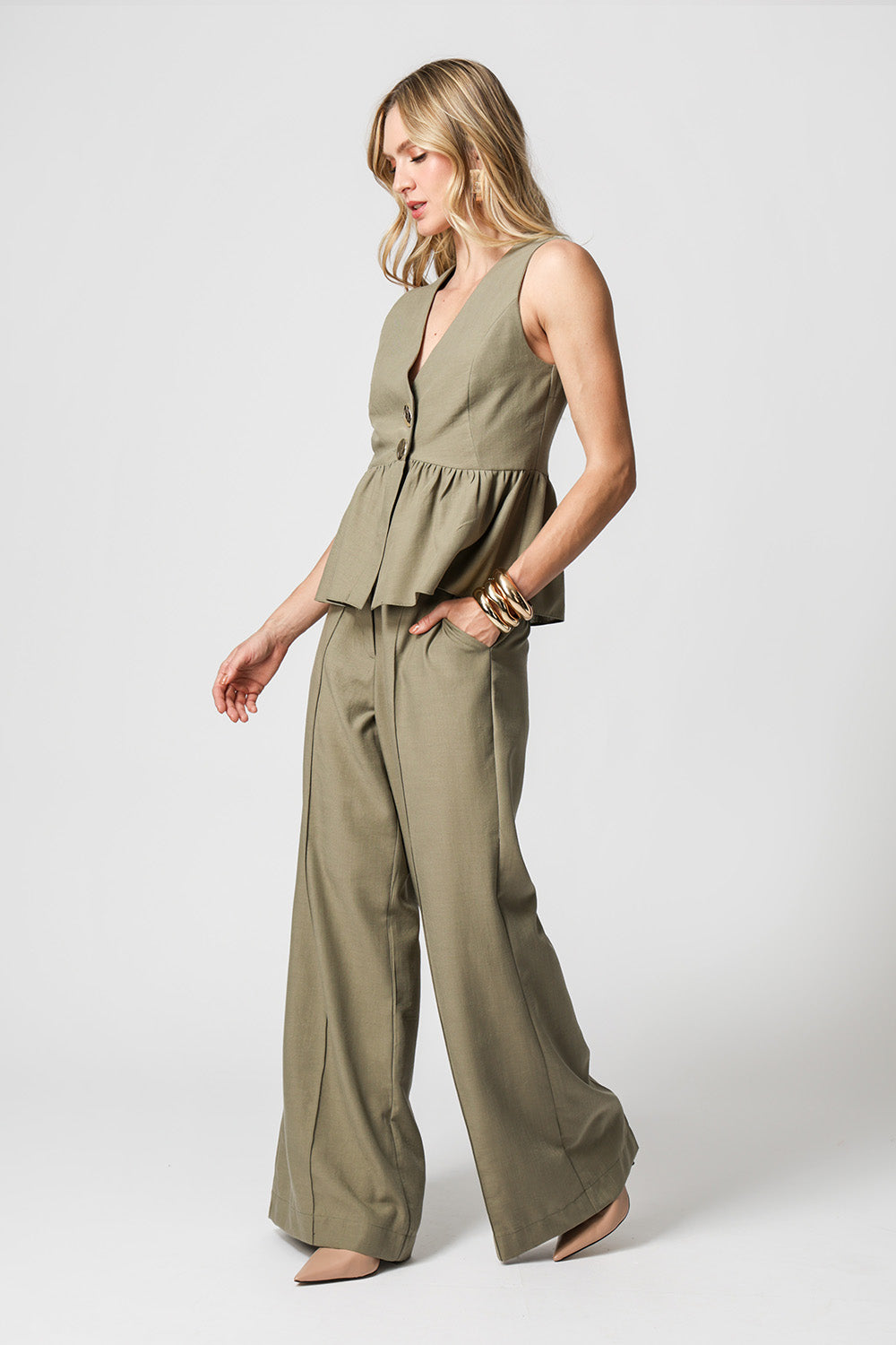 Blusa bata em poli linho com modelagem peplum, decote V e botões funcionais na frente. Leve, versátil e com toque natural perfeita para compor looks elegantes do dia a dia.