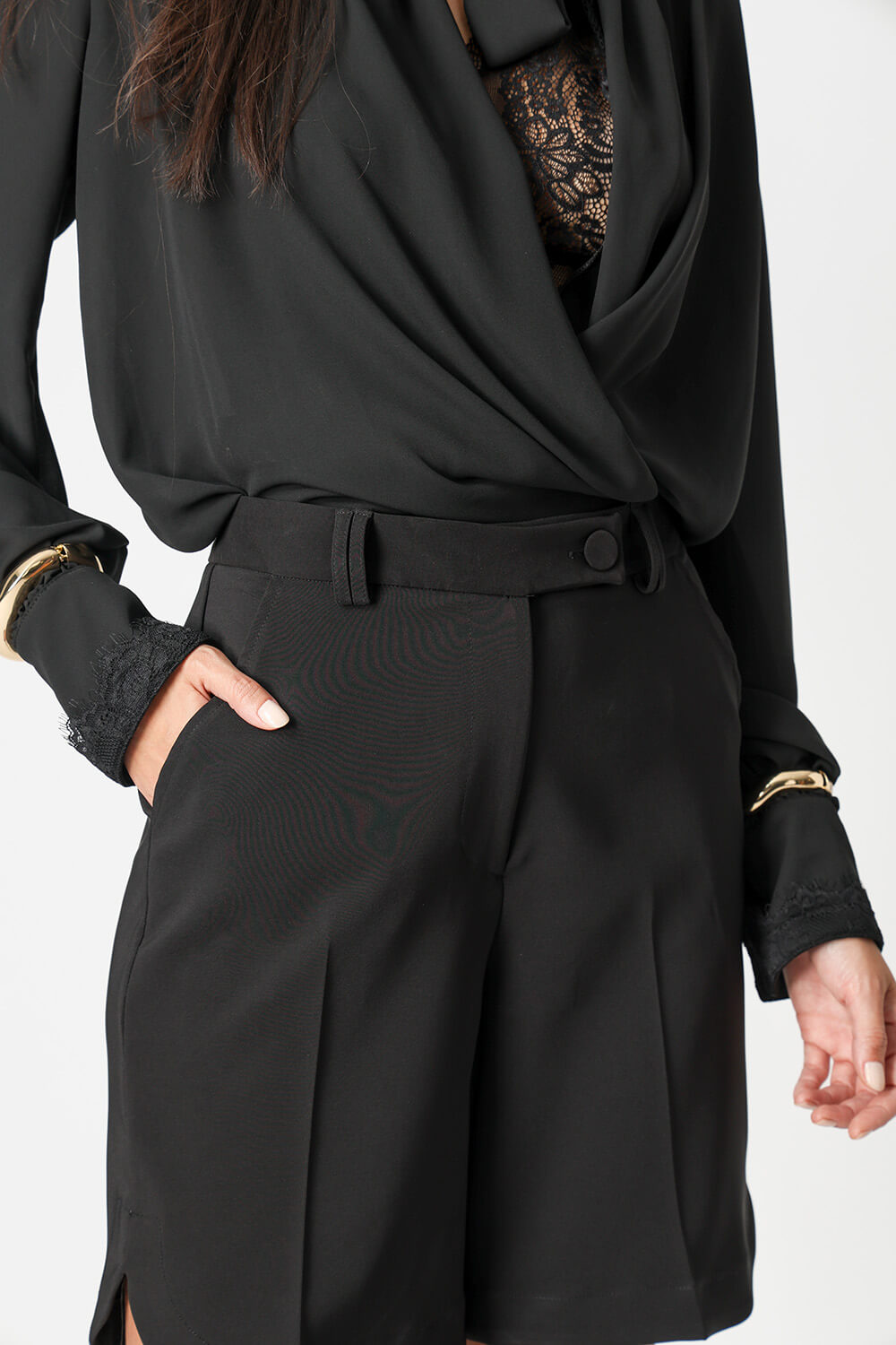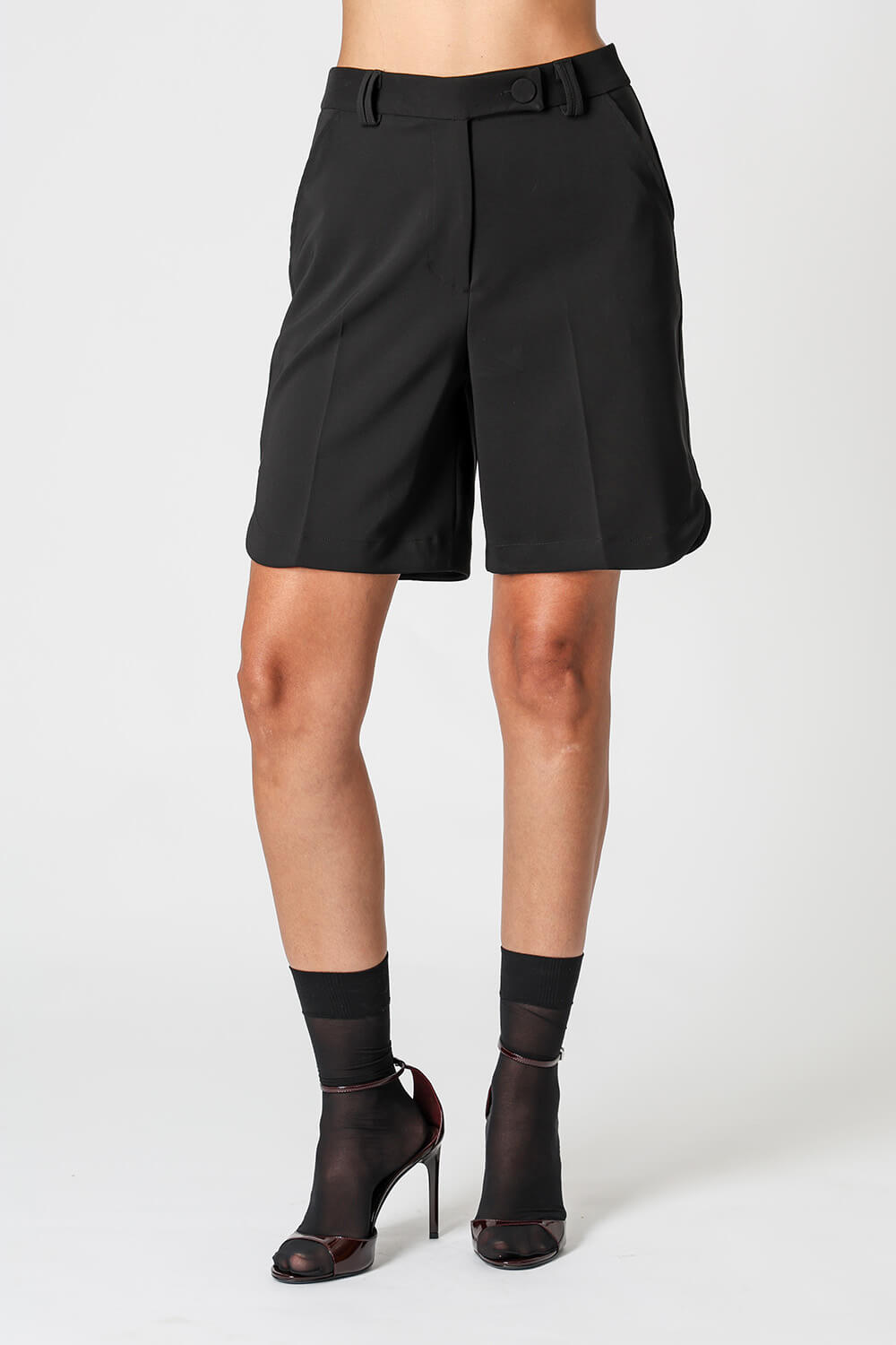 Bermuda em alfaiataria com cós transpassado, barra lateral levemente abaulada e vinco frontal e traseiro. Sofisticada e estruturada, perfeita para looks elegantes e modernos.