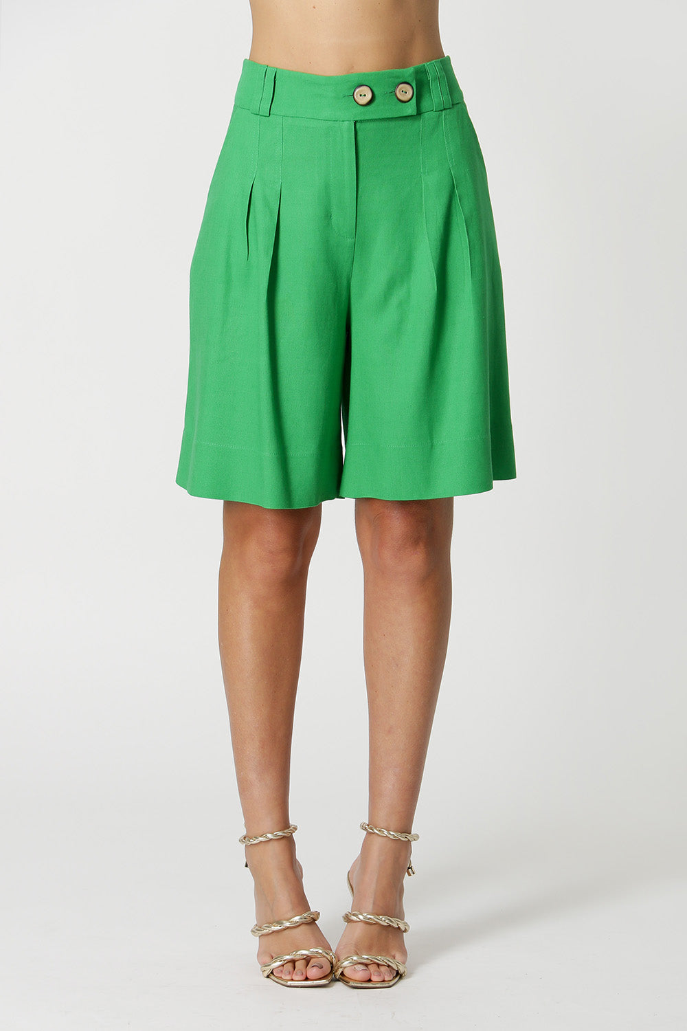 Bermuda com cós transpassado e botões. Confeccionada em tecido linho viscose. Uma peça elegante e ideal para mood casual.