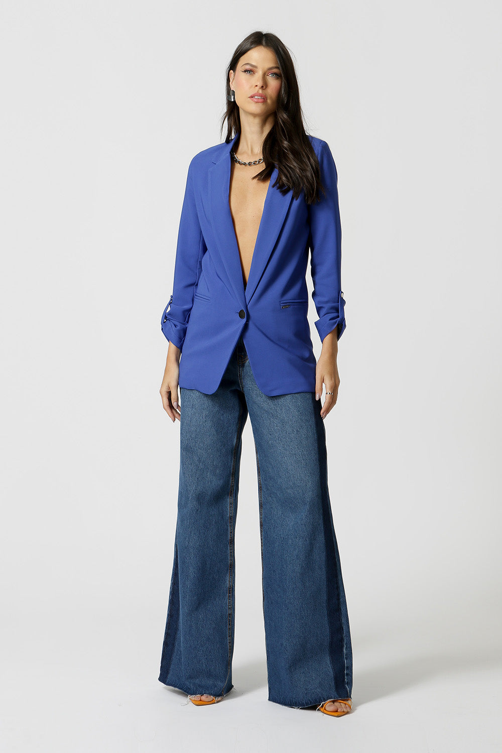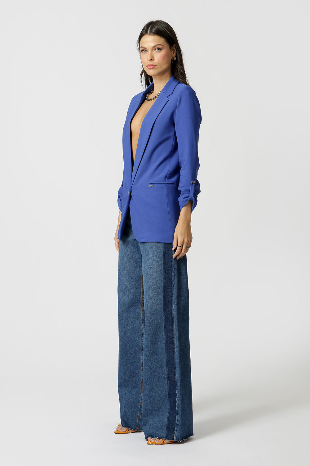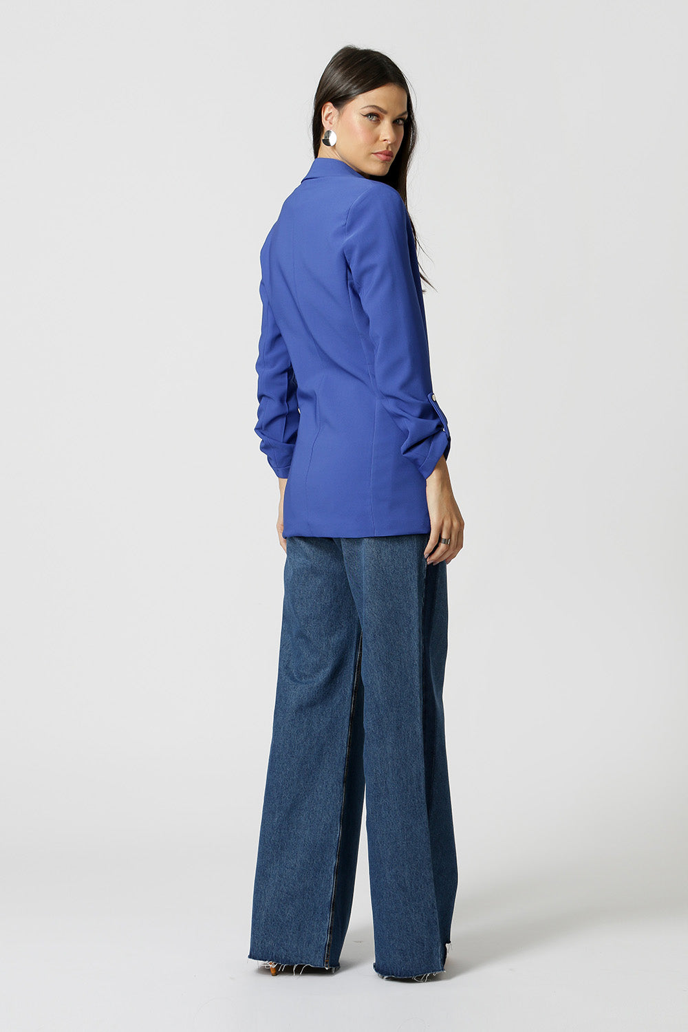 Blazer de alfaiataria com shape longline, com detalhe de martingale e com forro estampado.