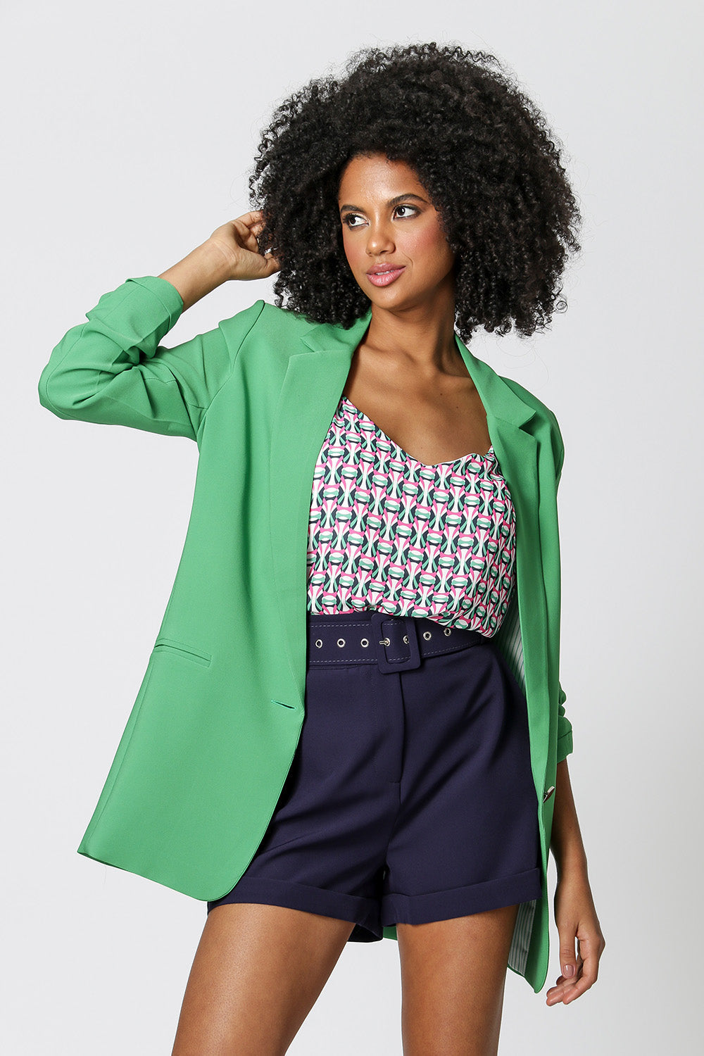 Blazer de alfaiataria com shape longline, com detalhe de martingale e com forro estampado.