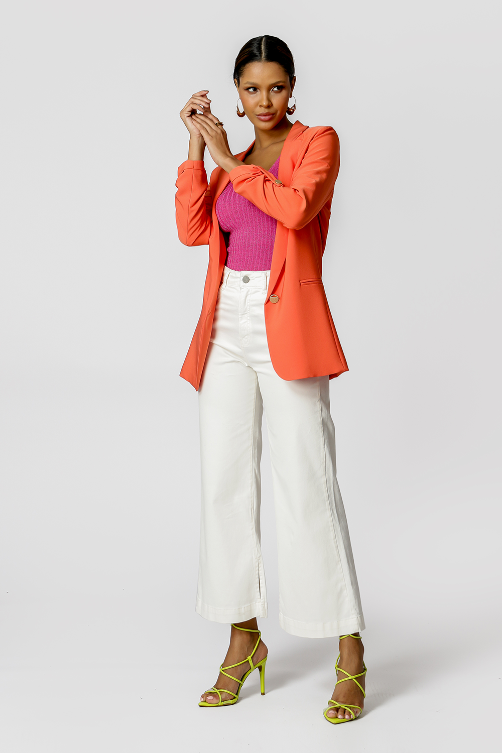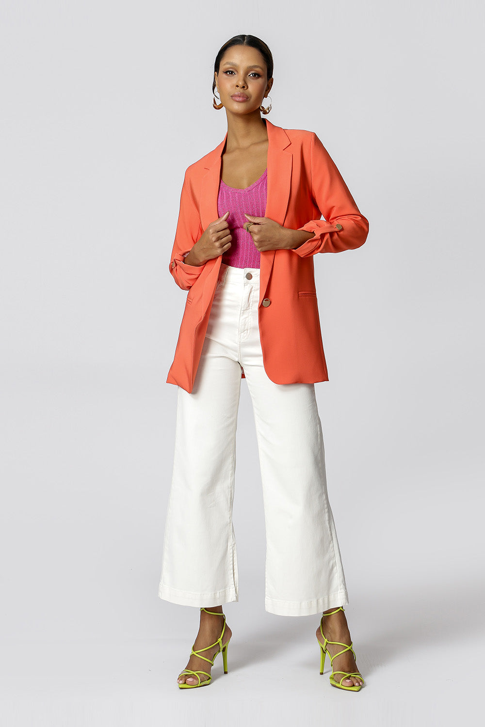 Blazer de alfaiataria com shape longline, com detalhe de martingale e com forro estampado.