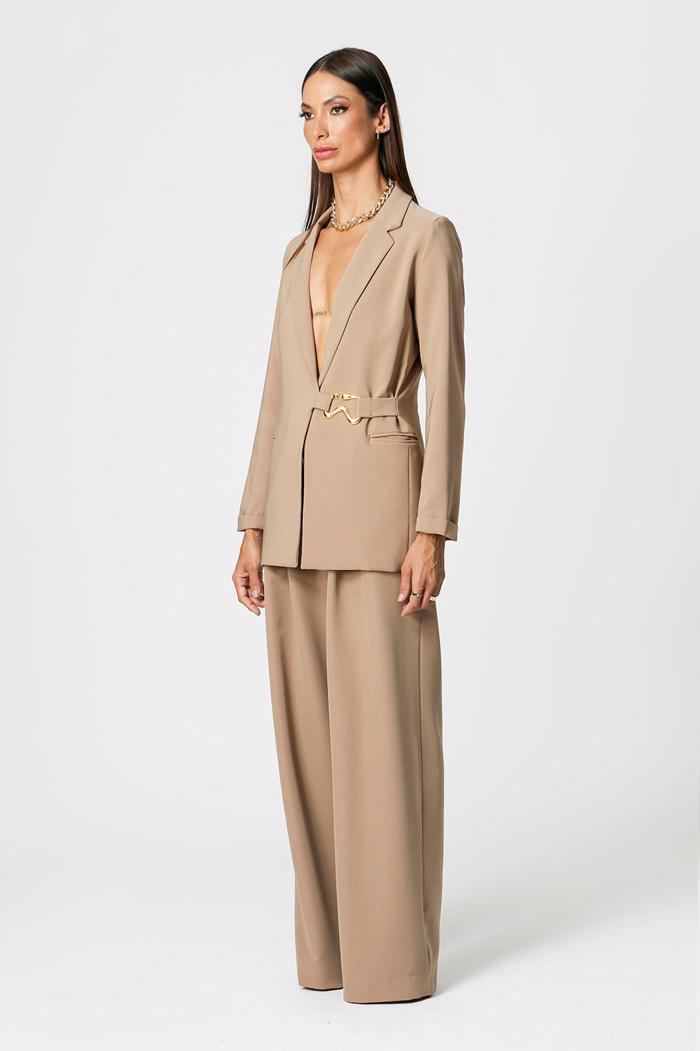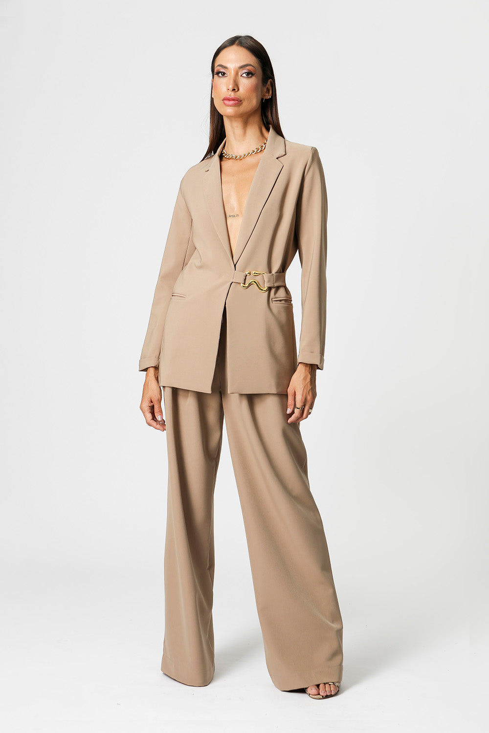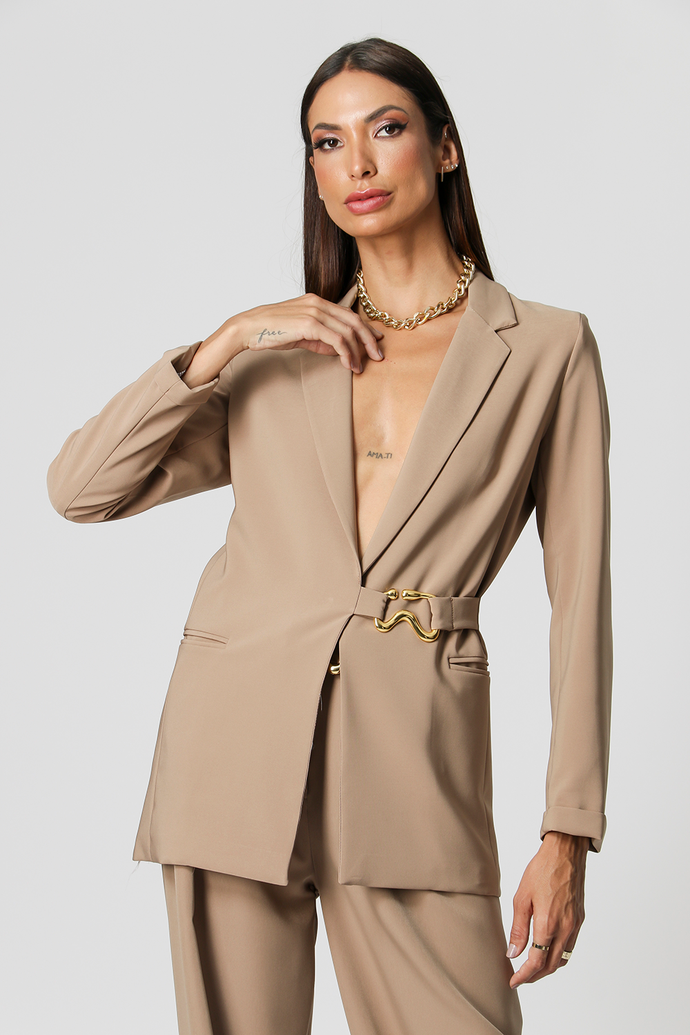 Blazer desenvolvido em tecido de alfaiataria com bolsos e abertura frontal. Cinto com aviamento em metal, acinturando a peça. Peça elegante, casual e essêncial para quem quer arrasar.
