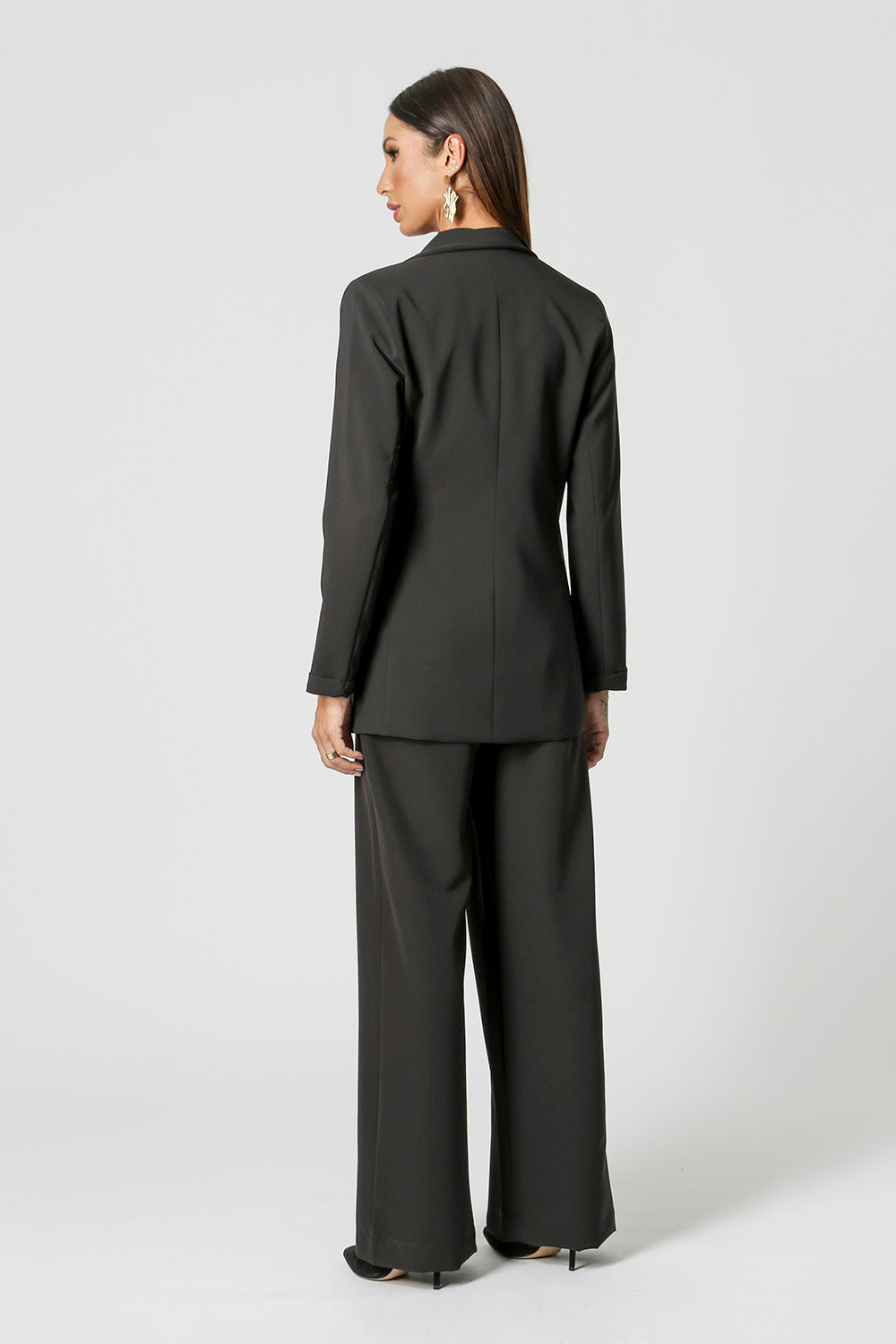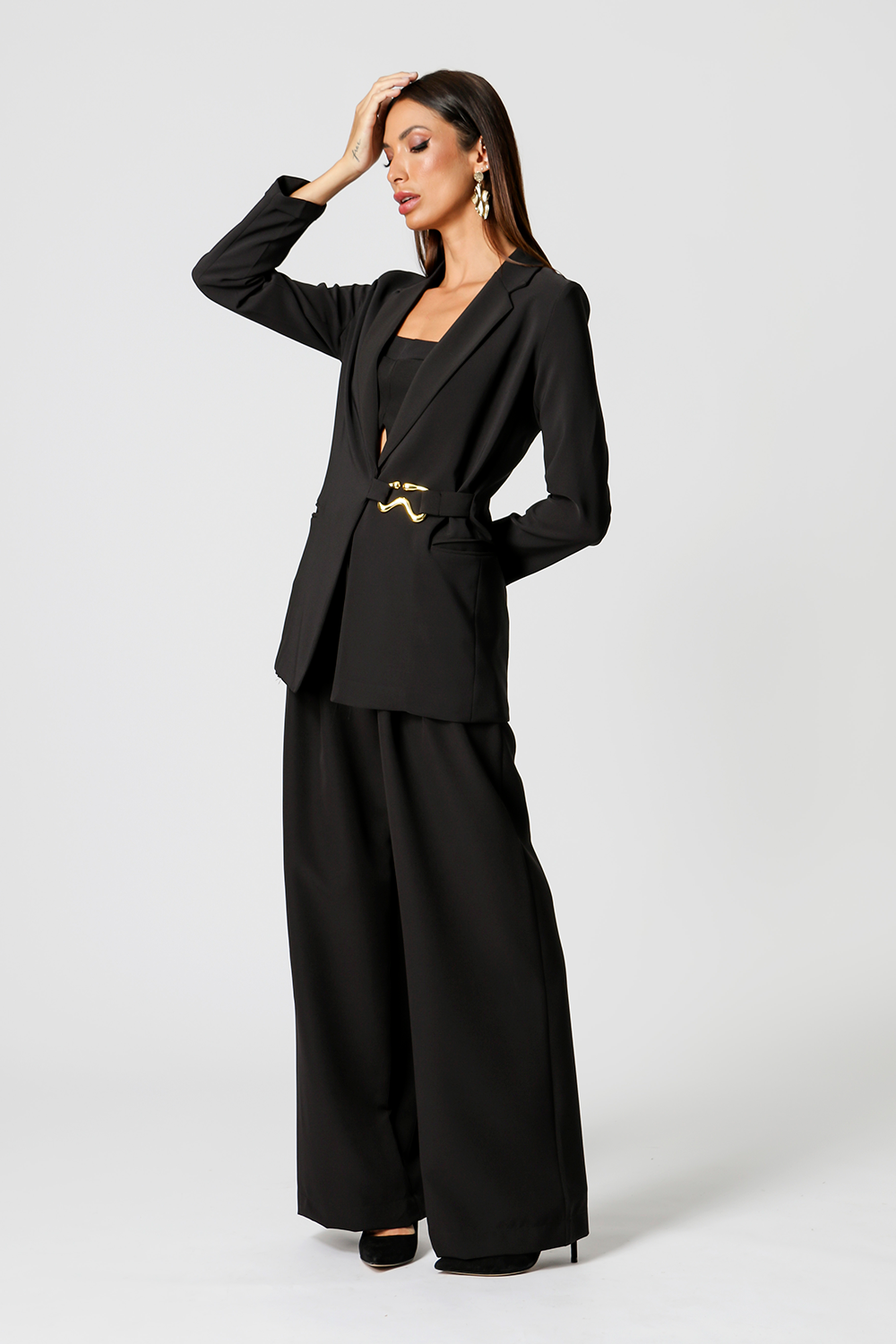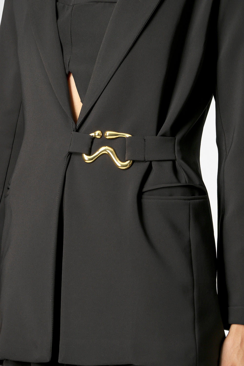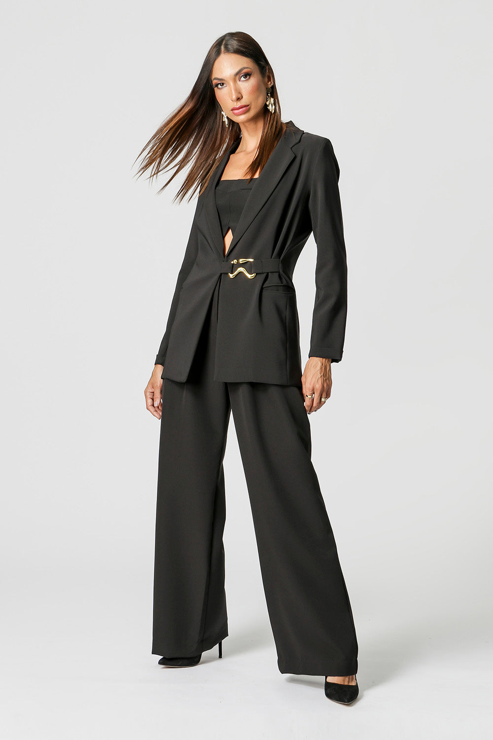 Blazer desenvolvido em tecido de alfaiataria com bolsos e abertura frontal. Cinto com aviamento em metal, acinturando a peça. Peça elegante, casual e essêncial para quem quer arrasar.