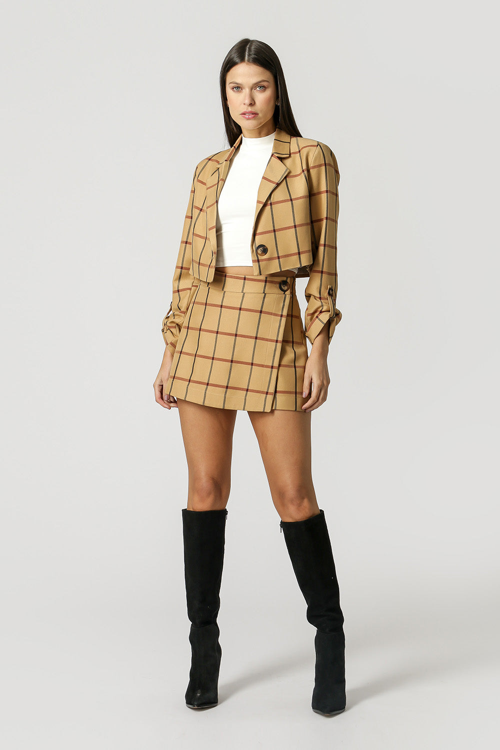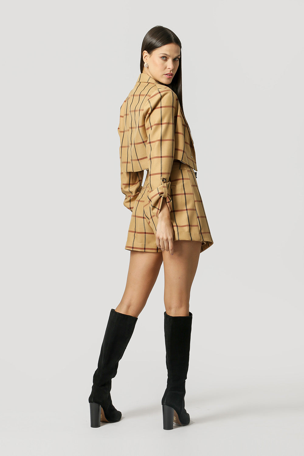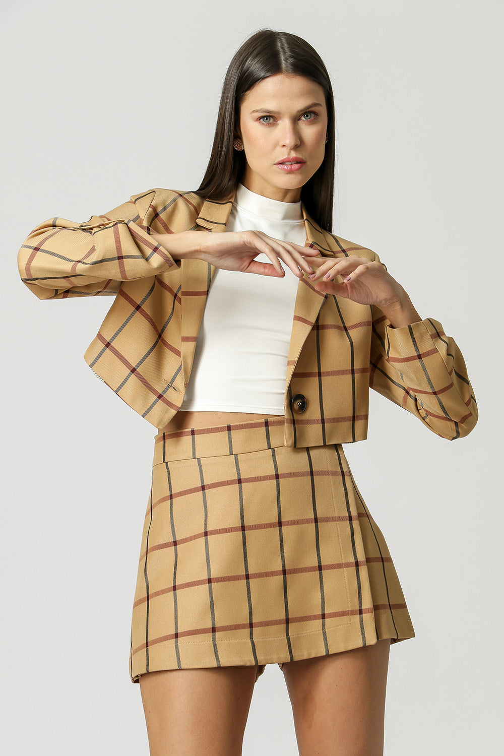 Blazer feito em alfaiataria xadrez com shape cropped. A peça possui detalhe de martingale com botões nas mangas, botão frontal e com forro estampado. Uma peça atemporal para muitas ocasiões.