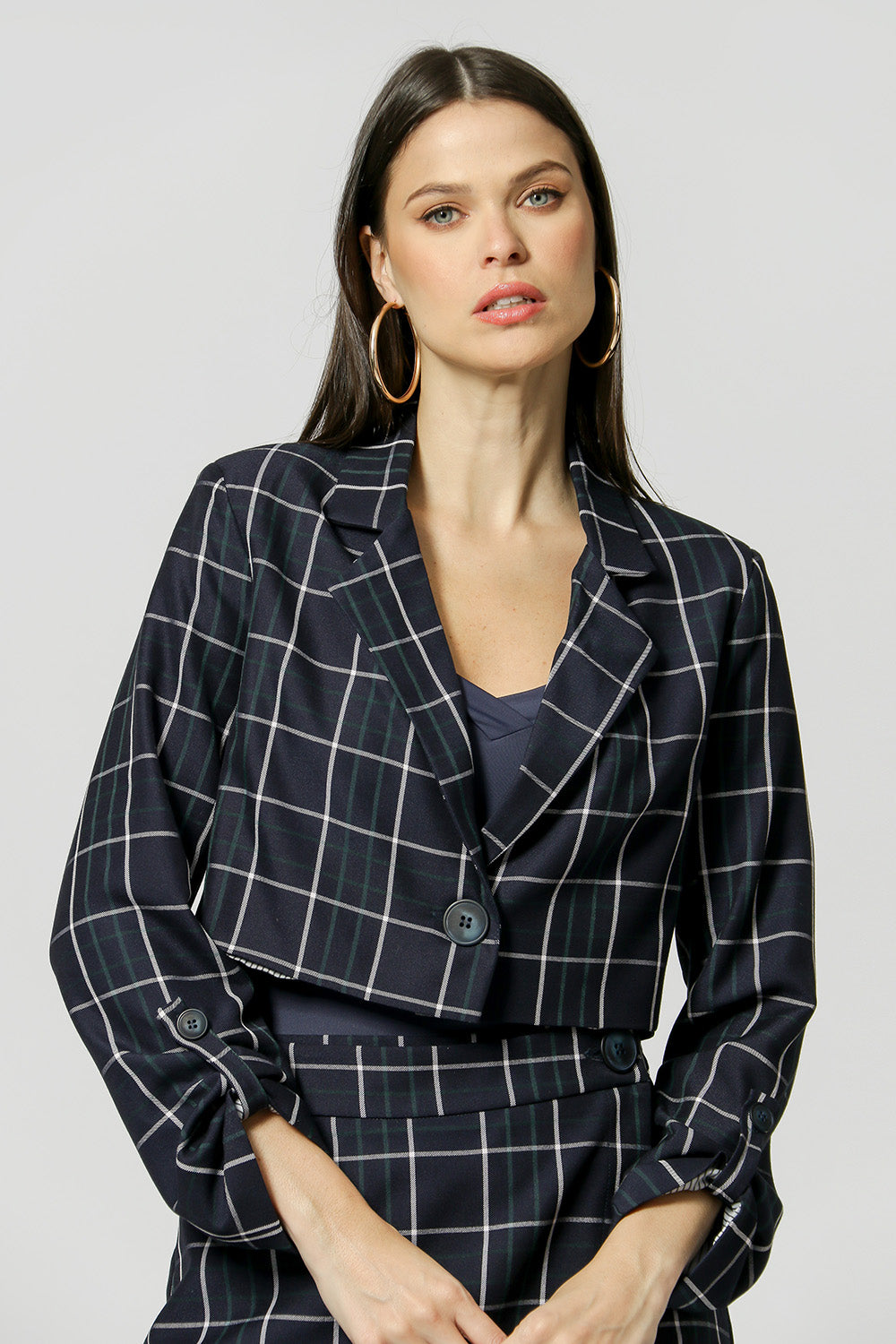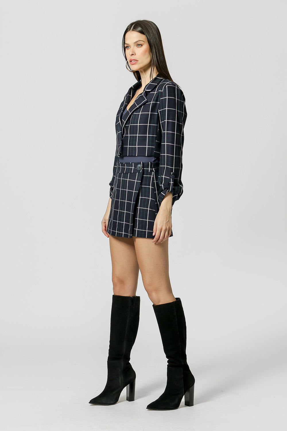Blazer feito em alfaiataria xadrez com shape cropped. A peça possui detalhe de martingale com botões nas mangas, botão frontal e com forro estampado. Uma peça atemporal para muitas ocasiões.