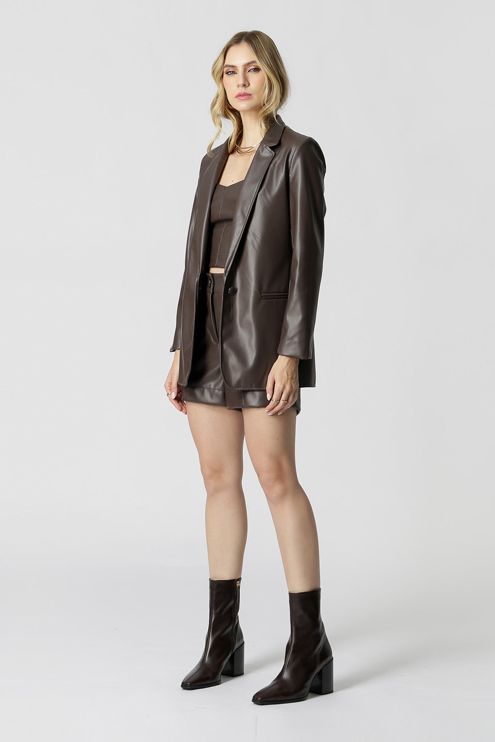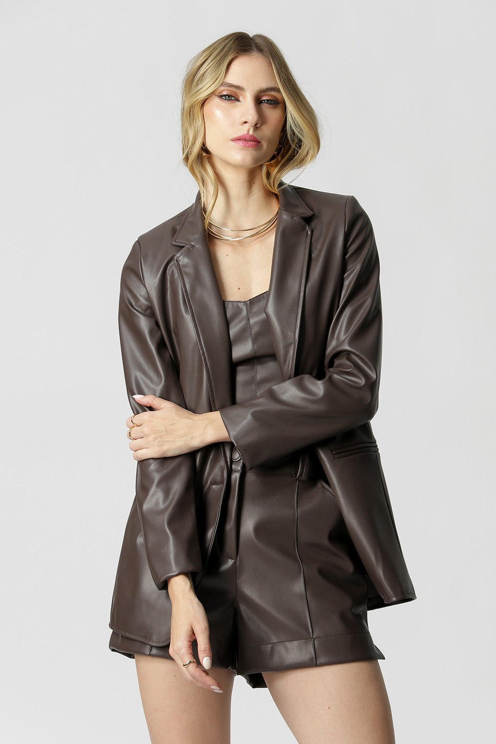 Blazer longline com botão forrado do próprio tecido e em detalhe de aro. Um modelo confeccionado em tecido couro sintético. Uma peça perfeita para adicionar um toque de sofisticação e estilo em seus looks e que combina com diversas peças aposte!