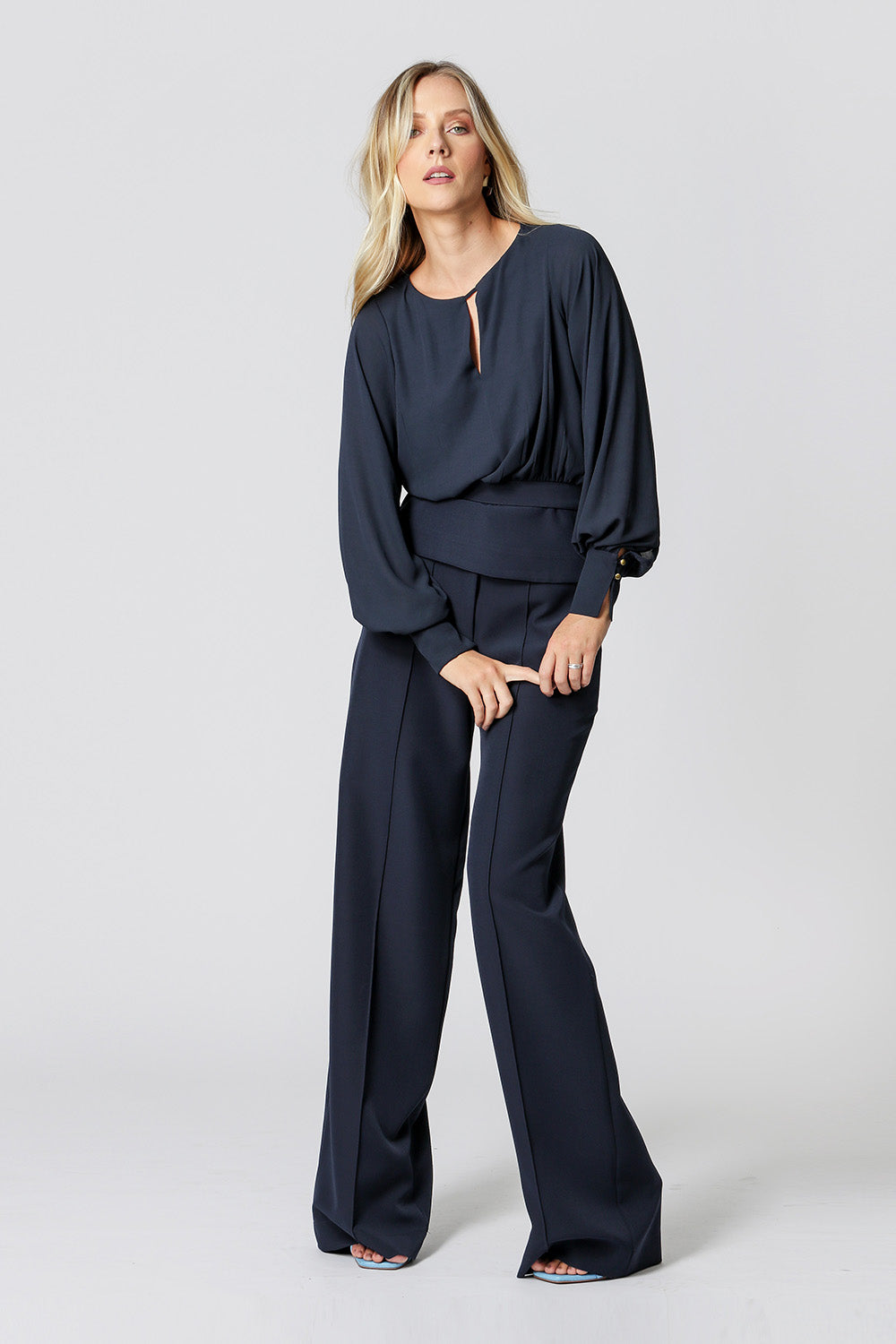 Blusa acinturada com mix de tecidos, abertura com botões costas. Uma peça charmosa para looks de trabalho ou mesmo para um look night.