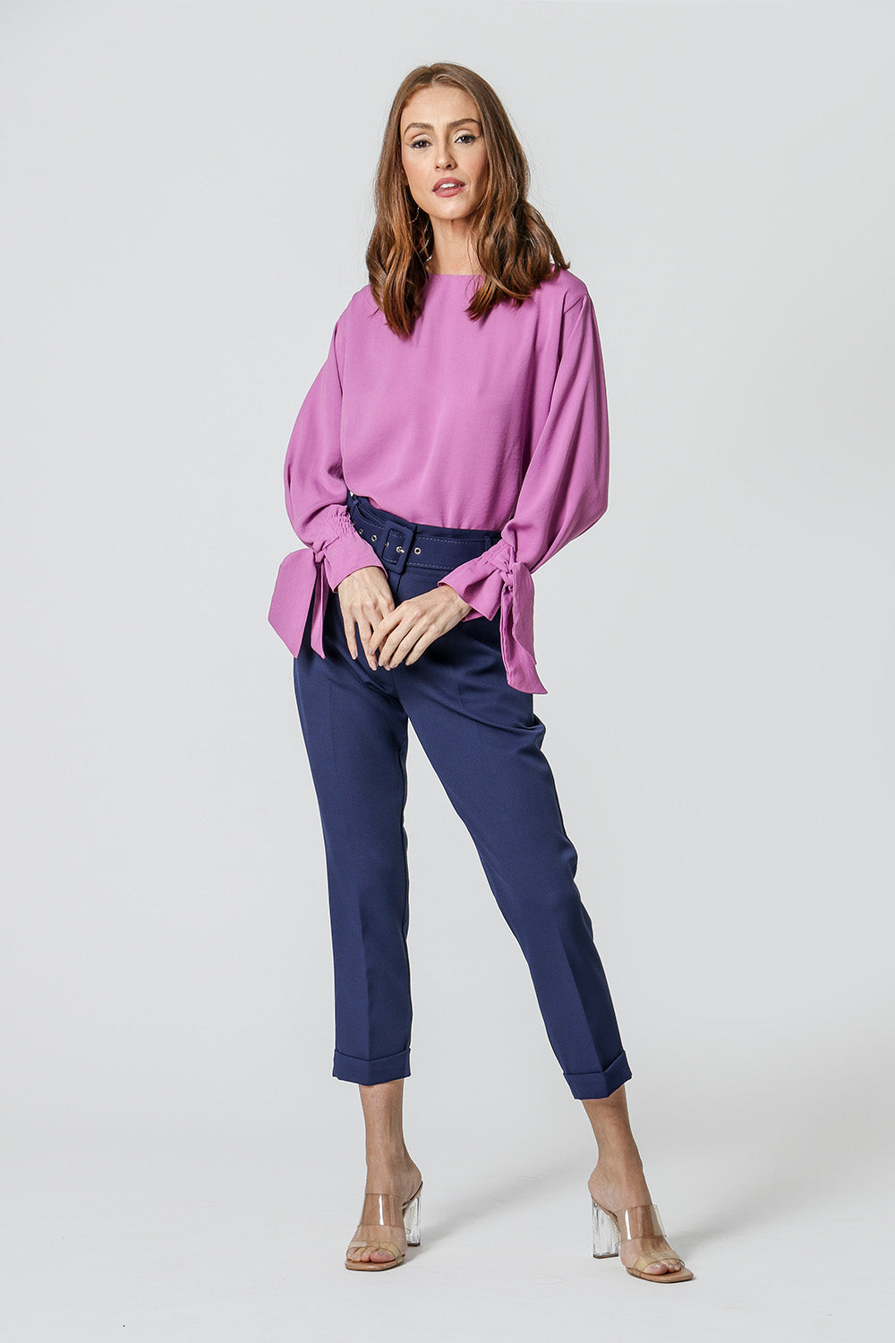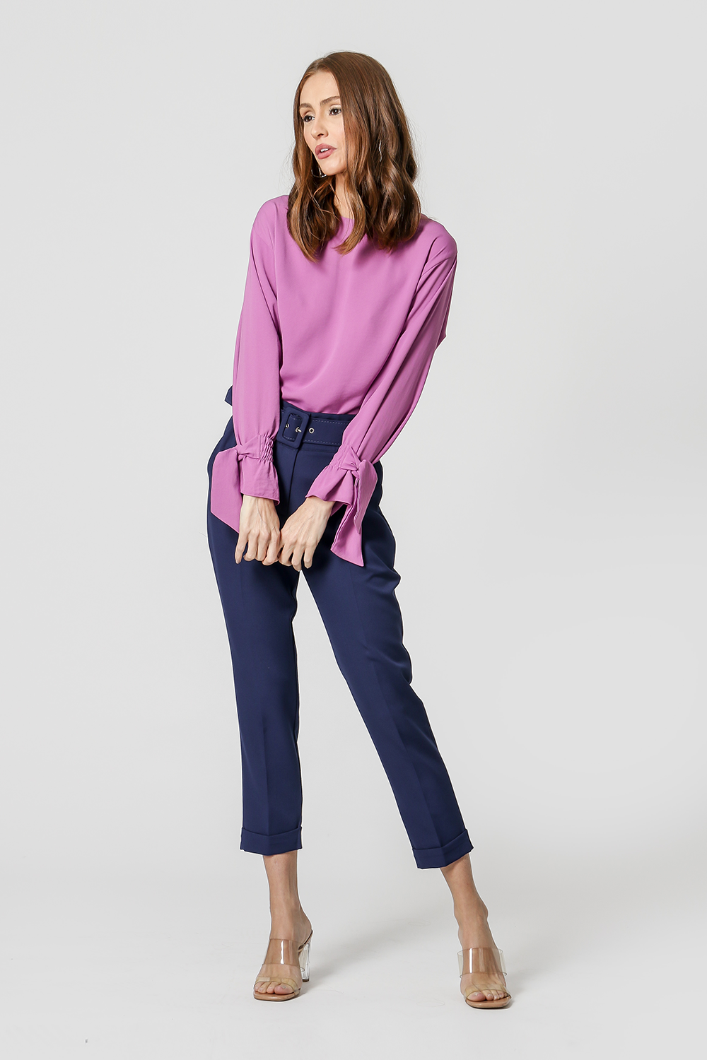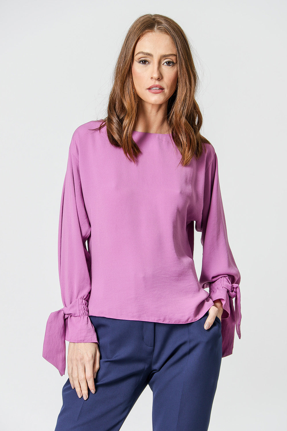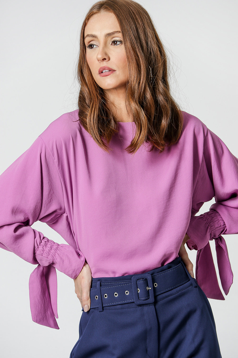 Blusa com shape mais amplo e manga longa com detalhe de amarração no punho. Peça elegante e sofisticada, perfeita para qualquer composição.