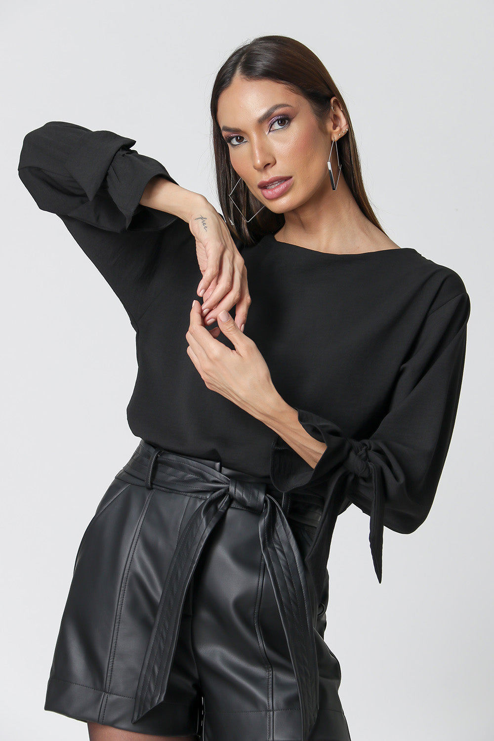 Blusa com shape mais amplo e manga longa com detalhe de amarração no punho. Peça elegante e sofisticada, perfeita para qualquer composição.