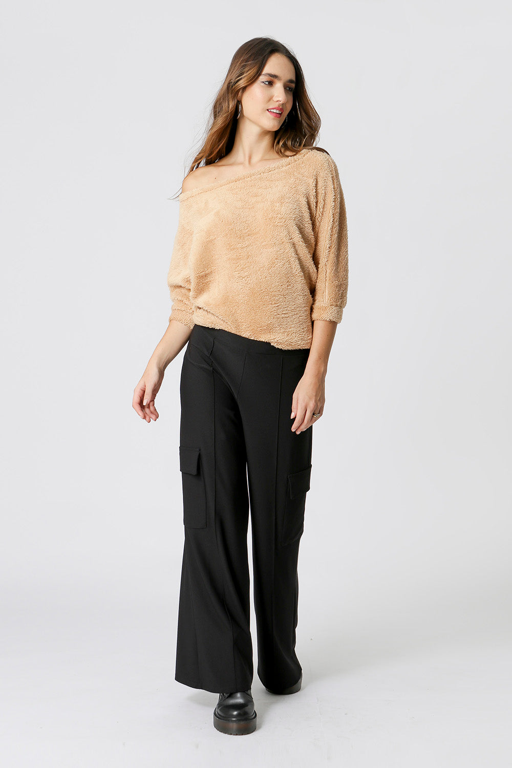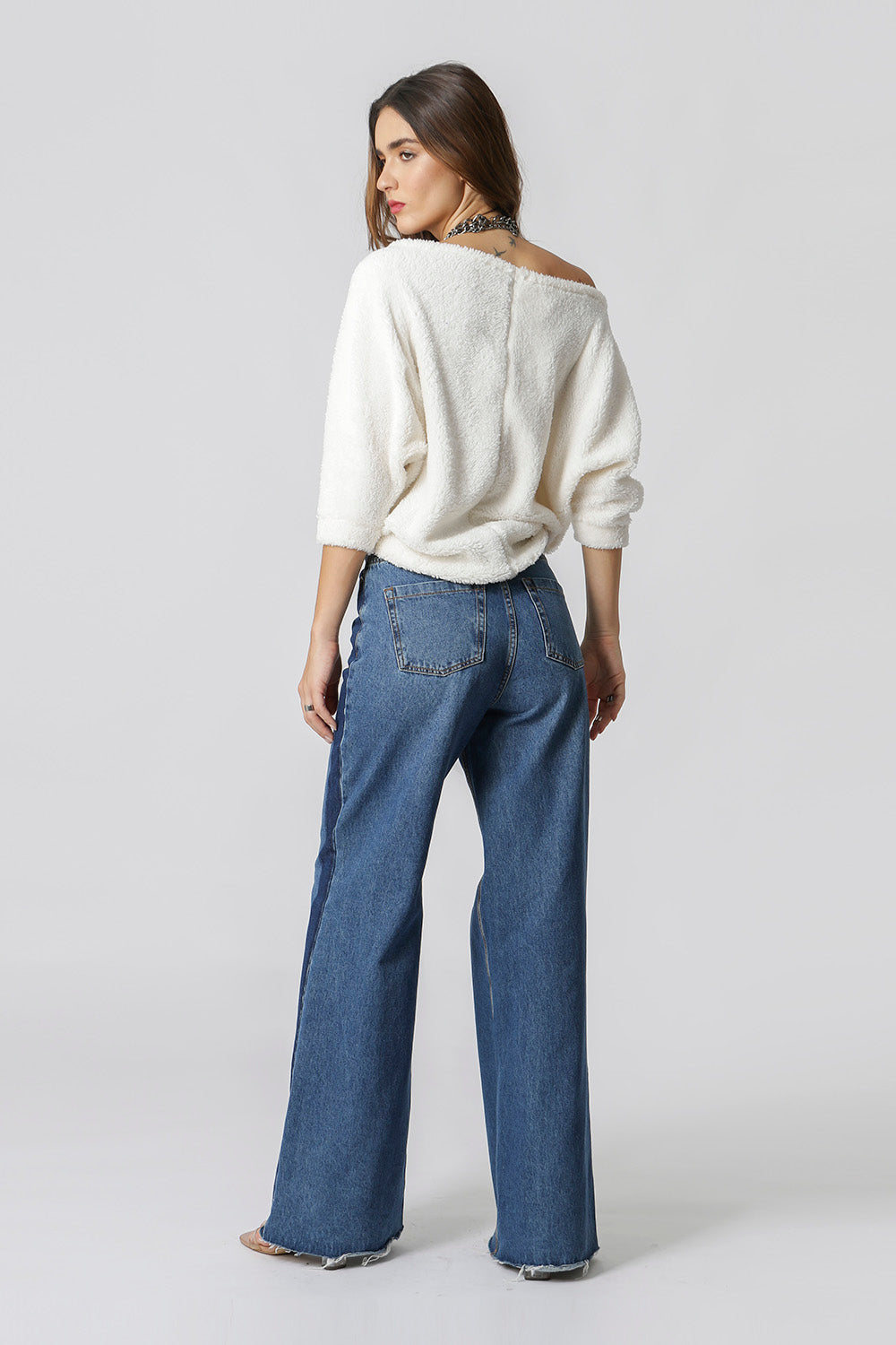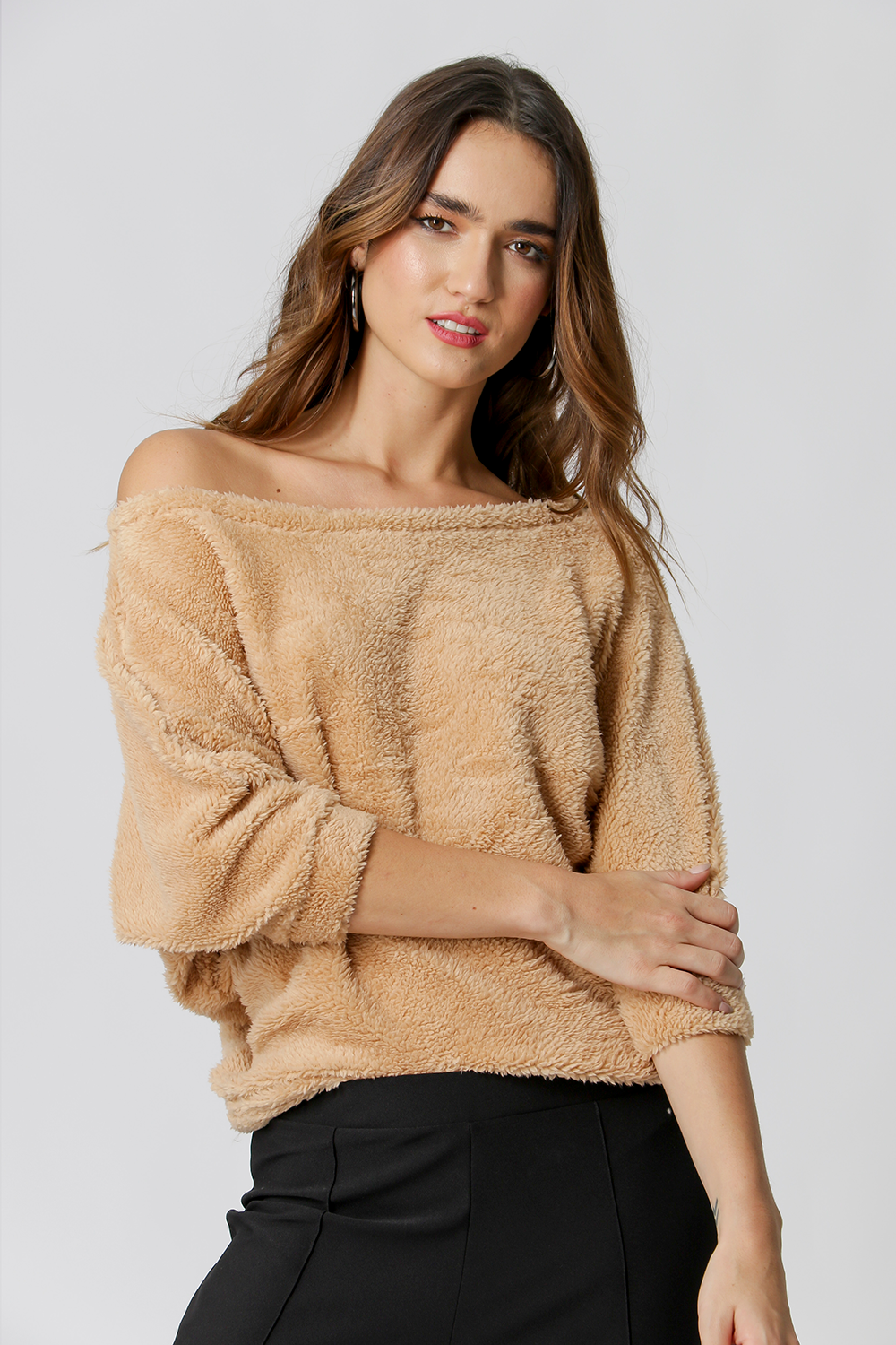 Blusa ampla, com manga 3/4. Confeccionada em tecido floc. Uma peça quentinha, confortável para compor looks de inverno.