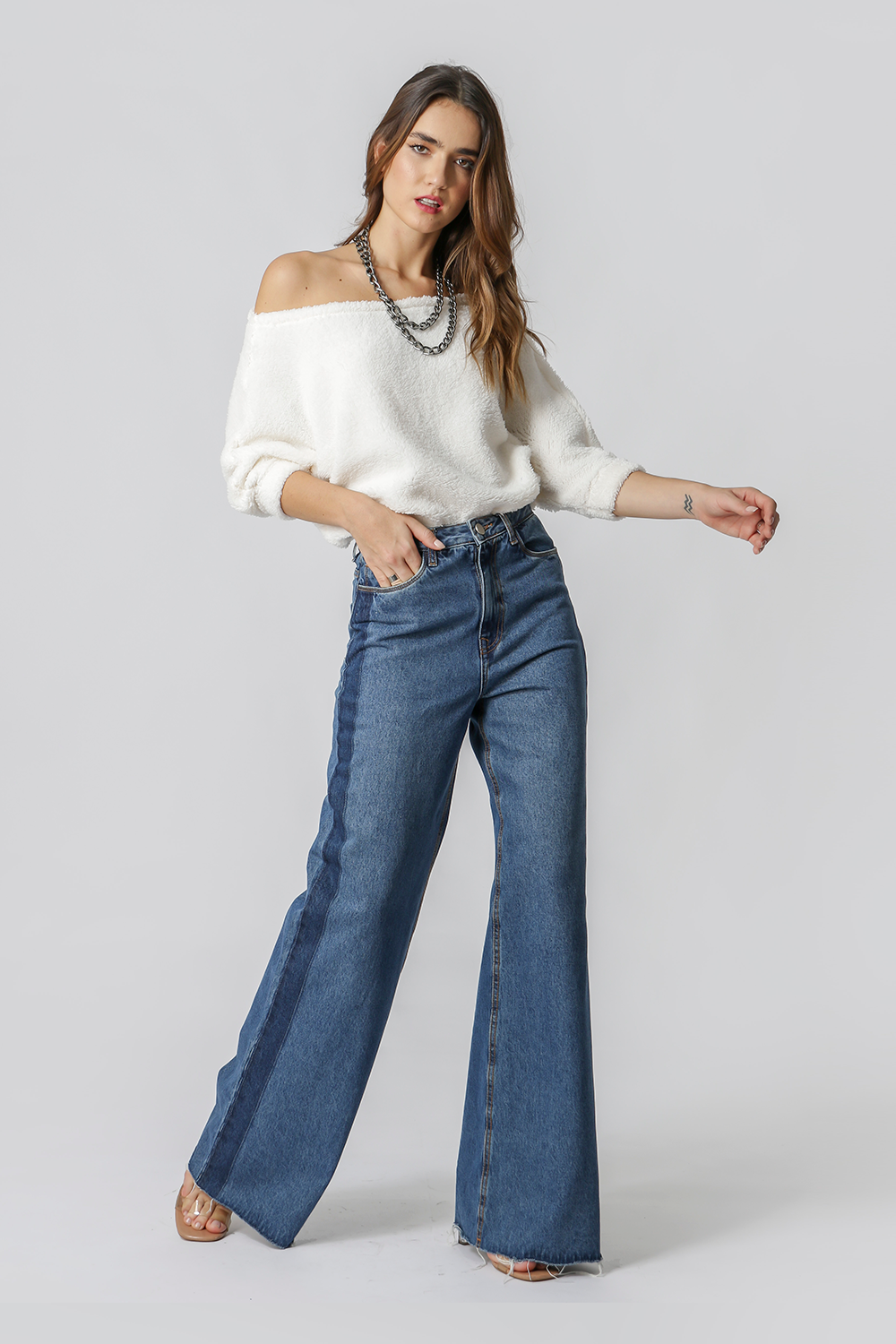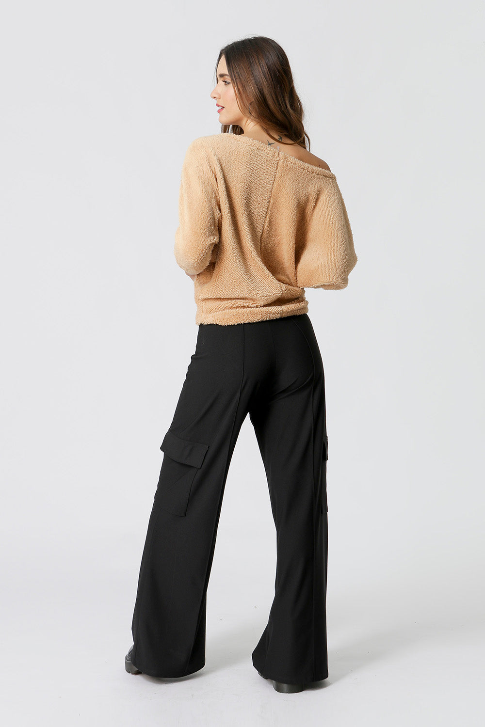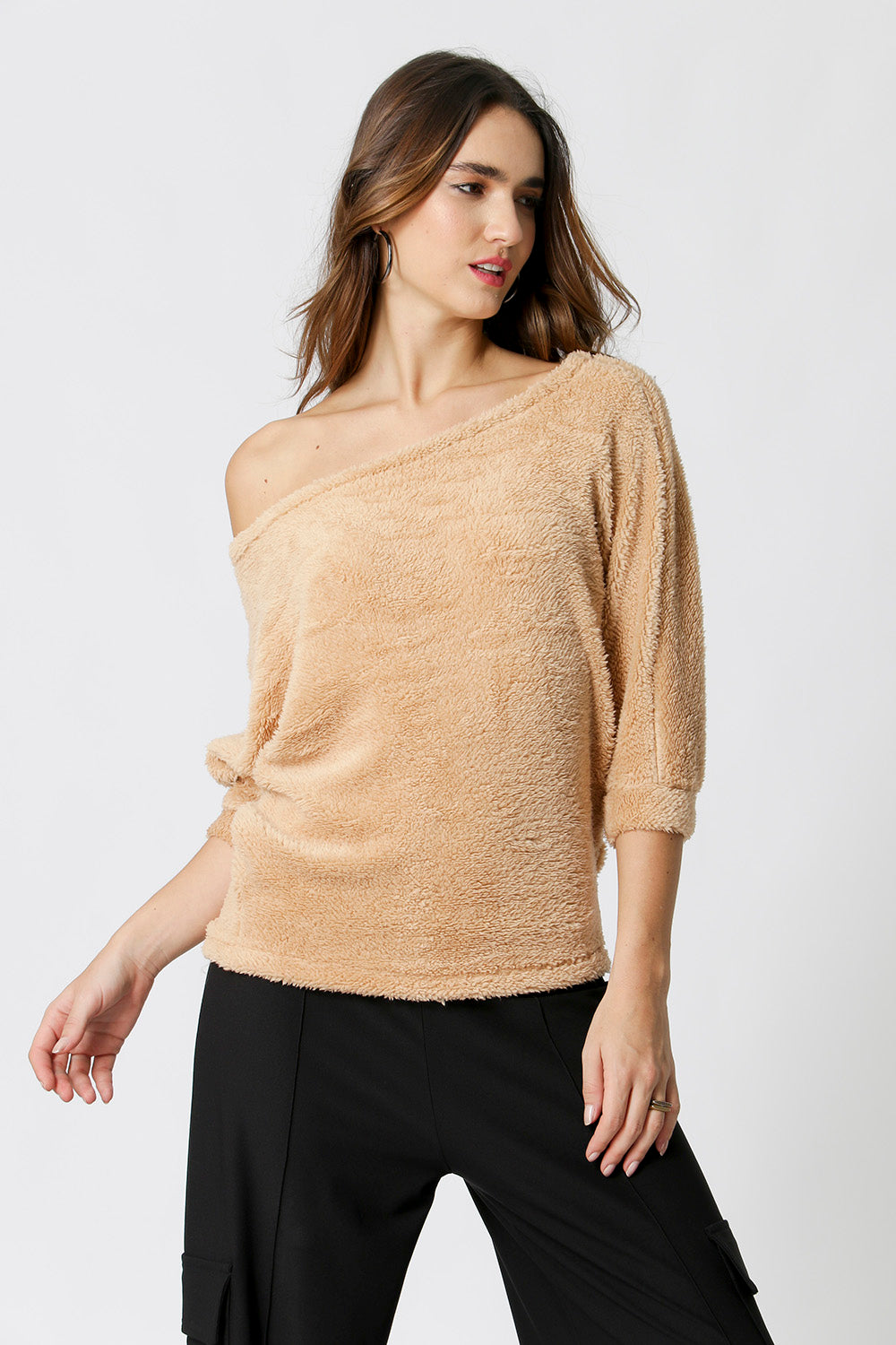 Blusa ampla, com manga 3/4. Confeccionada em tecido floc. Uma peça quentinha, confortável para compor looks de inverno.
