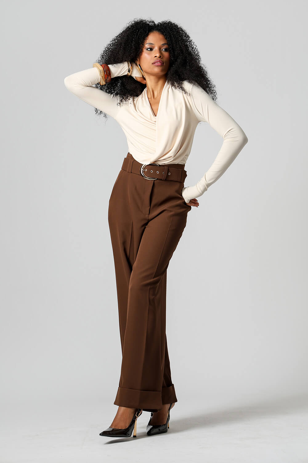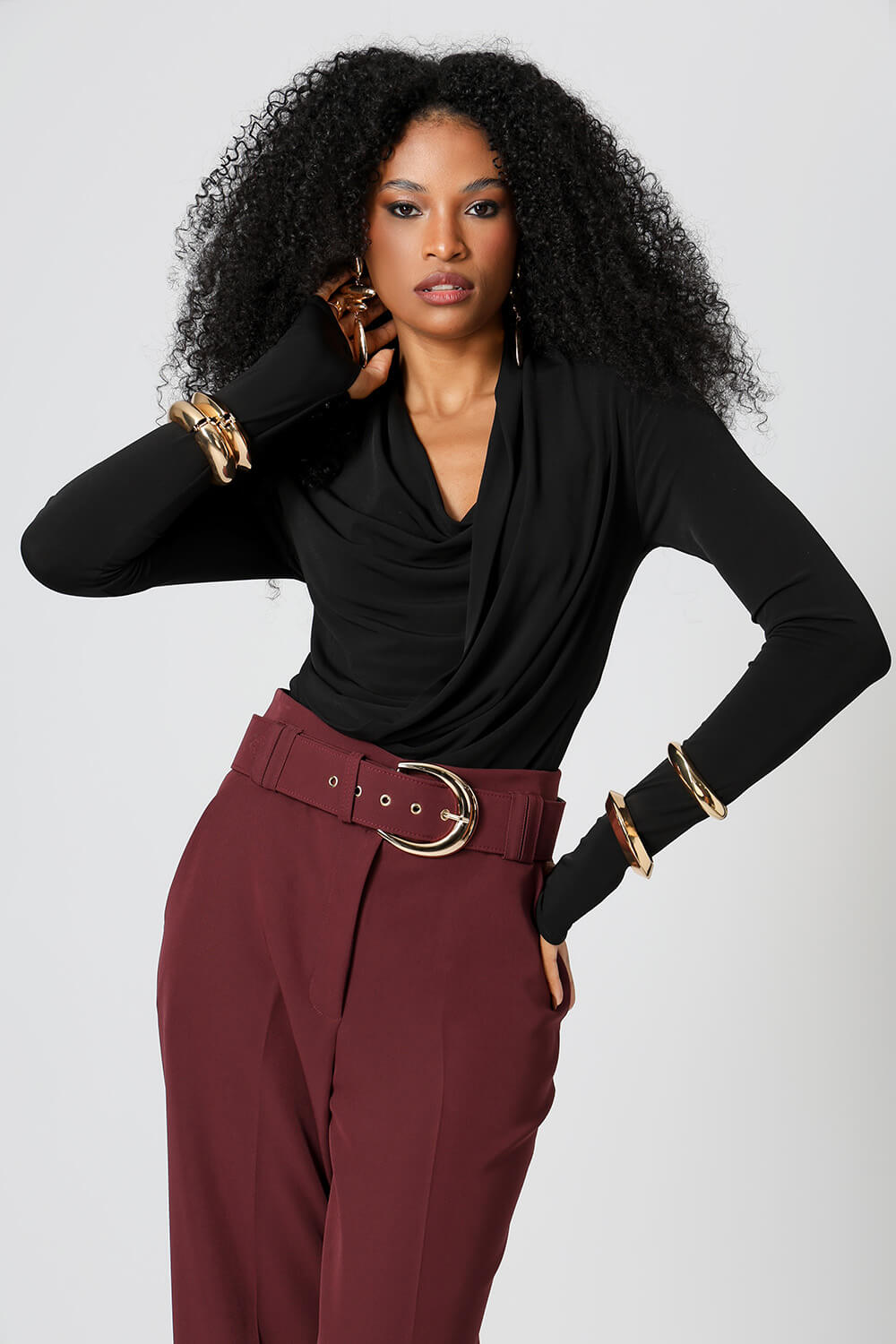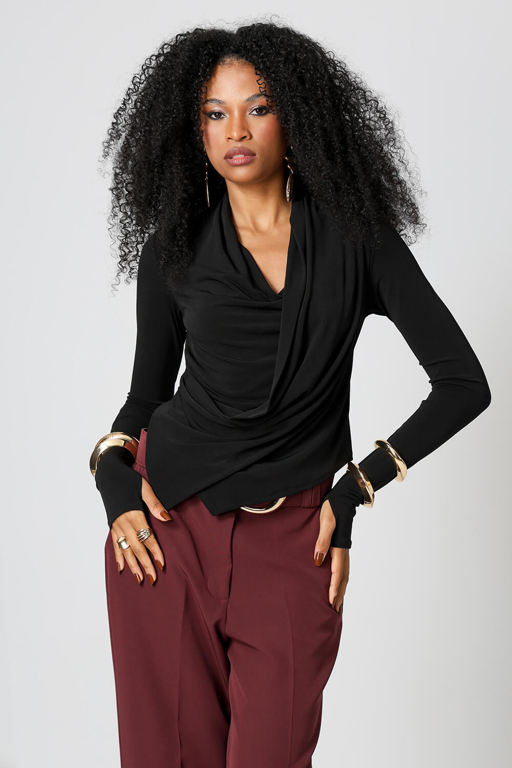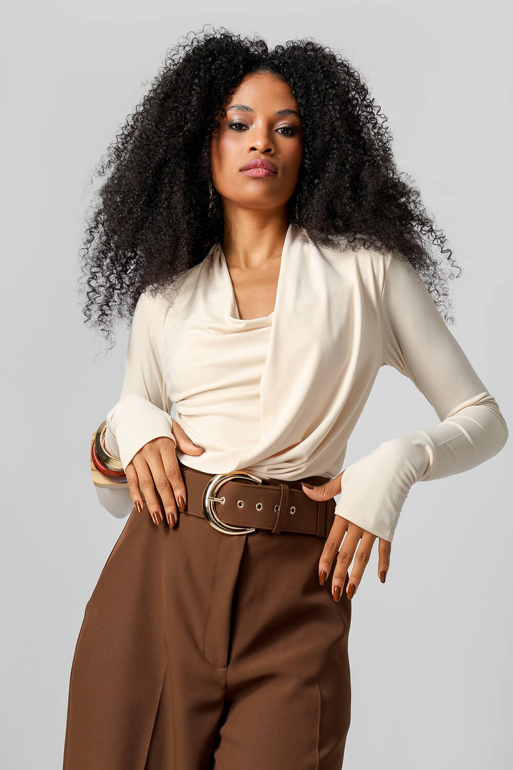 Blusa de manga longa em malha ITY, com modelagem assimétrica que valoriza a silhueta. Possui decote transpassado e drapeado lateral, proporcionando um caimento elegante, confortável e moderno ideal para compor looks sofisticados no dia a dia ou à noite.