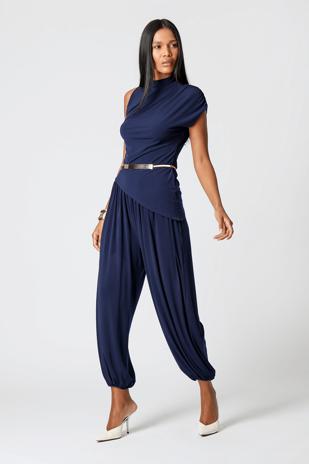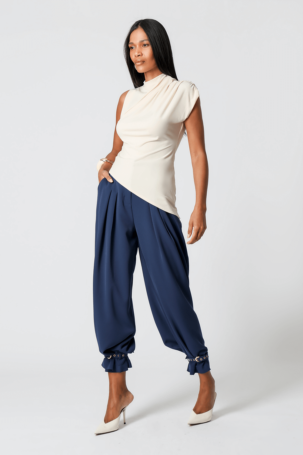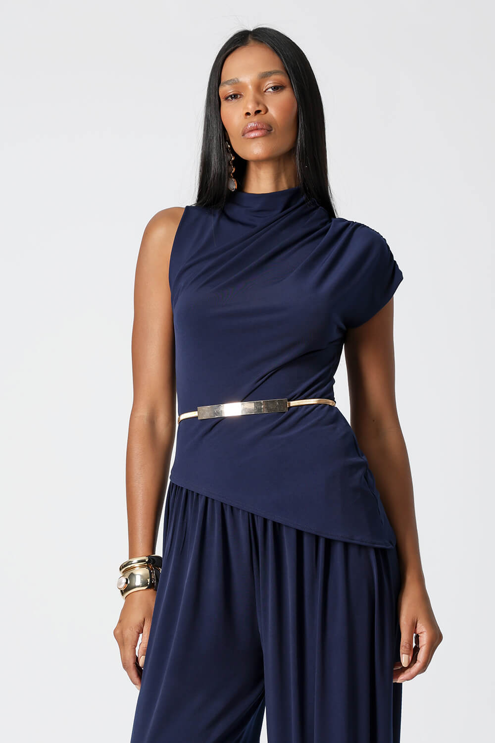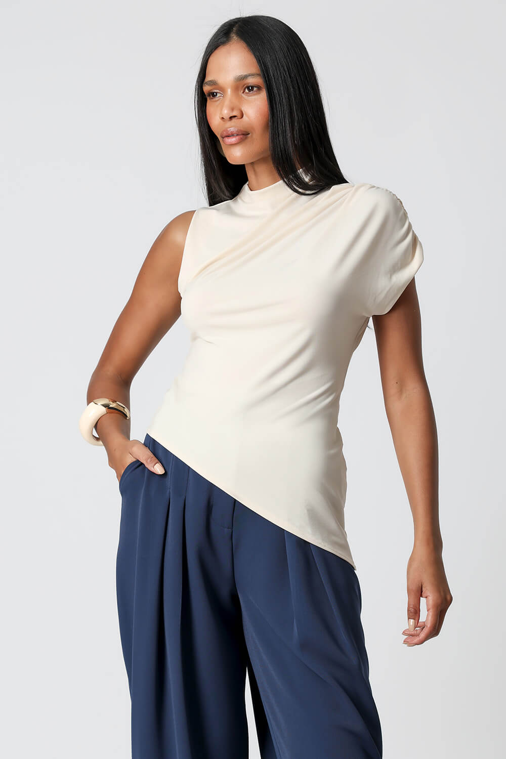 Blusa moderna com design assimétrico e detalhe franzido no ombro, confeccionada em malha ITY de toque macio e caimento leve. Ideal para looks elegantes e confortáveis.
