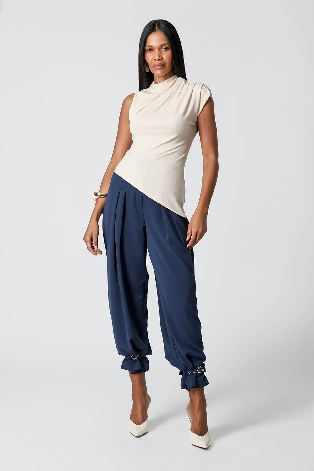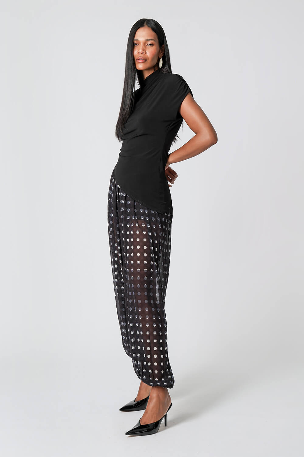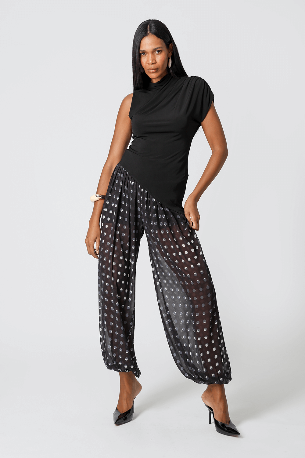 Blusa moderna com design assimétrico e detalhe franzido no ombro, confeccionada em malha ITY de toque macio e caimento leve. Ideal para looks elegantes e confortáveis.