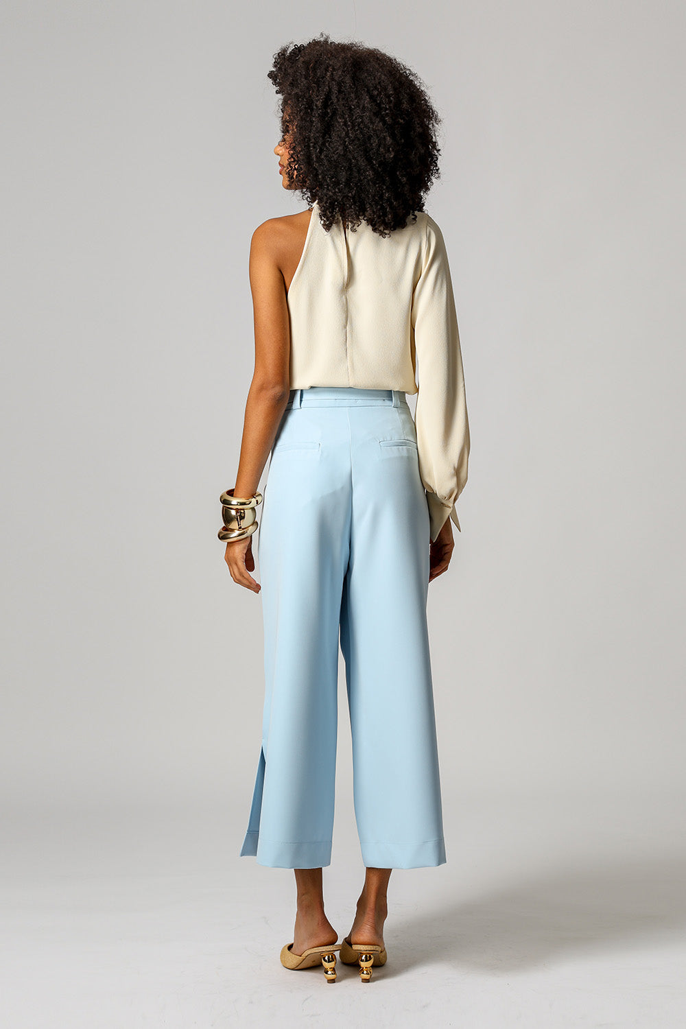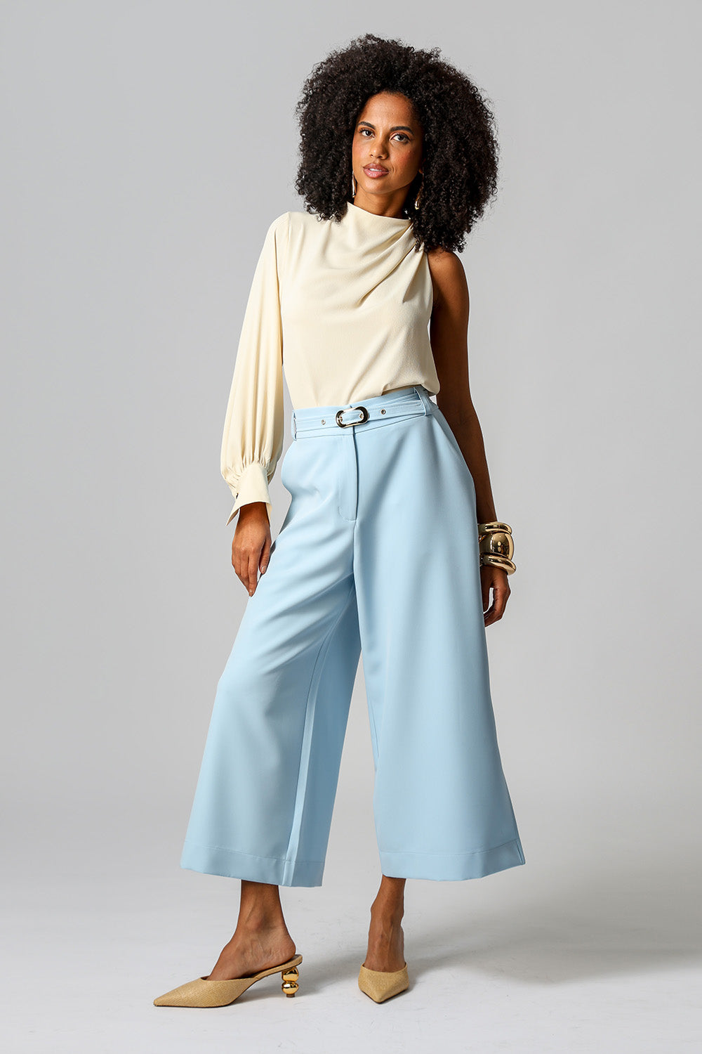 Blusa em cetim bubble com uma manga, barra assimétrica e prega na gola que cria volume frontal. Sofisticada e moderna, ideal para looks elegantes com toque fashion.