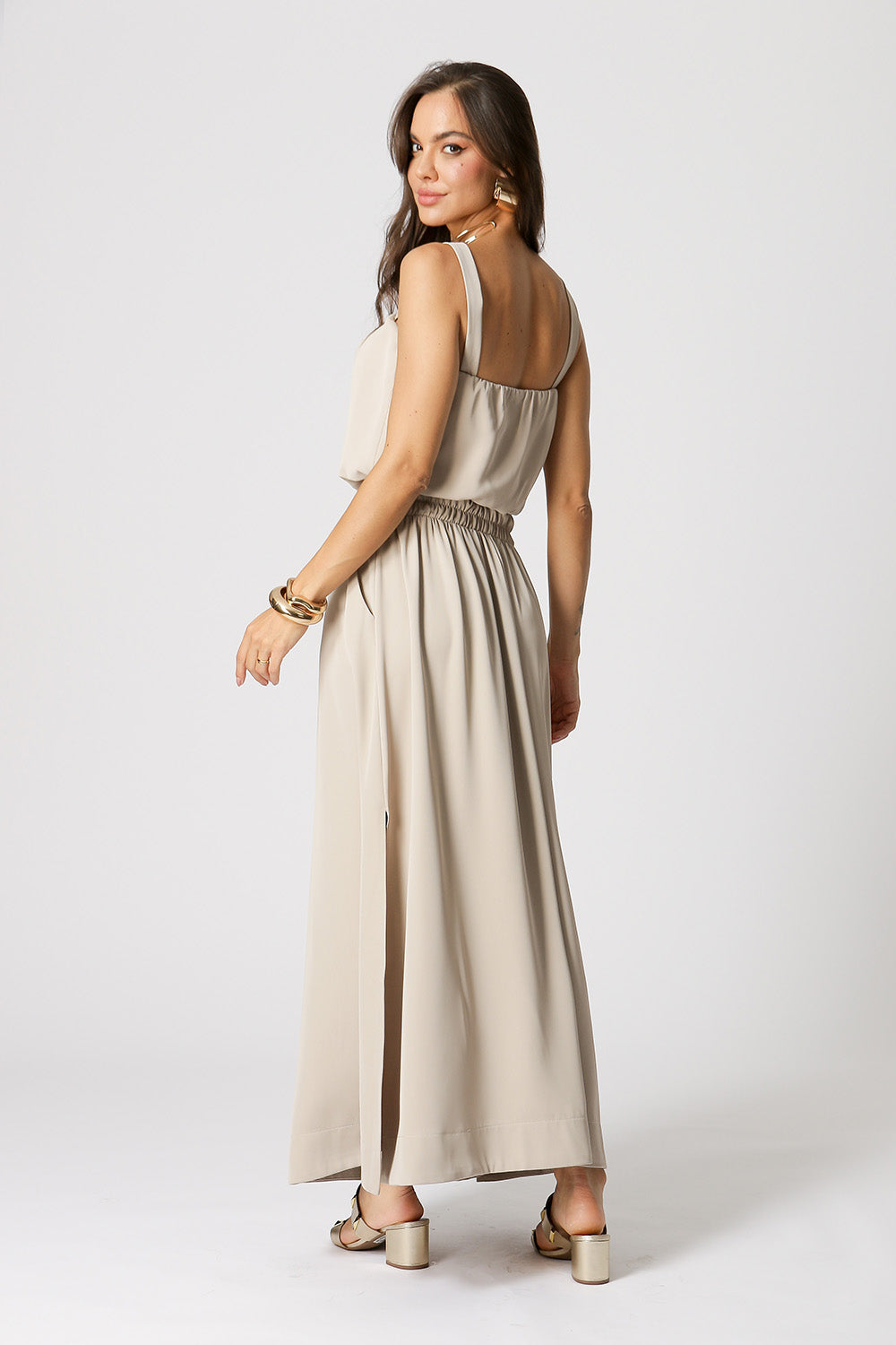 Possui balonê na parte inferior, pregas no decote e forro em malha de viscose