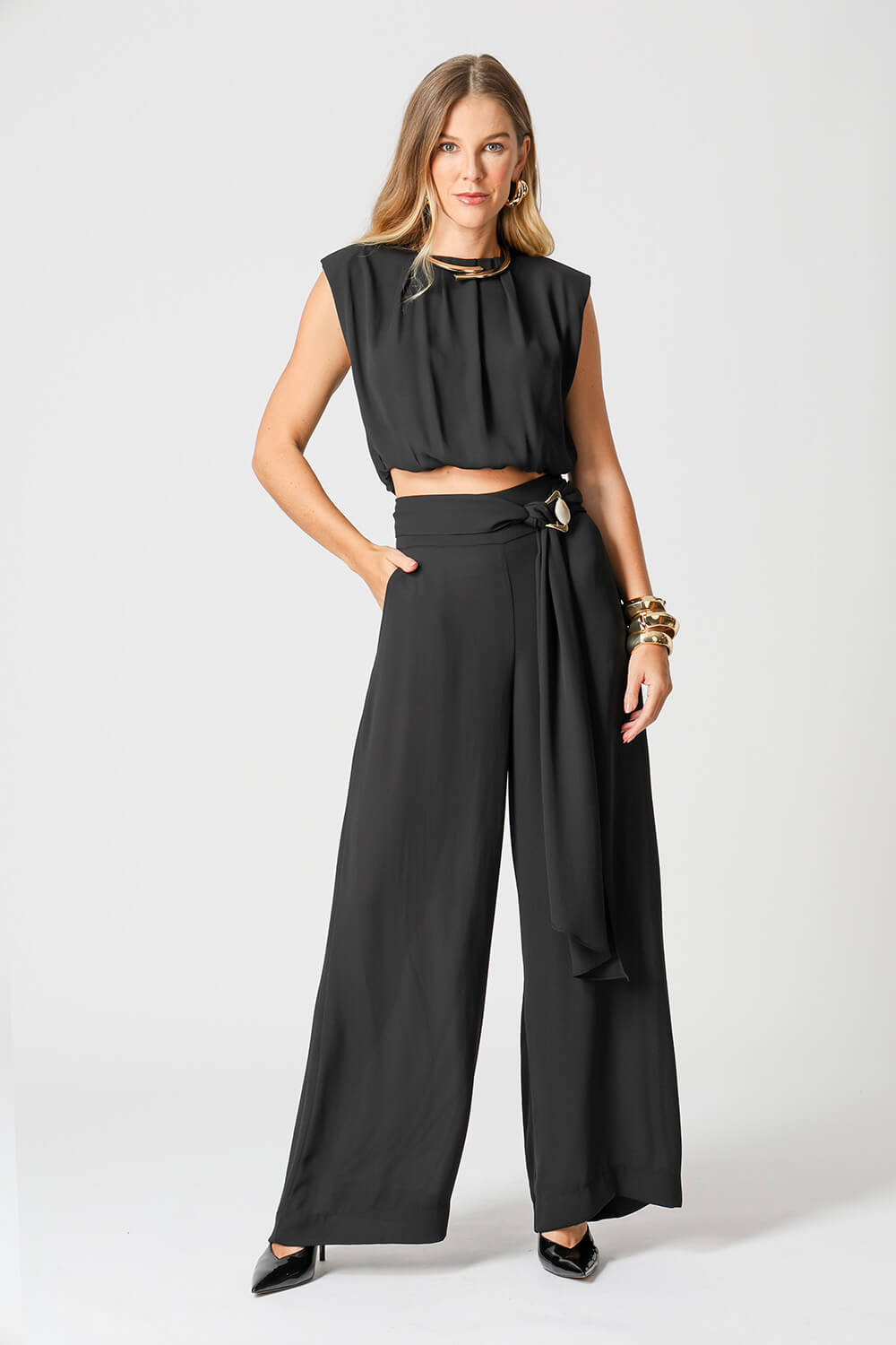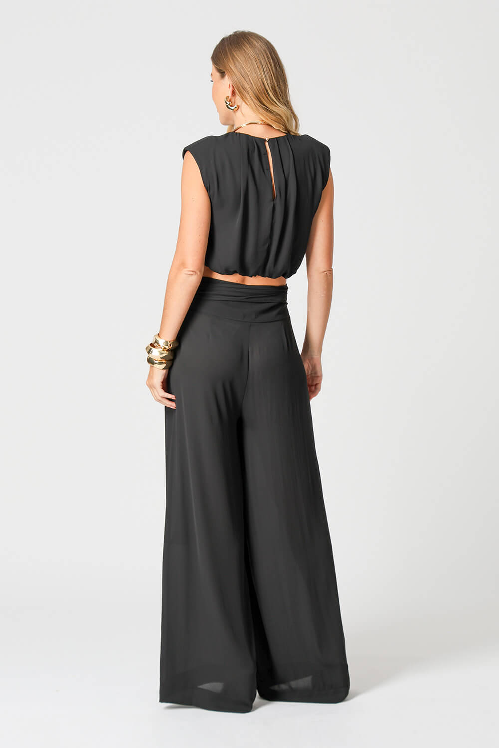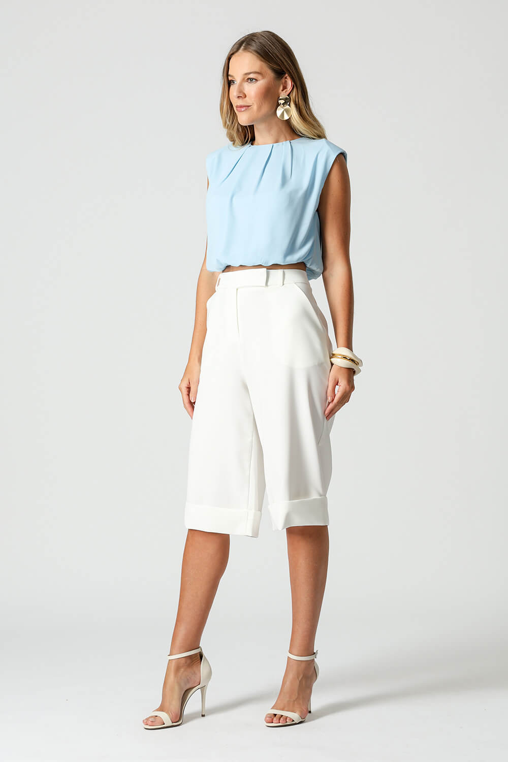 Blusa em crepe fluido com modelagem balonê, ombreiras que valorizam a estrutura dos ombros e pregas delicadas no decote. Peça sofisticada, leve e perfeita para looks elegantes com toque moderno.