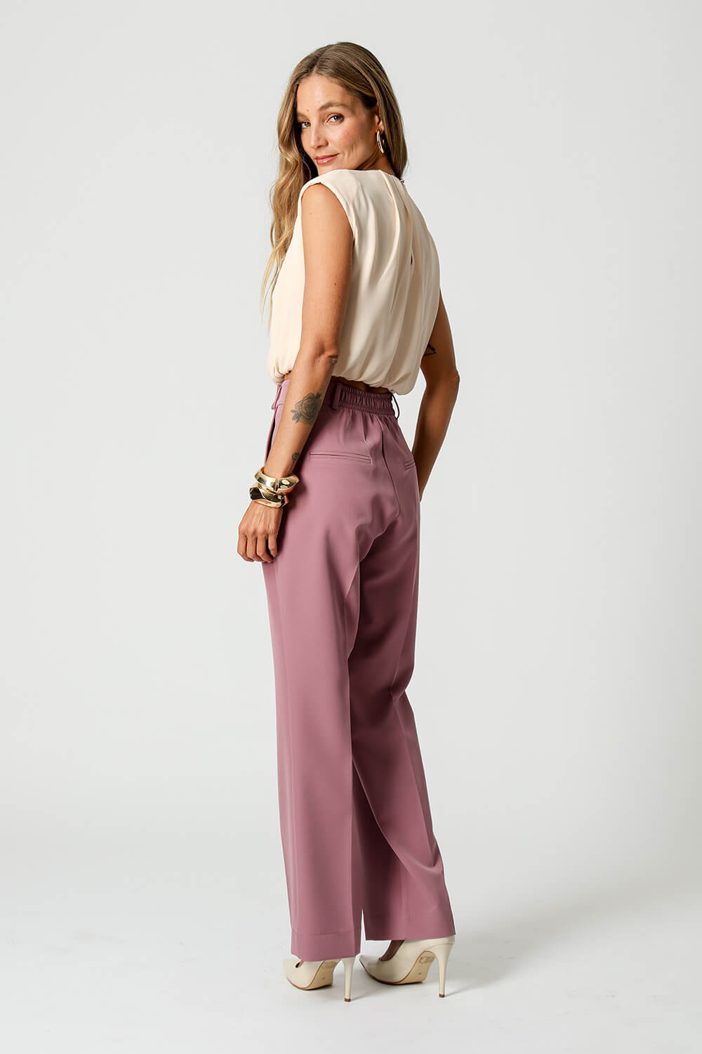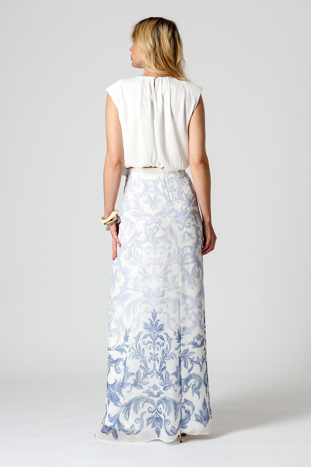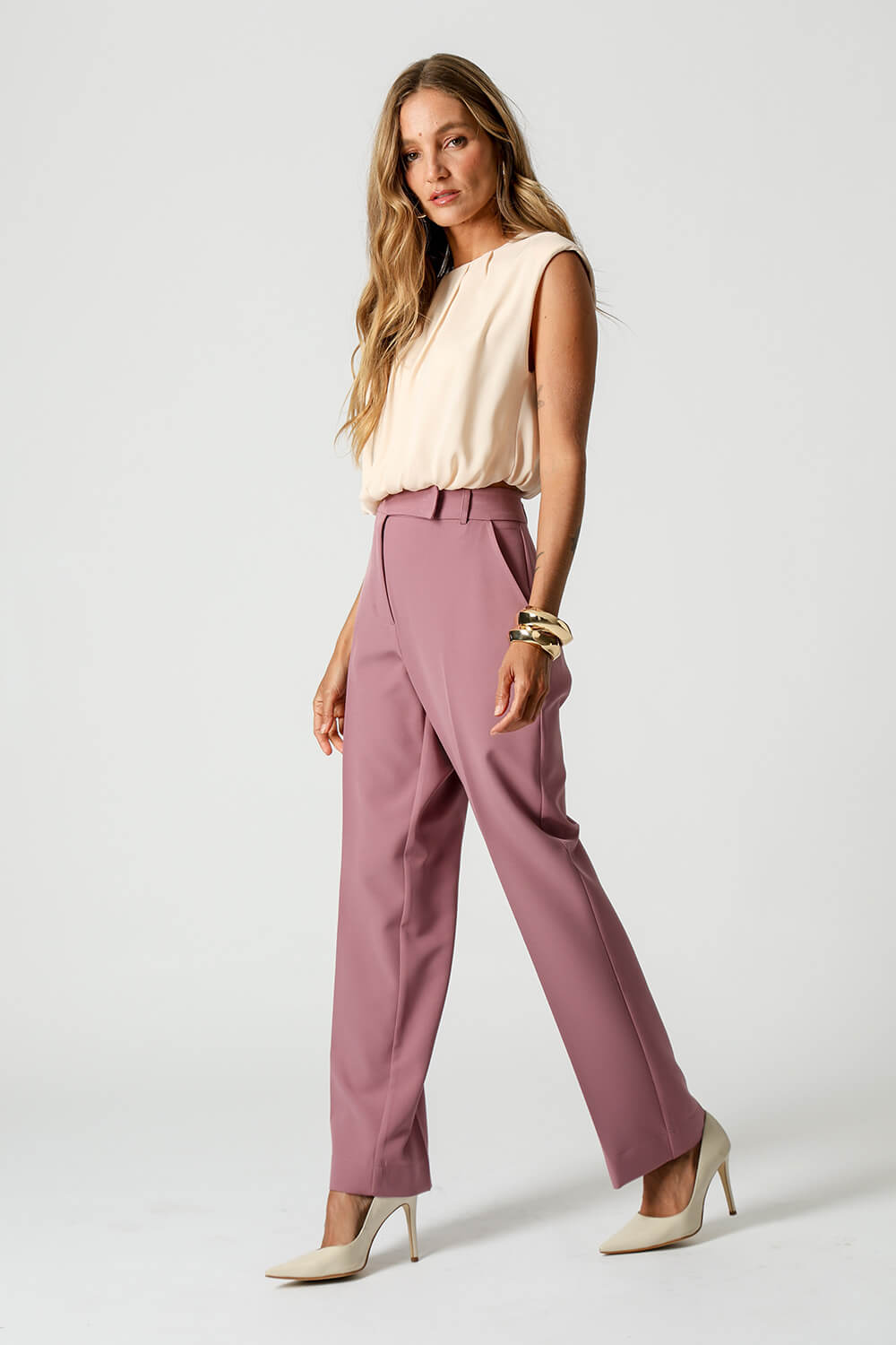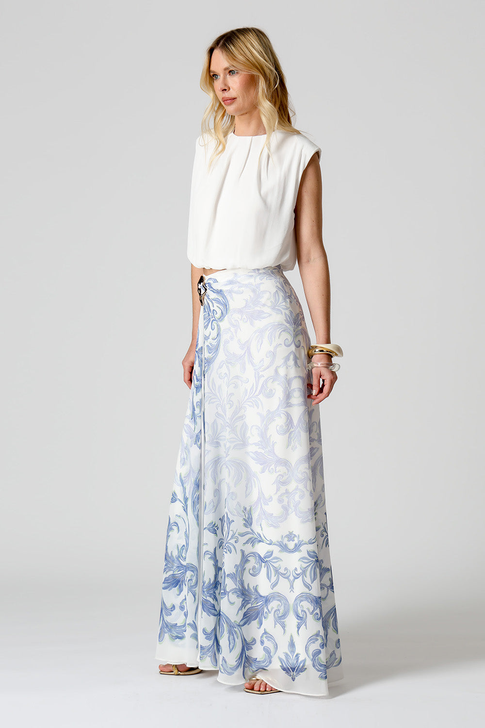 Blusa em crepe fluido com modelagem balonê, ombreiras que valorizam a estrutura dos ombros e pregas delicadas no decote. Peça sofisticada, leve e perfeita para looks elegantes com toque moderno.