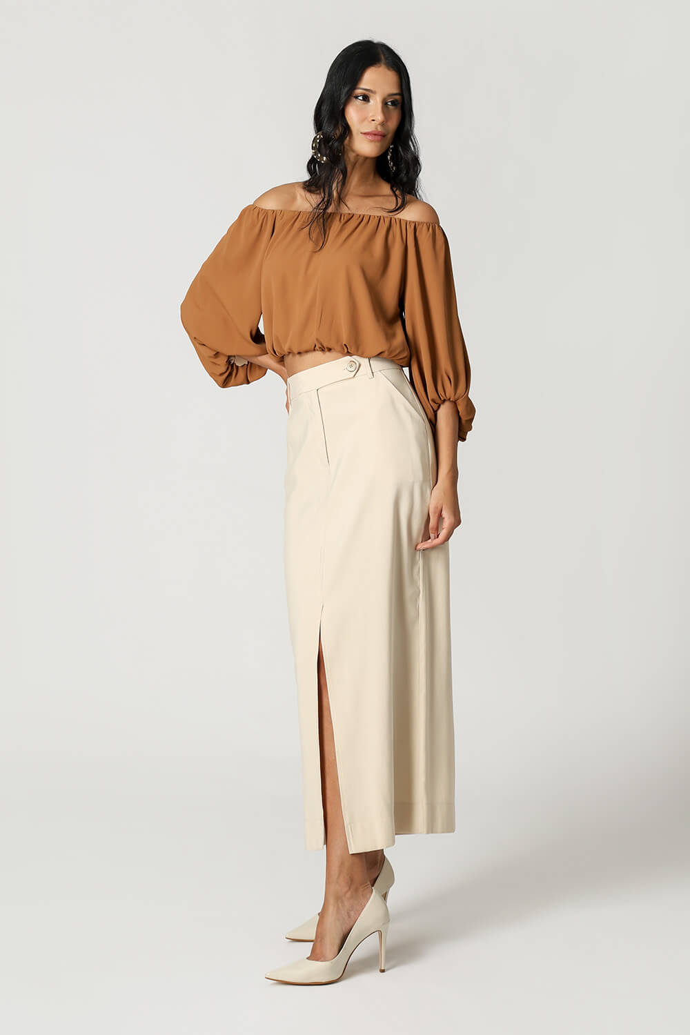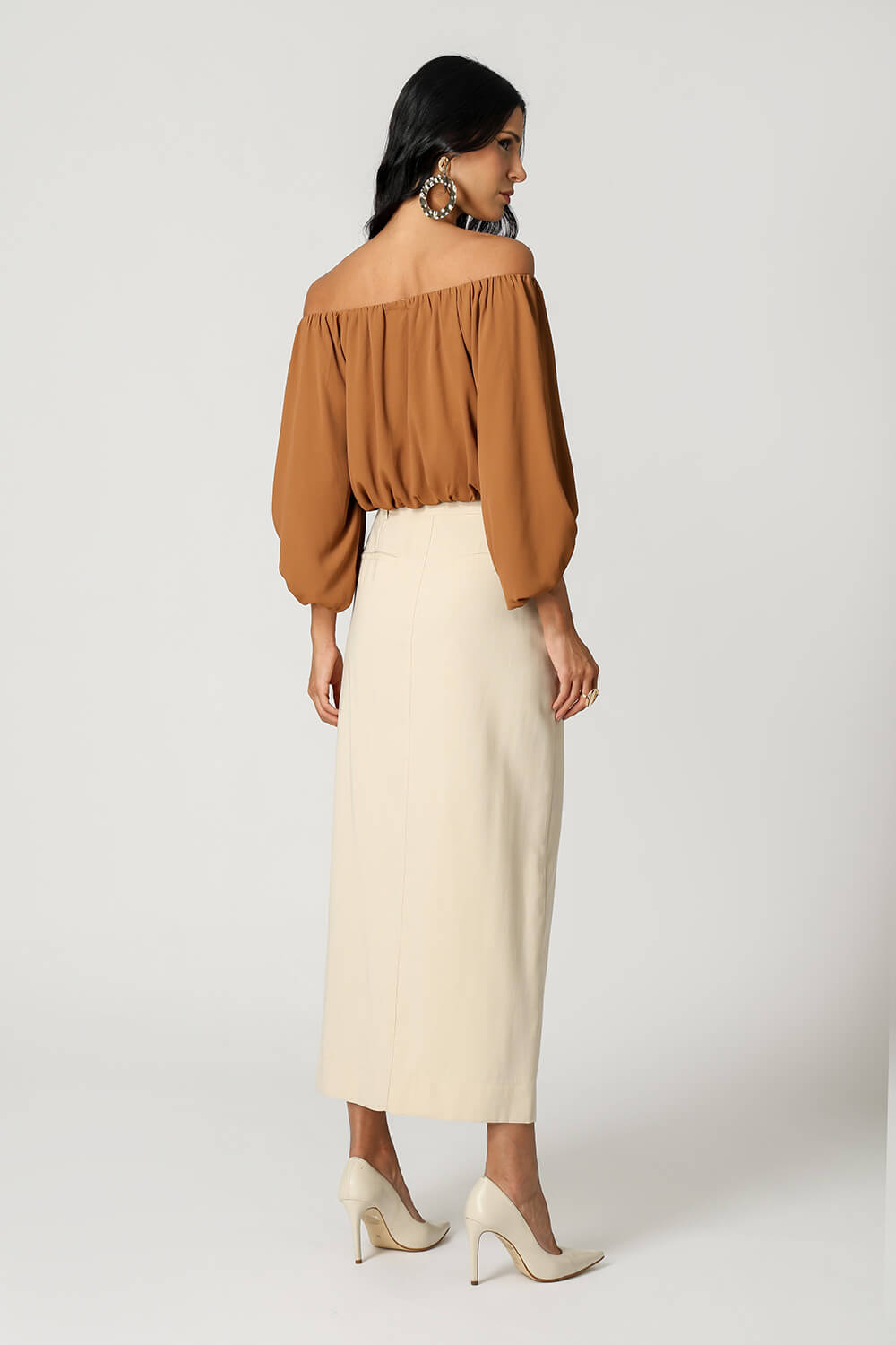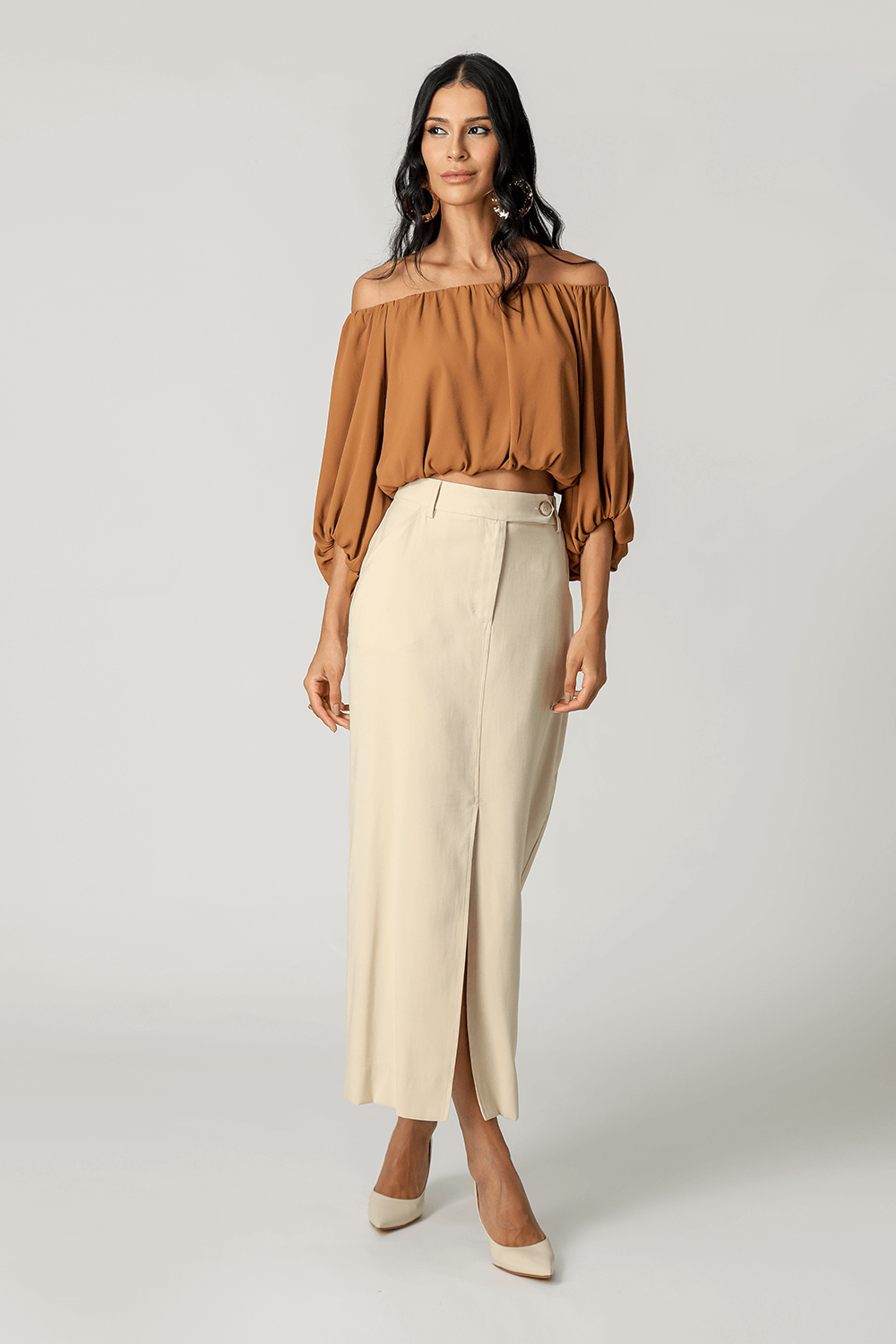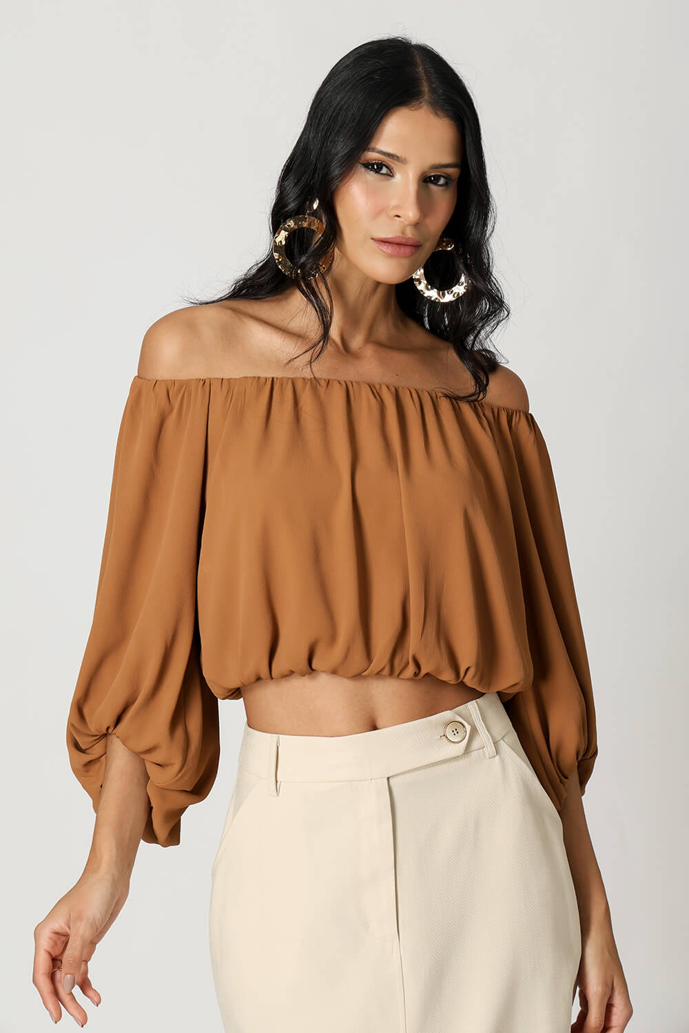 Blusa balonê ombro a ombro, as mangas volumosas trazem um toque feminino e cheio de personalidade, criando um visual descontraído e charmoso.