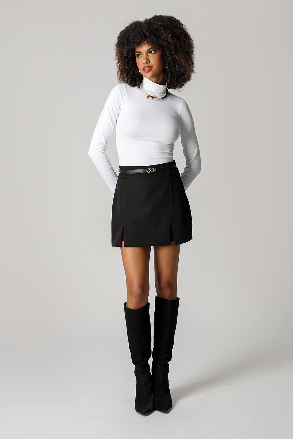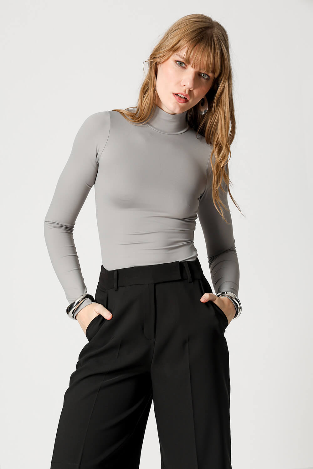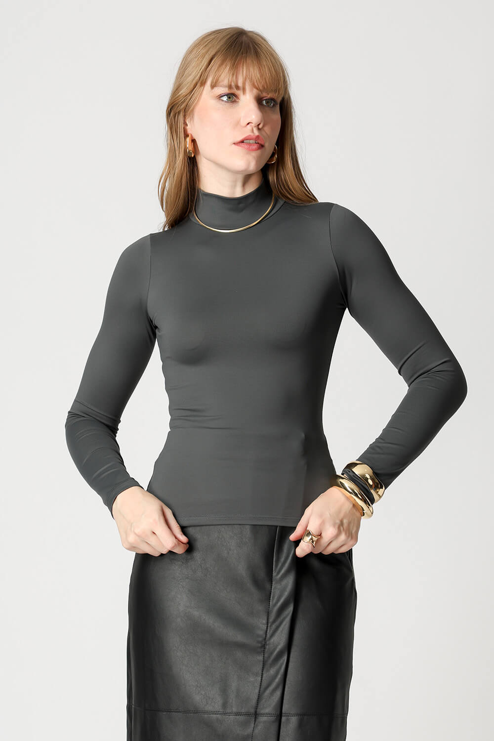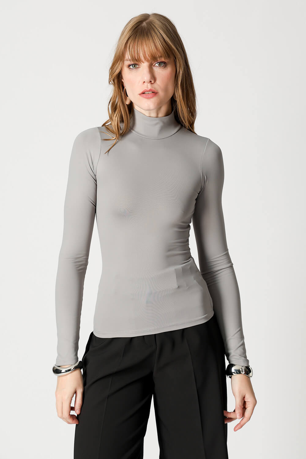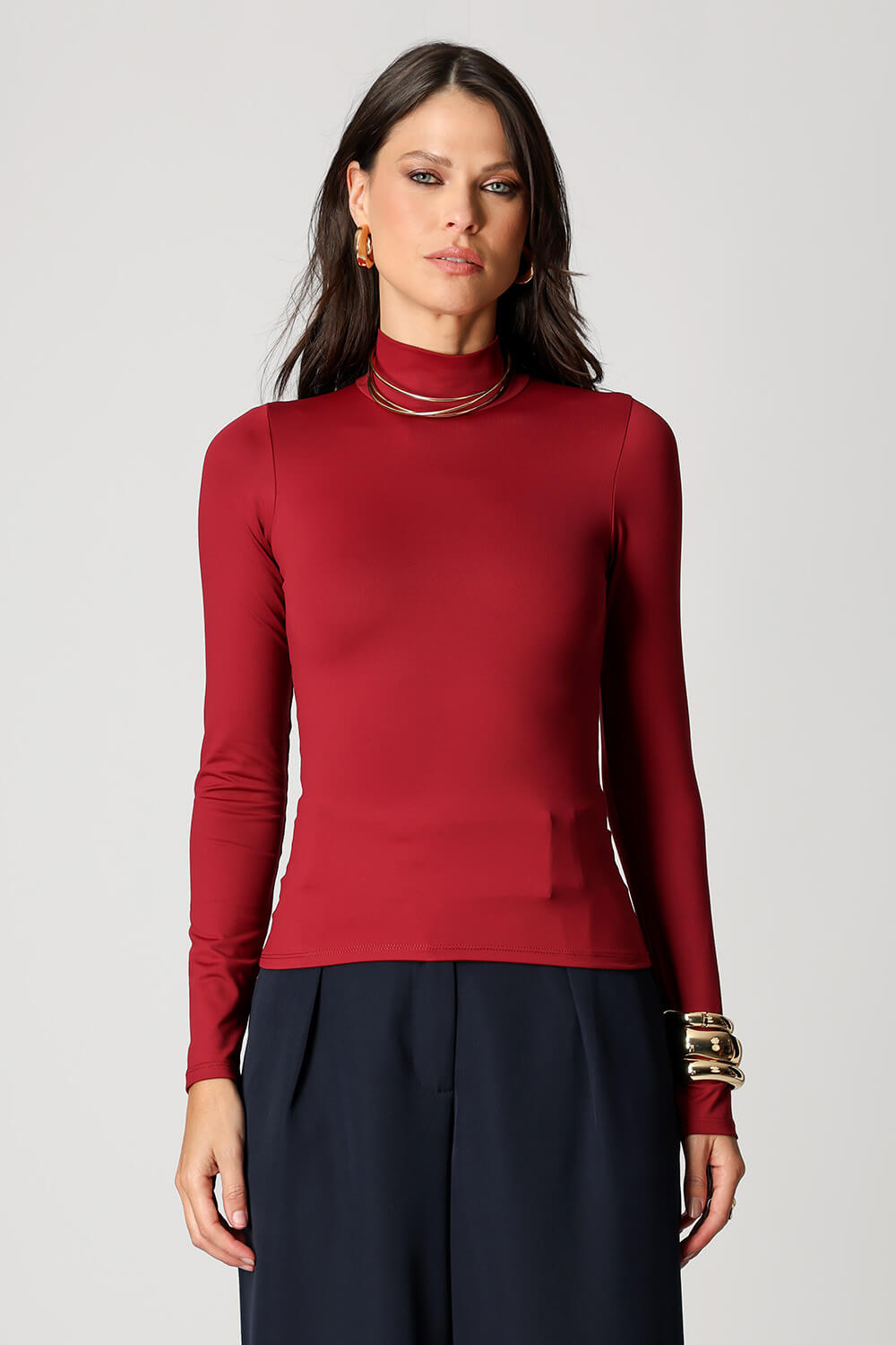 Blusa básica em shape que modela o corpo, manga longa e gola alta. Peça ideal para trabalhar looks com sobreposições. Peça confeccionada em malha de Amni.