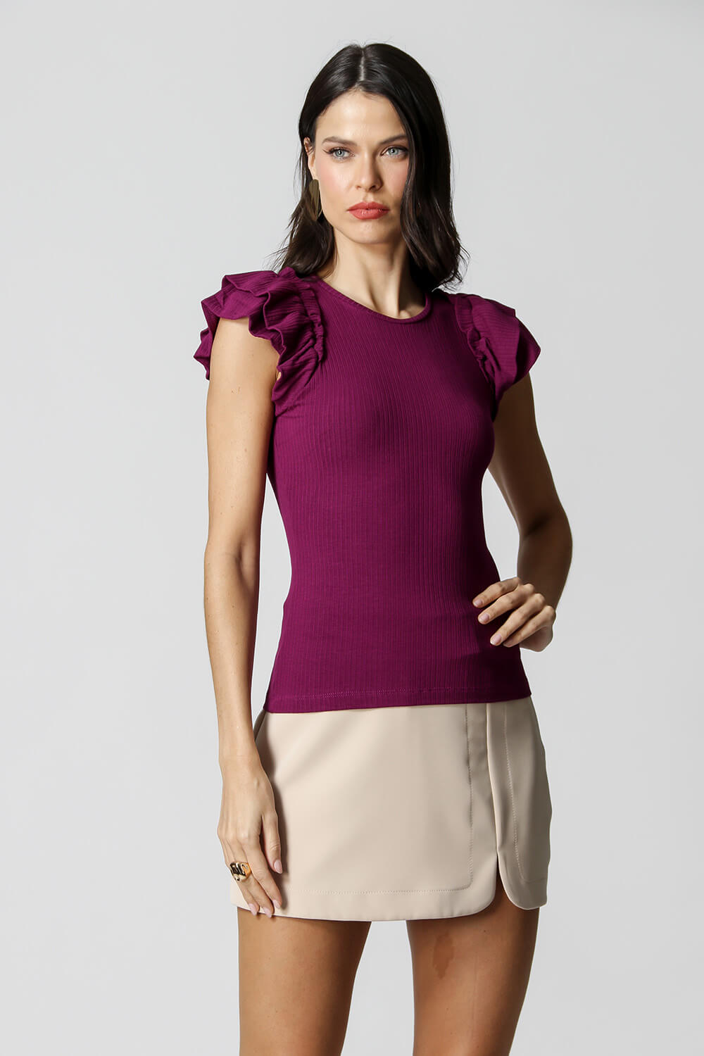 Blusa feita em malha canelada, com shape ajustado, mangas curtas com 2 camadas de babados. Uma peça única com muito charme, deixando o look atual e pronta para qualquer ocasião.