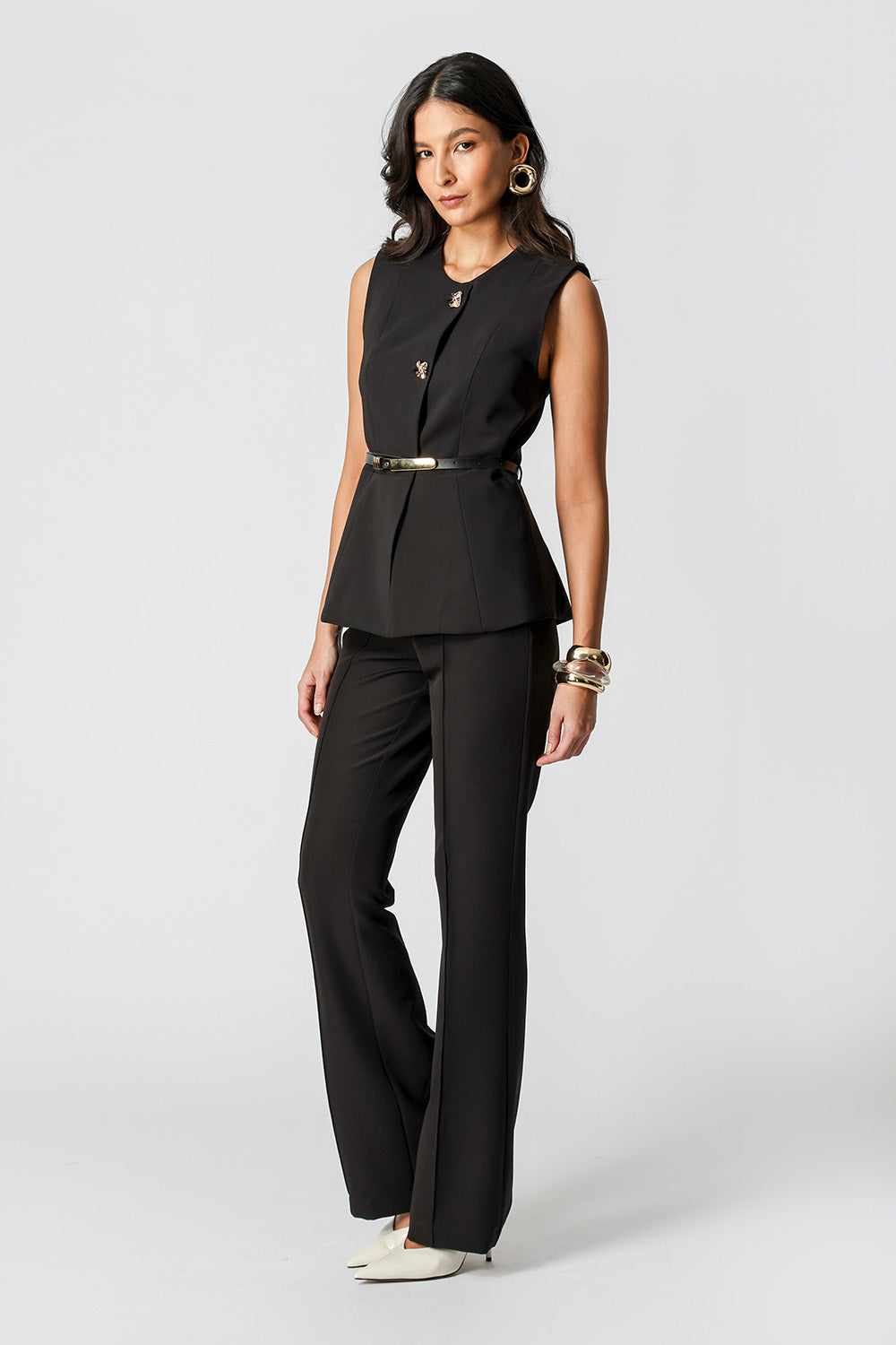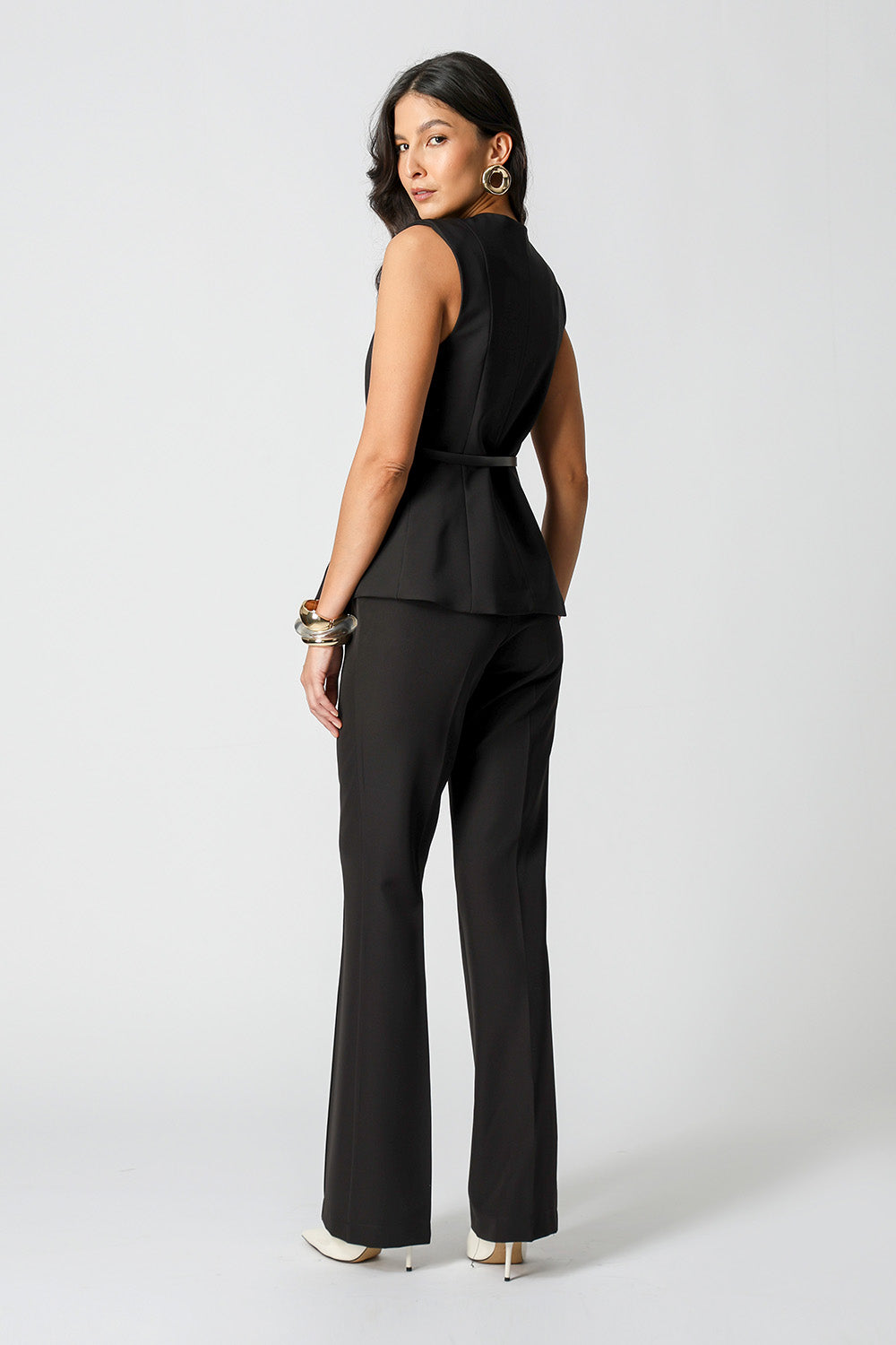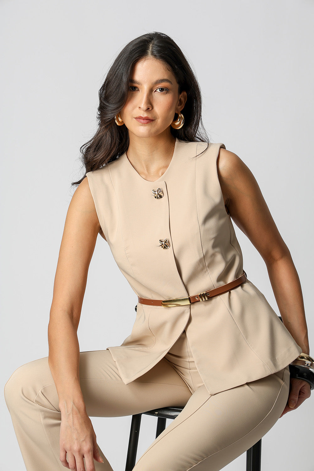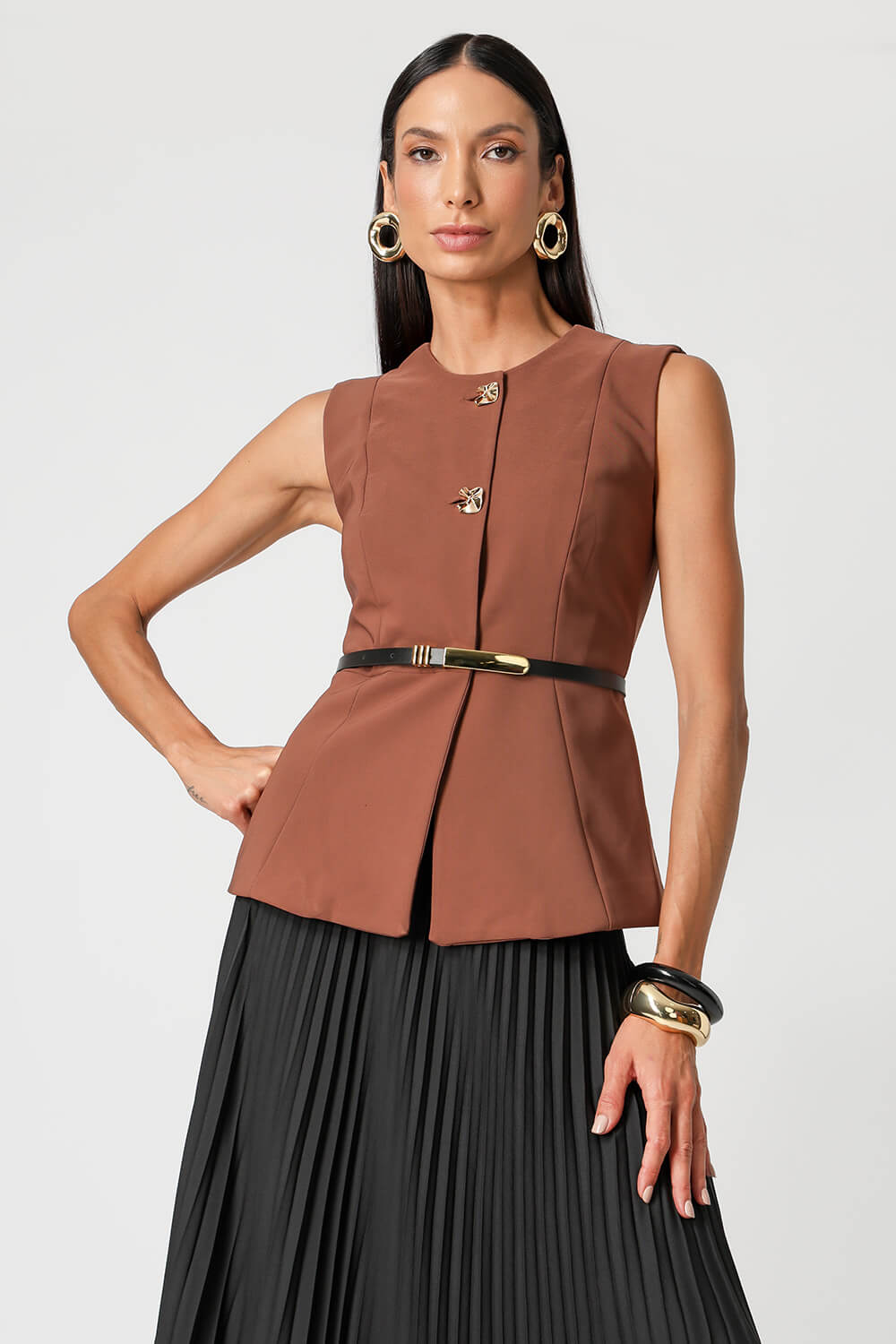 Blusa colete em tecido de alfaiataria com recortes que valorizam a silhueta. Modelo acinturado com fechamento frontal por 3 botões na parte superior, unindo elegância e modernidade em uma peça versátil.