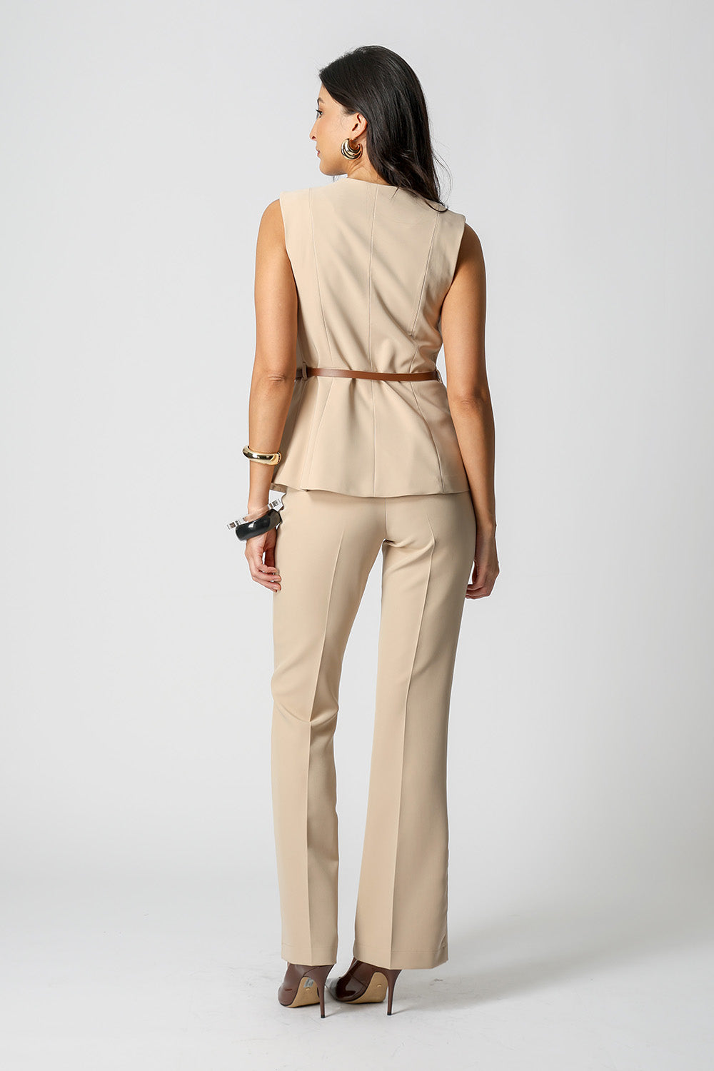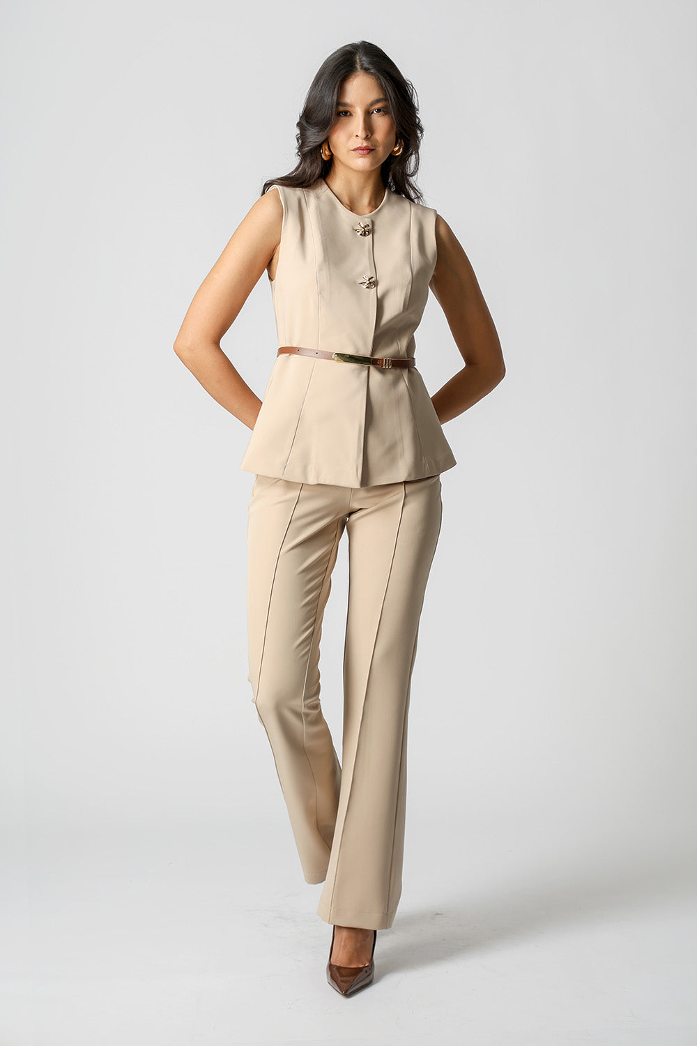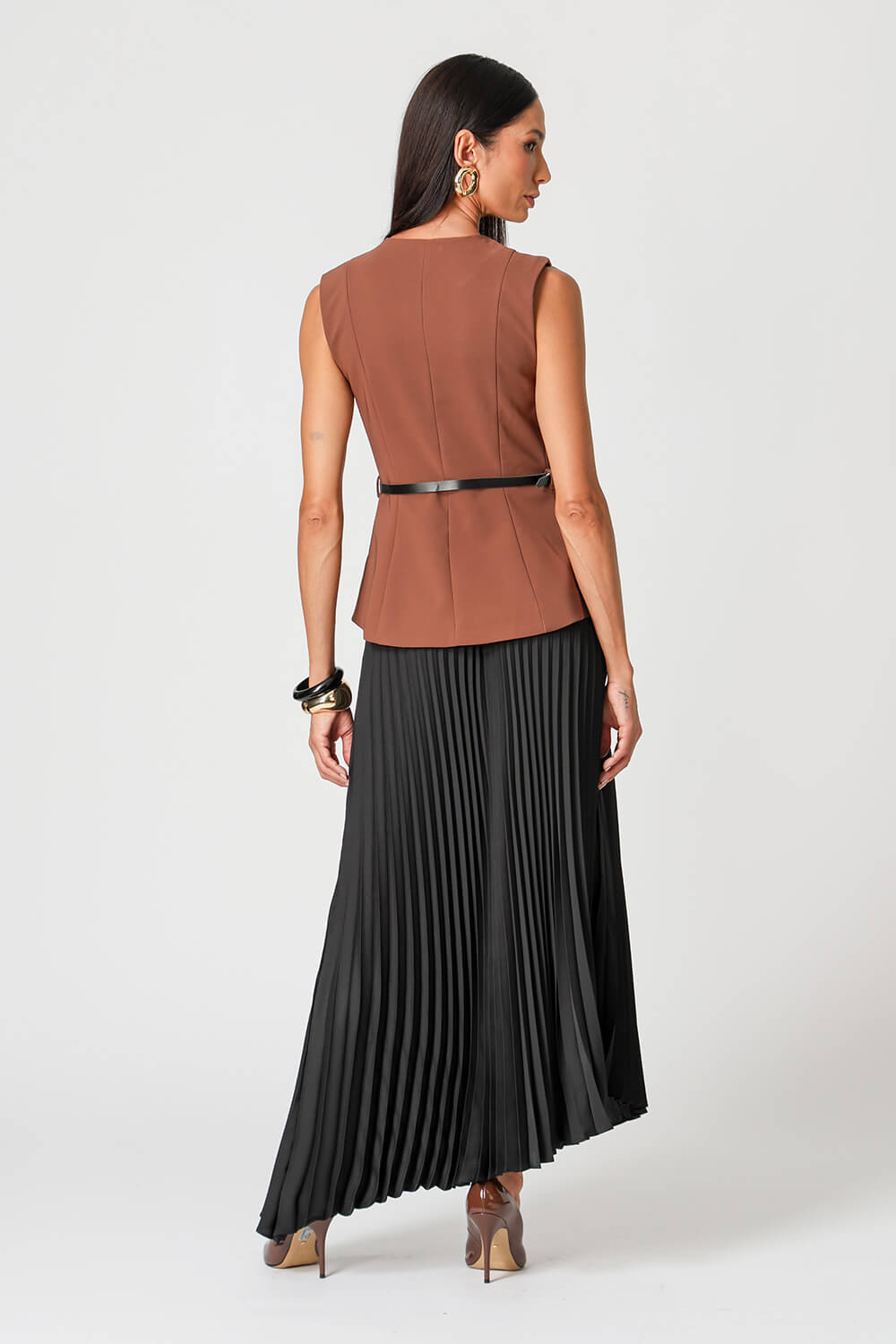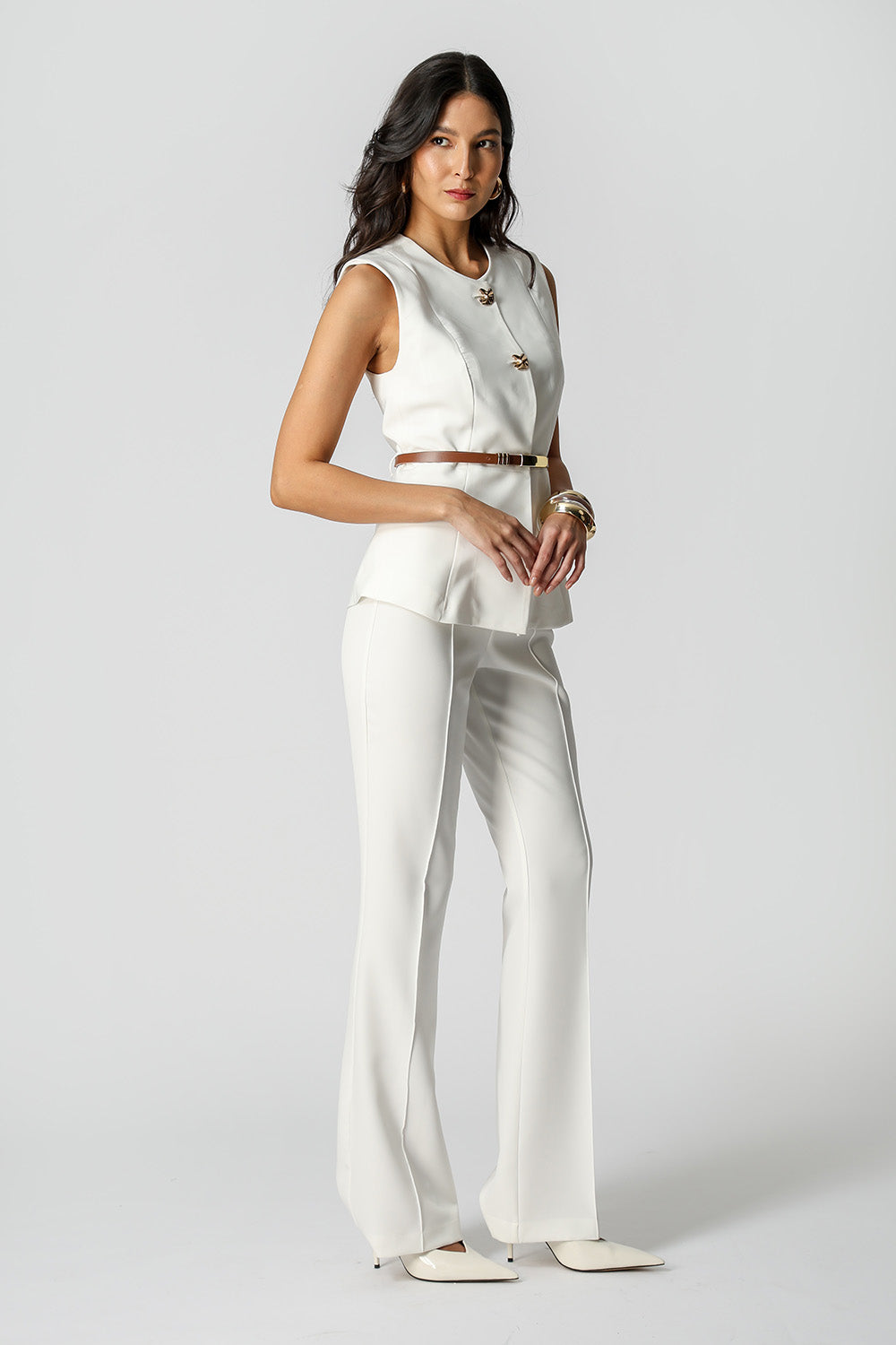 Blusa colete em tecido de alfaiataria com recortes que valorizam a silhueta. Modelo acinturado com fechamento frontal por 3 botões na parte superior, unindo elegância e modernidade em uma peça versátil.