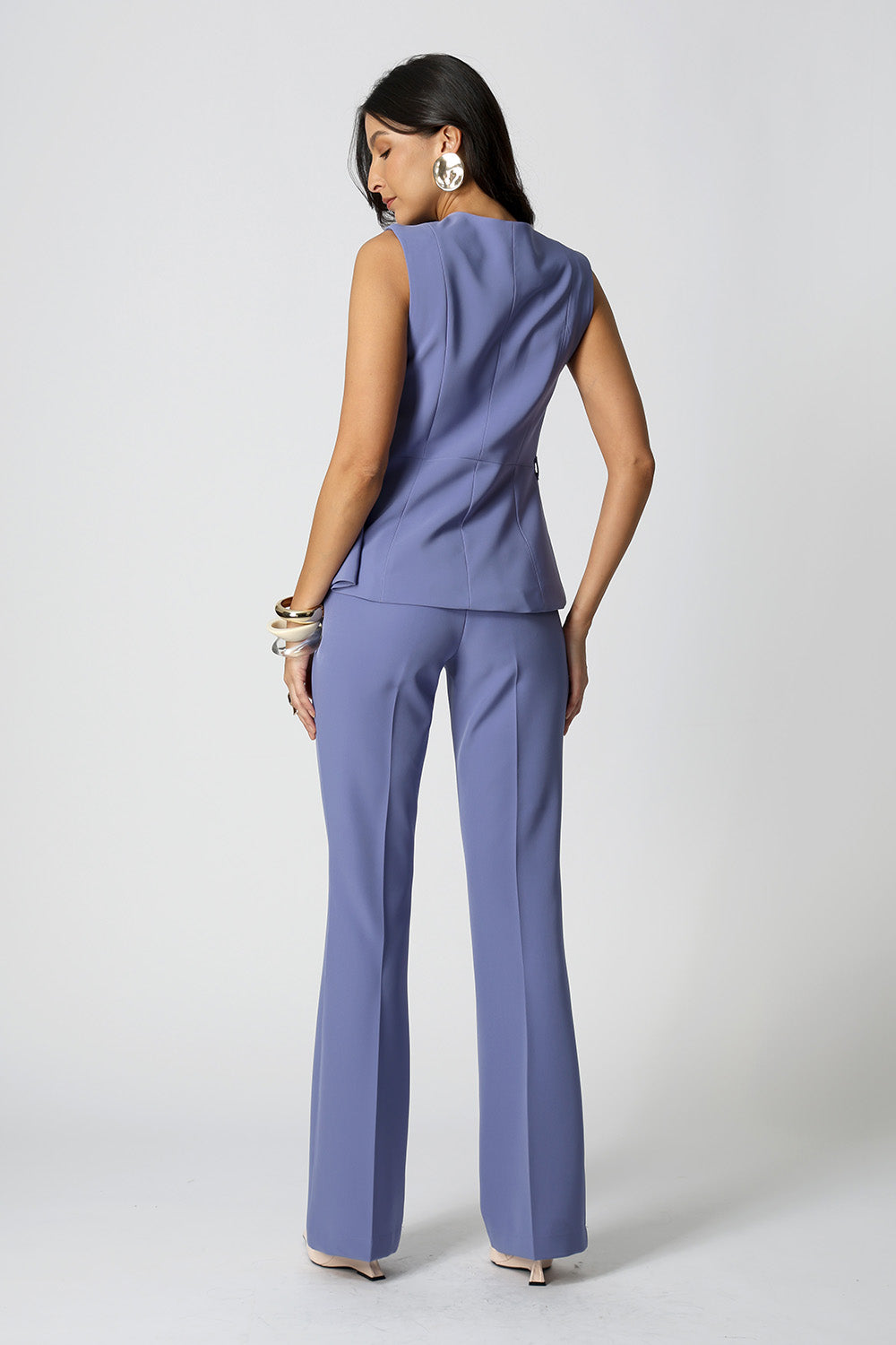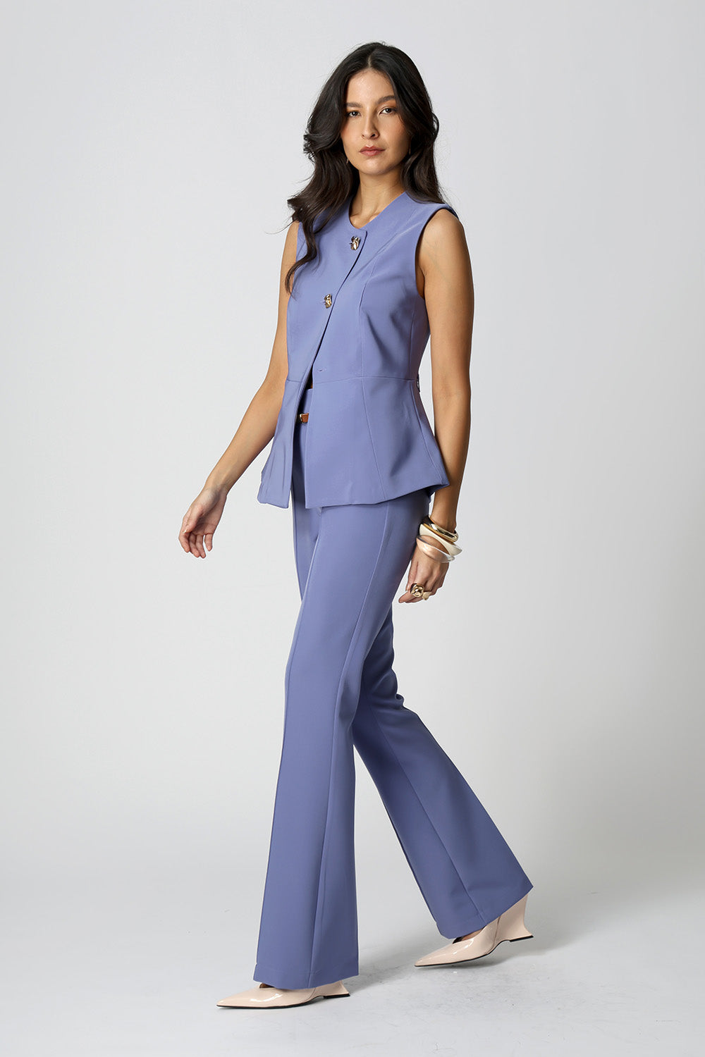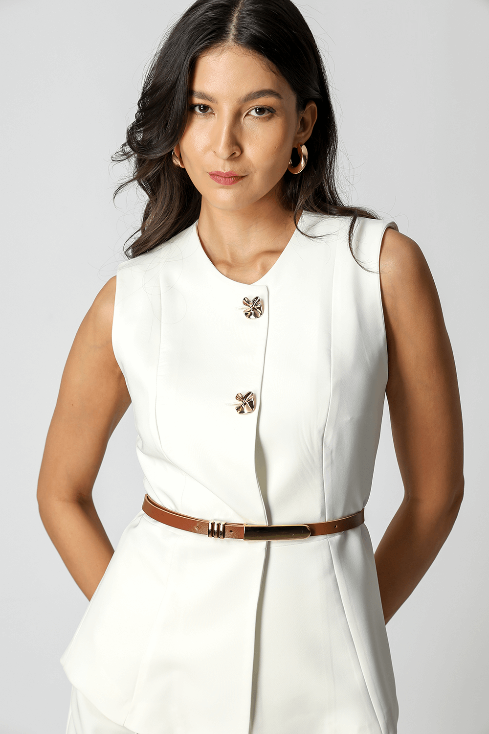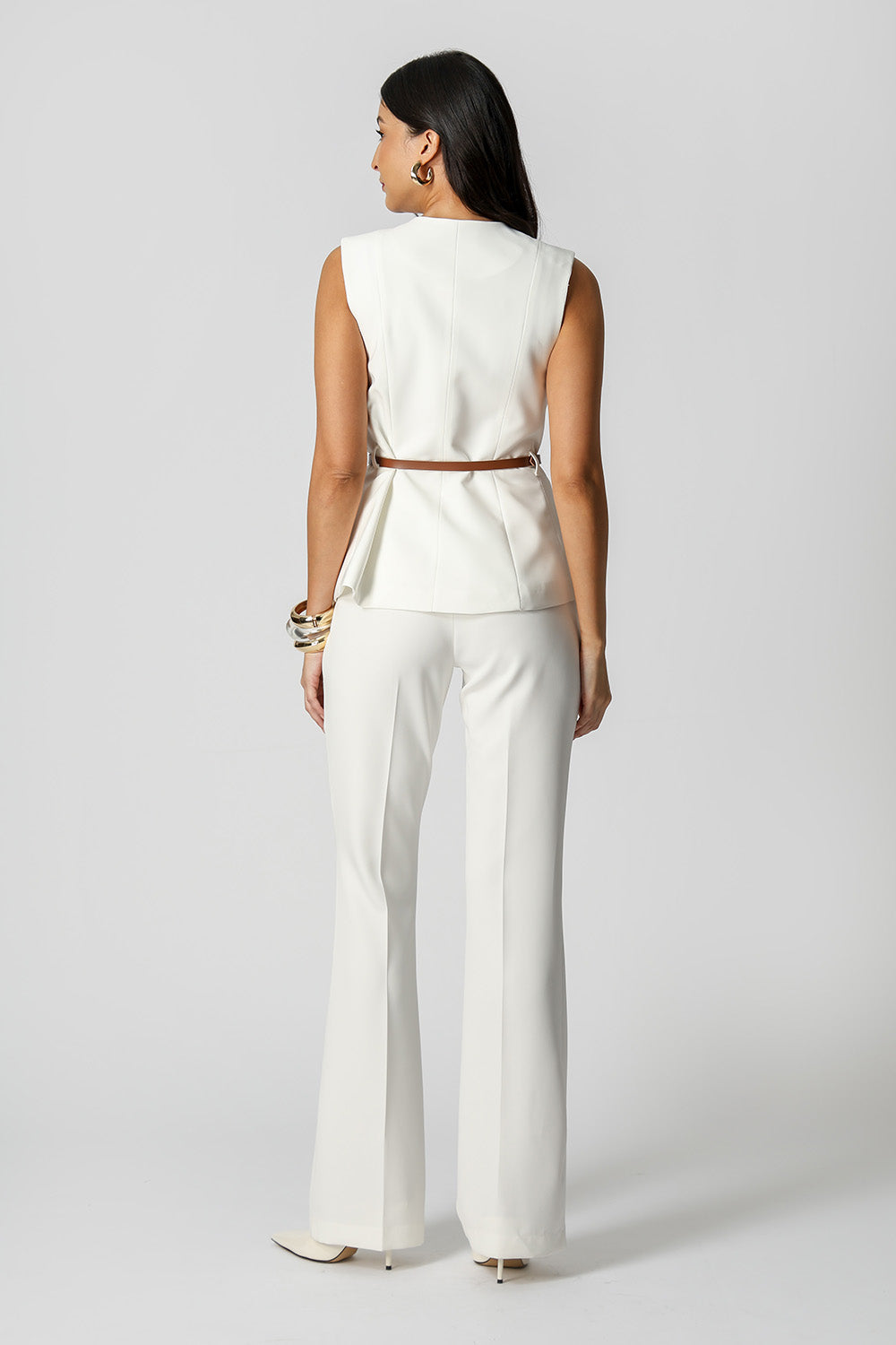 Blusa colete em tecido de alfaiataria com recortes que valorizam a silhueta. Modelo acinturado com fechamento frontal por 3 botões na parte superior, unindo elegância e modernidade em uma peça versátil.