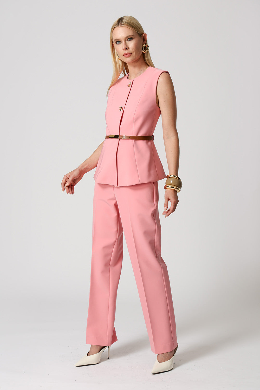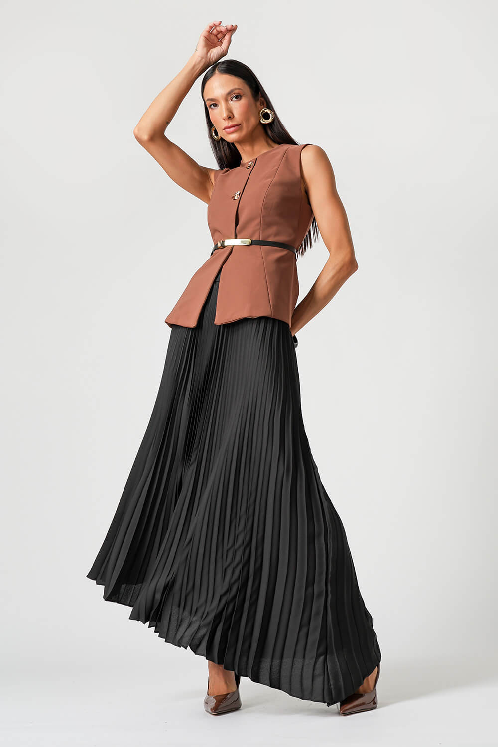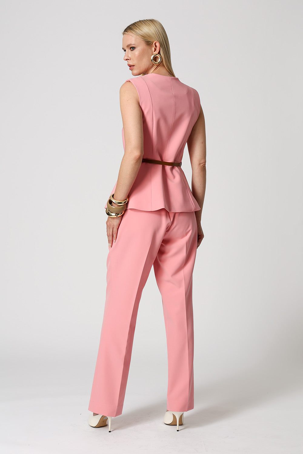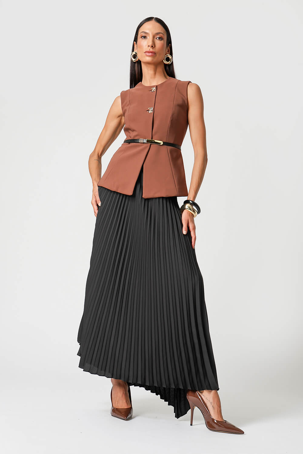 Blusa colete em tecido de alfaiataria com recortes que valorizam a silhueta. Modelo acinturado com fechamento frontal por 3 botões na parte superior, unindo elegância e modernidade em uma peça versátil.